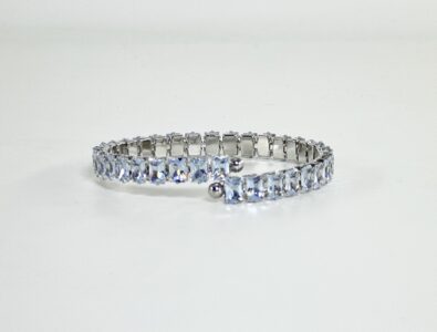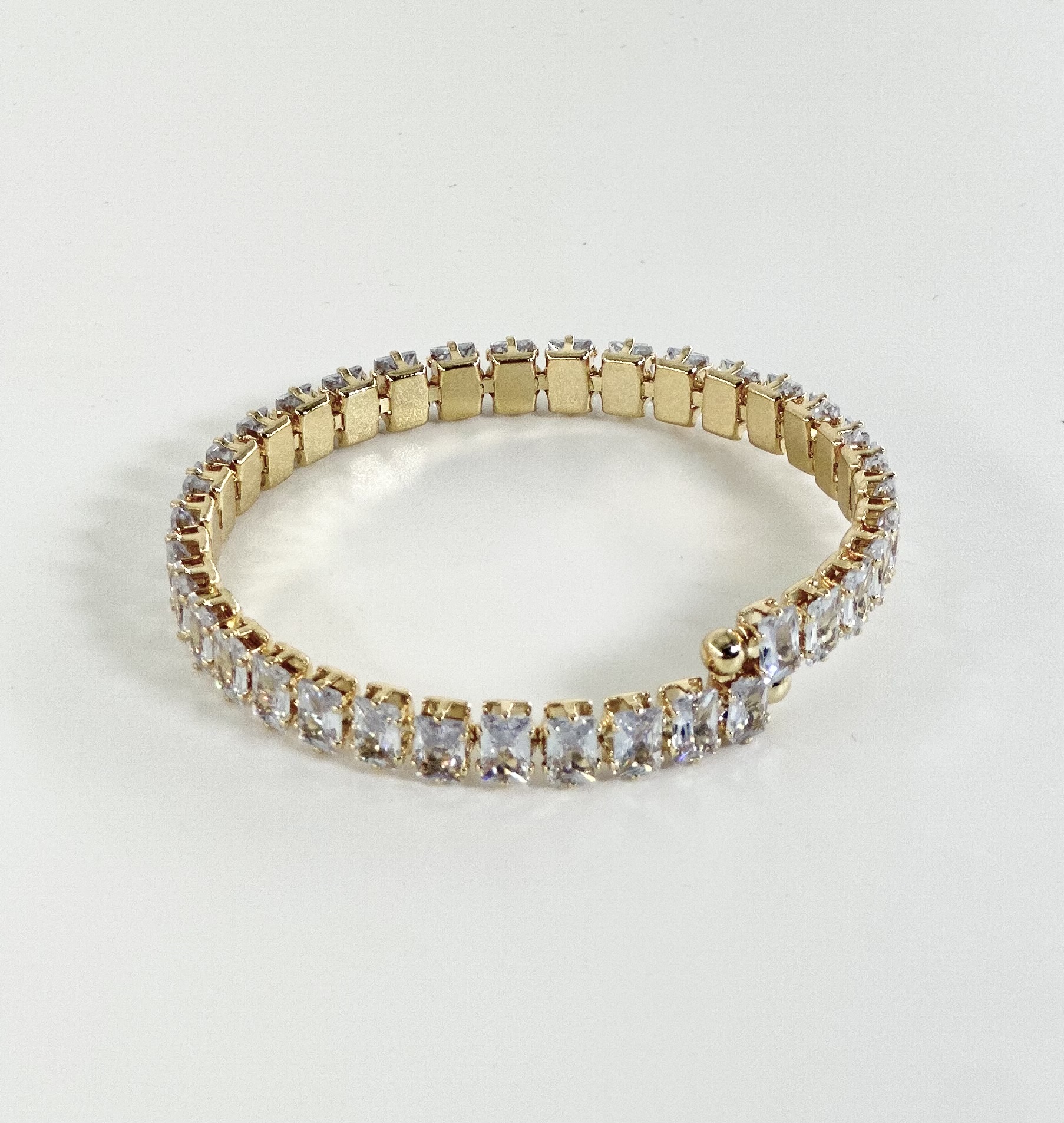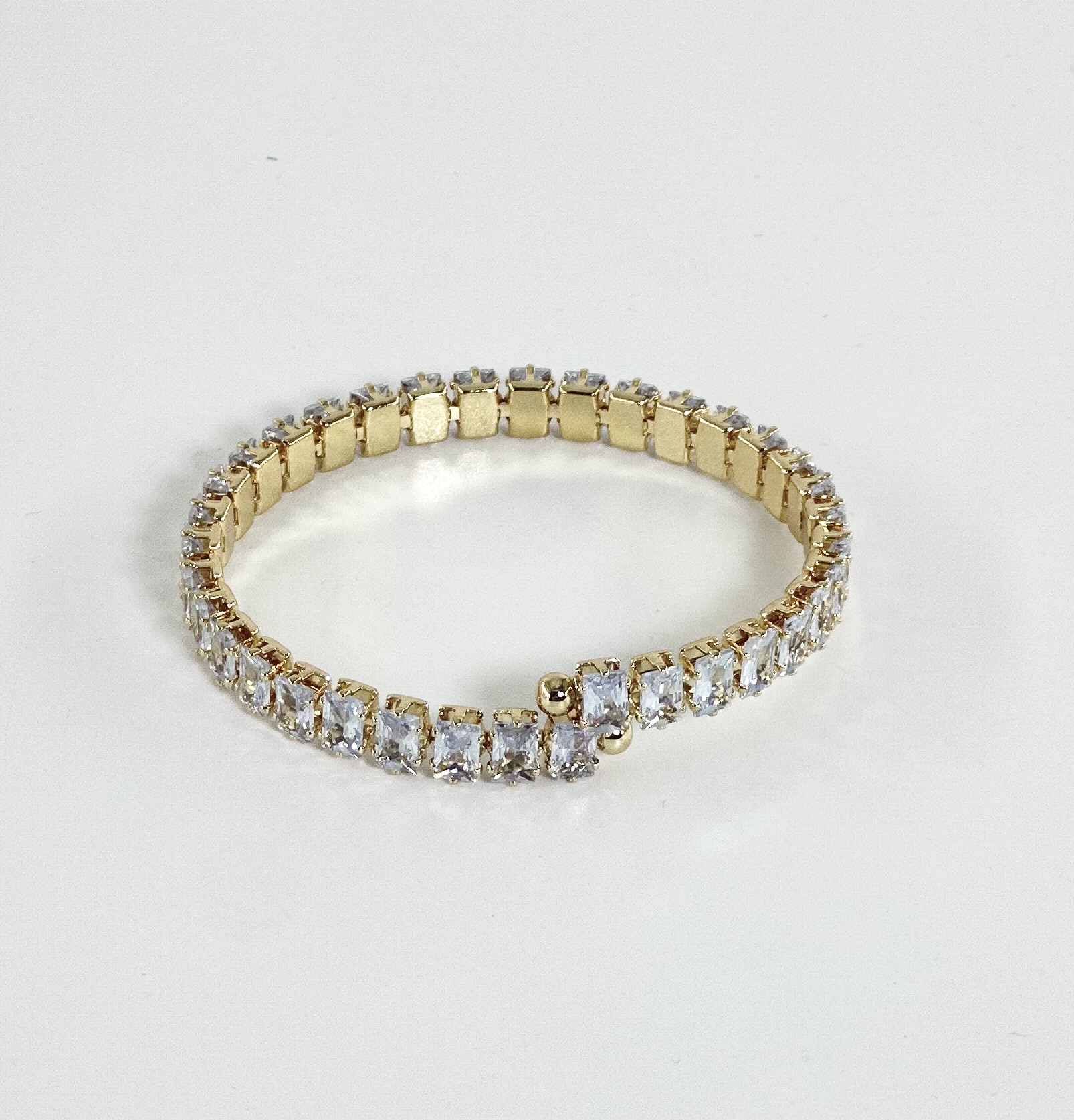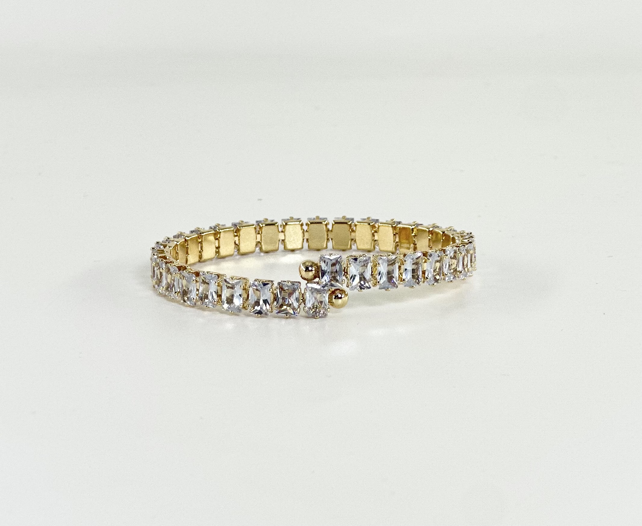 Χρυσό ατσάλινο ανοιχτό βραχιόλι τύπου cuff με γυαλιστερό φινίρισμα και ορθογώνιες λευκές πέτρες που λάμπουν