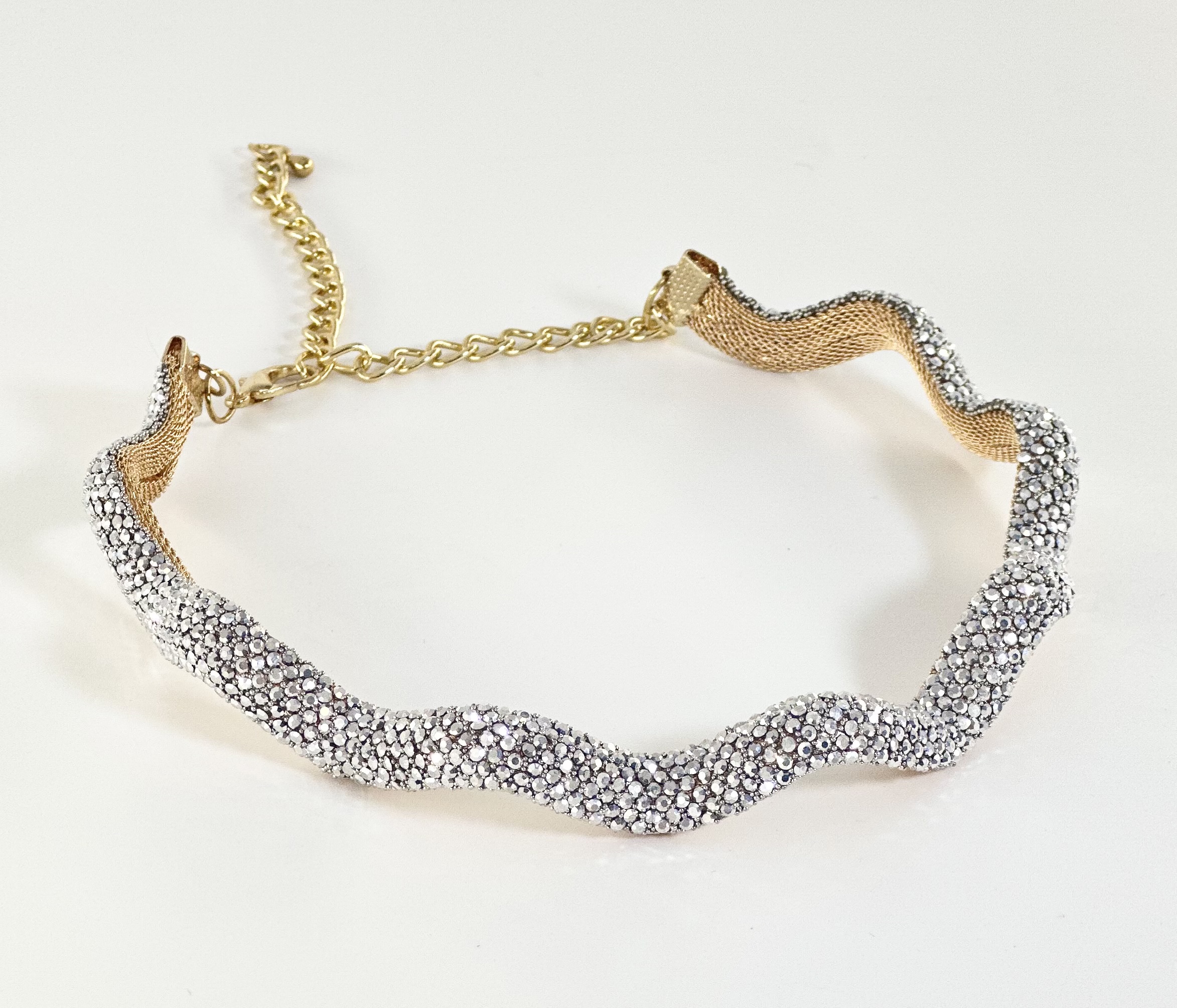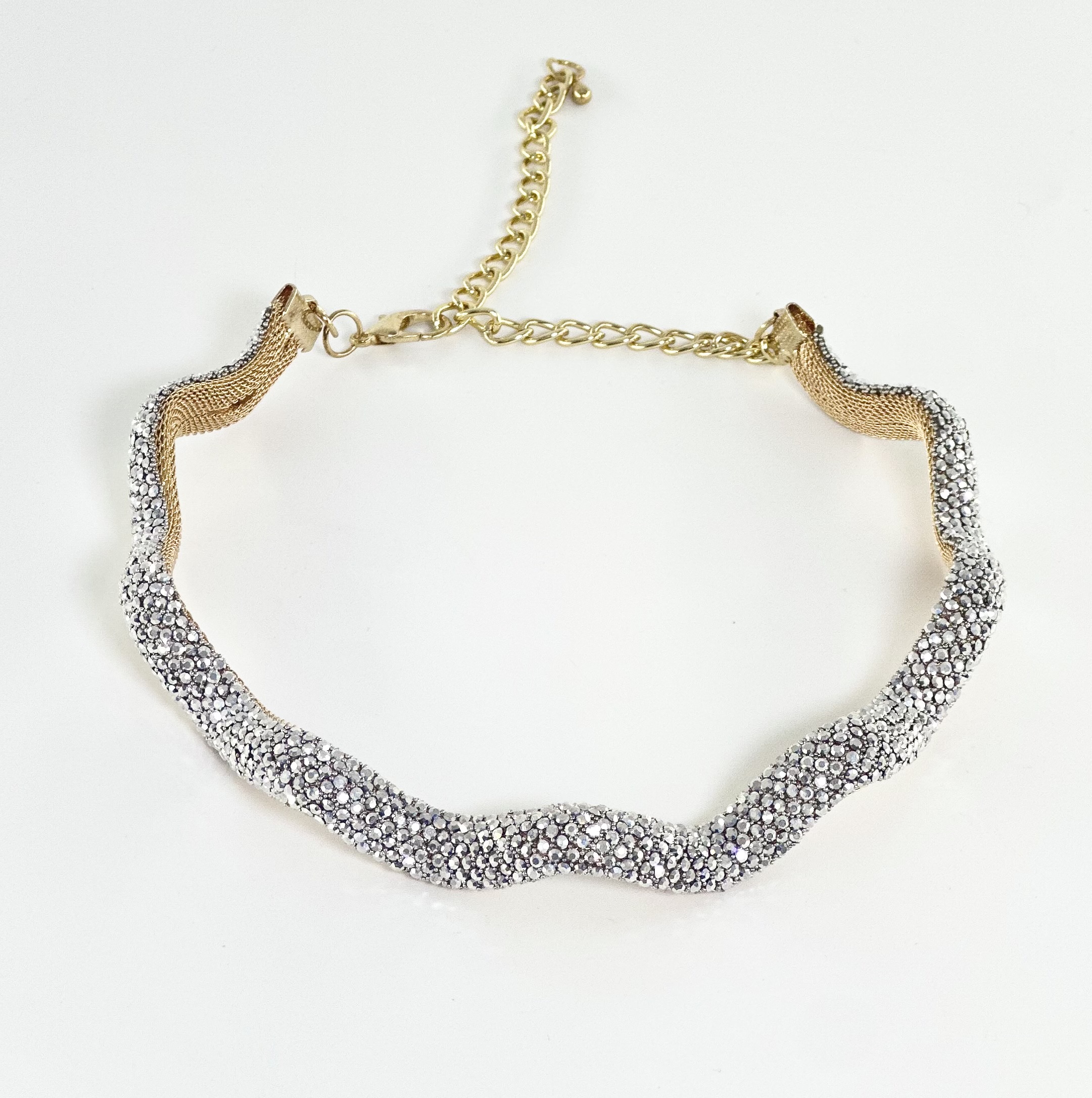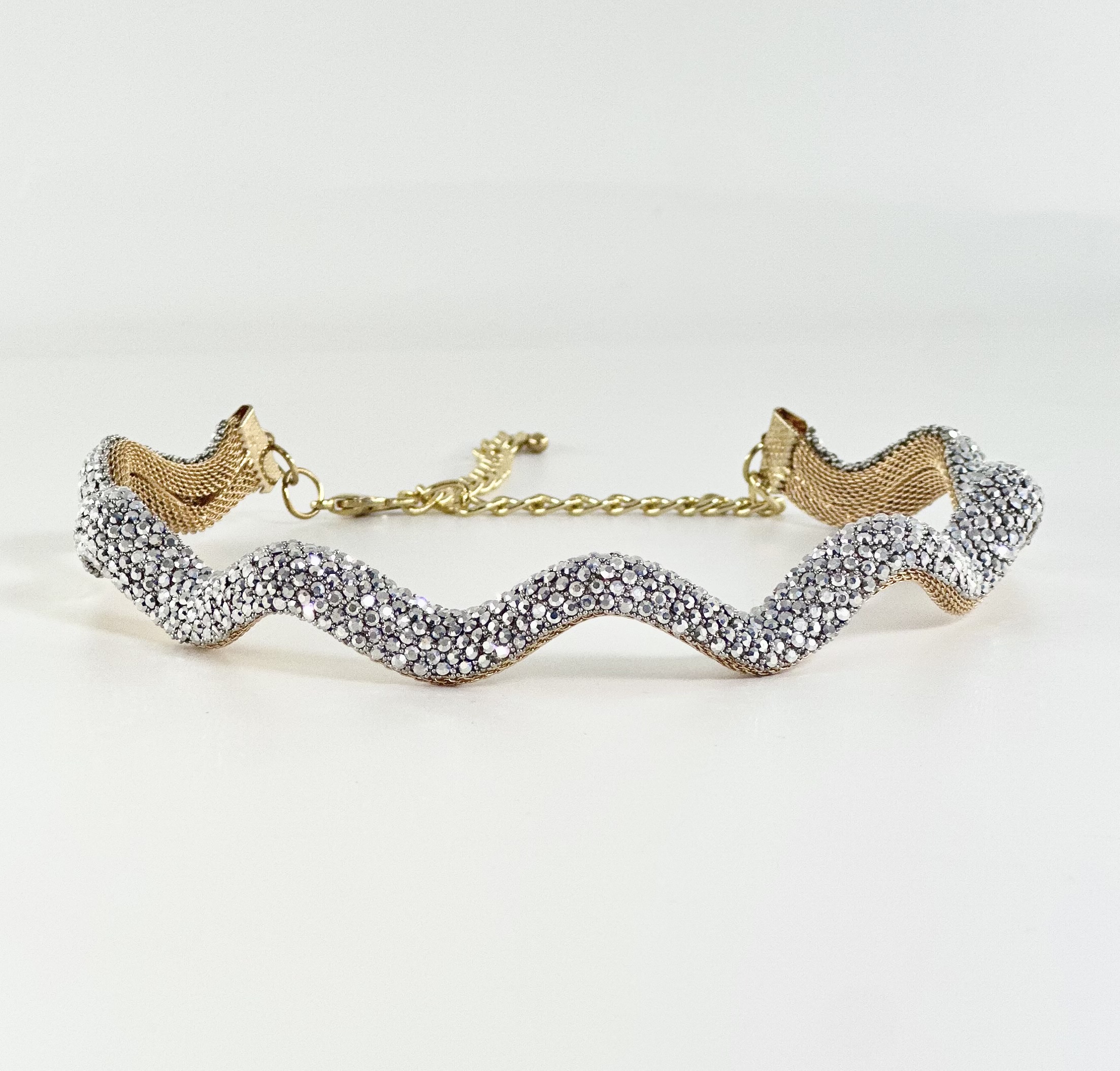Ένα λαμπερό choker που η μπροστινή όψη του είναι καλυμμένη με αμέτρητα λαμπερά στρας και η βάση του είναι σε χρυσό μεταλλικό πλέγμα