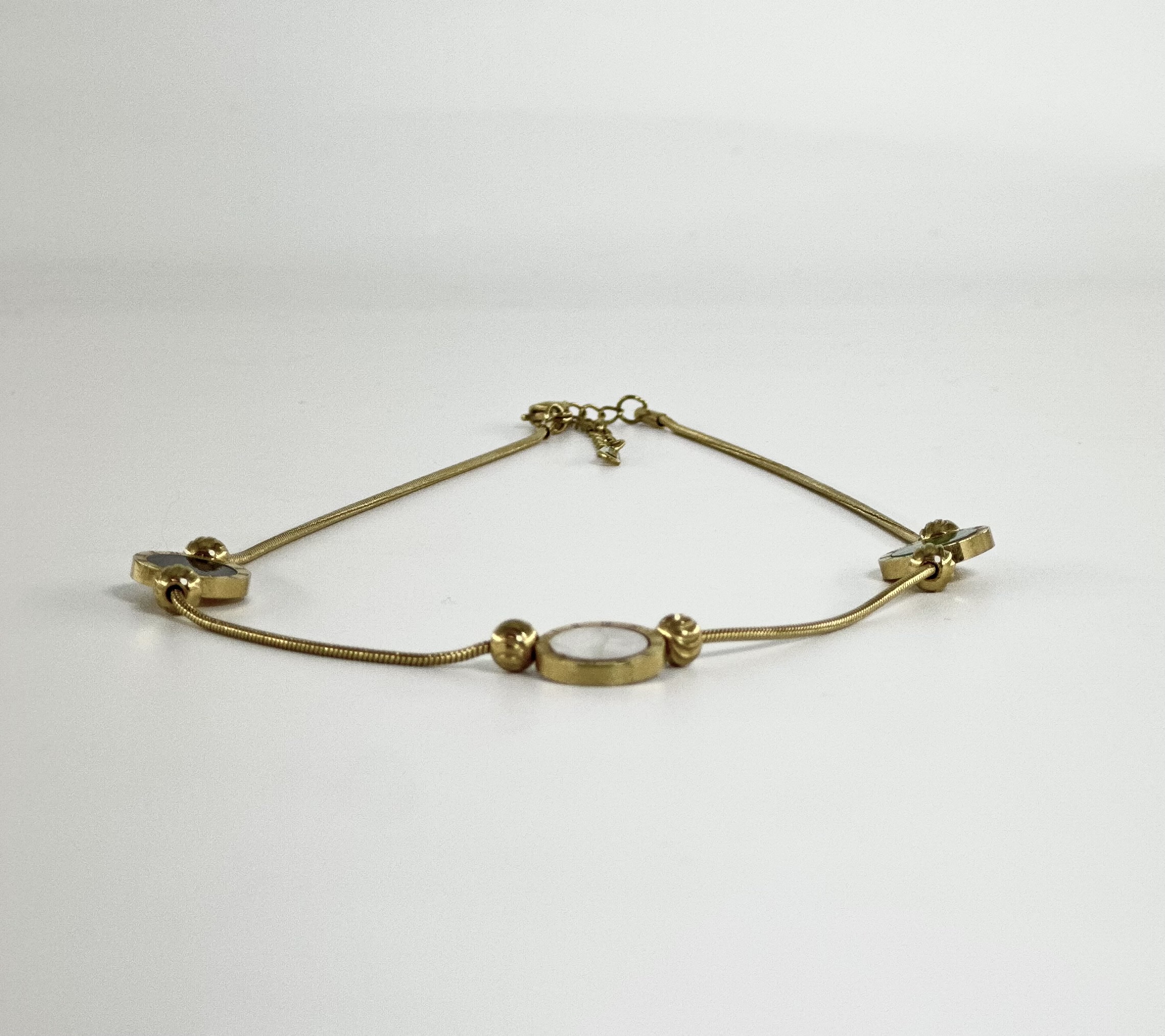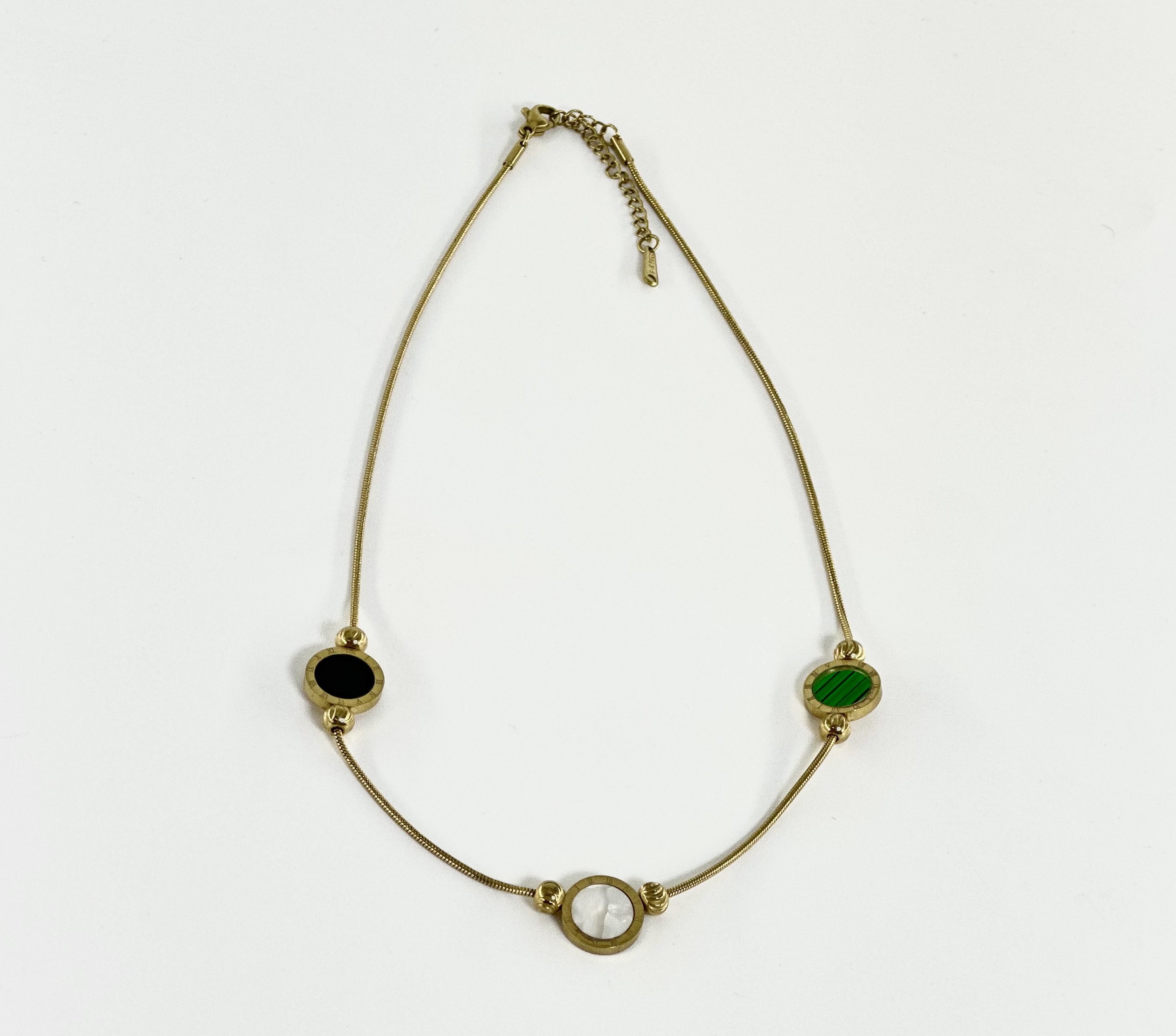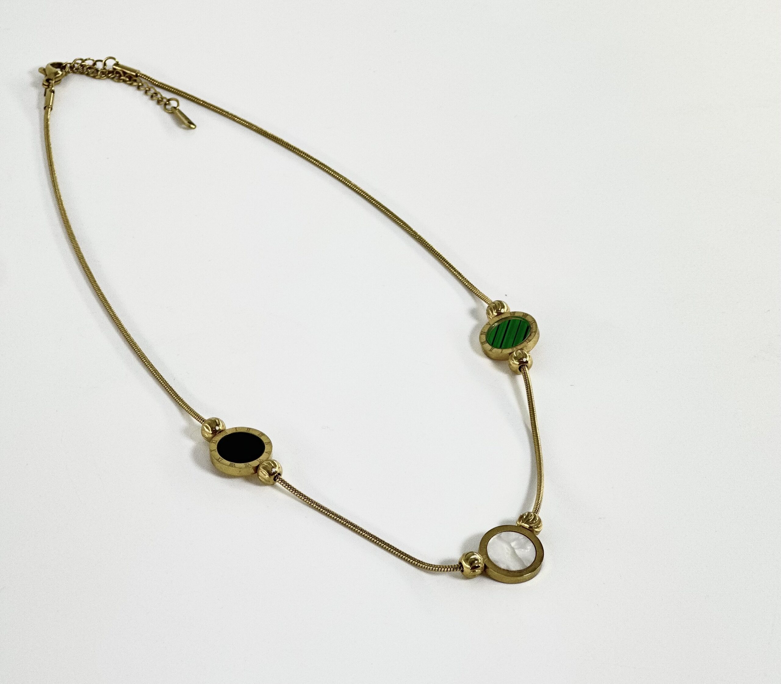 Απόχρωση: Χρυσή αλυσίδα με τρία στρόγγυλα στοιχεία από χρυσό πλαίσιο και μαύρη πράσινη και λευκή επιφάνεια αντίστοιχα