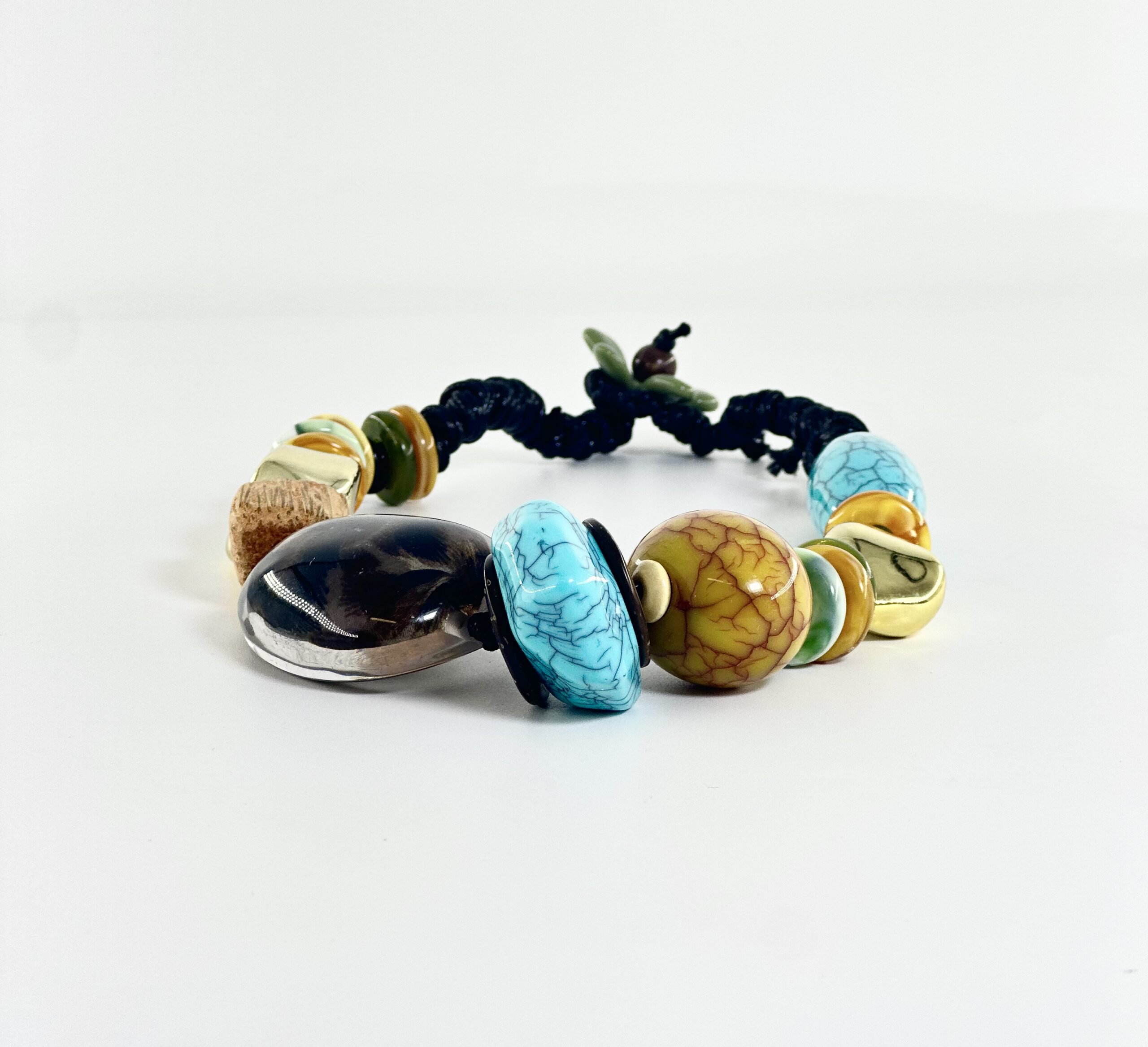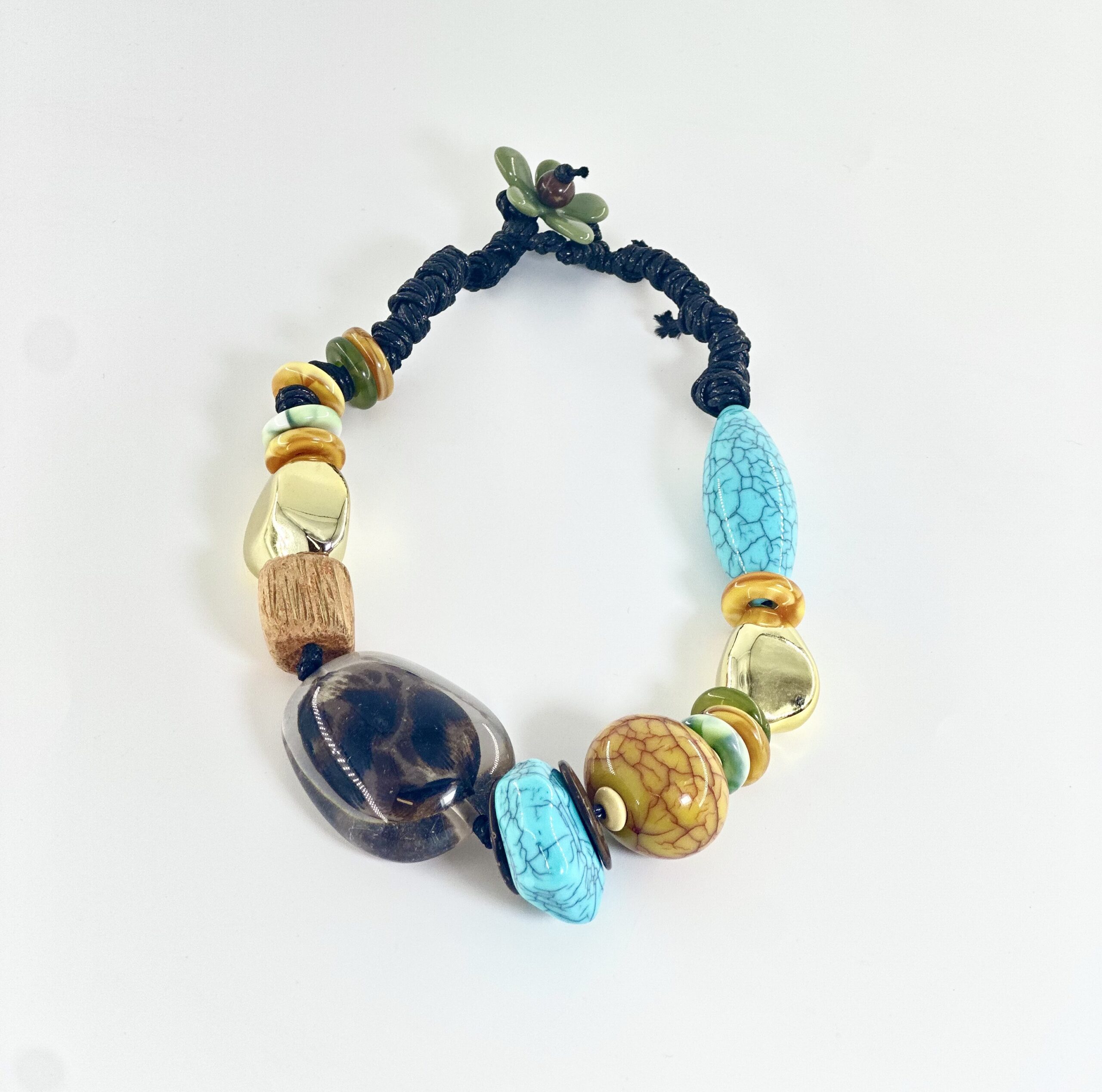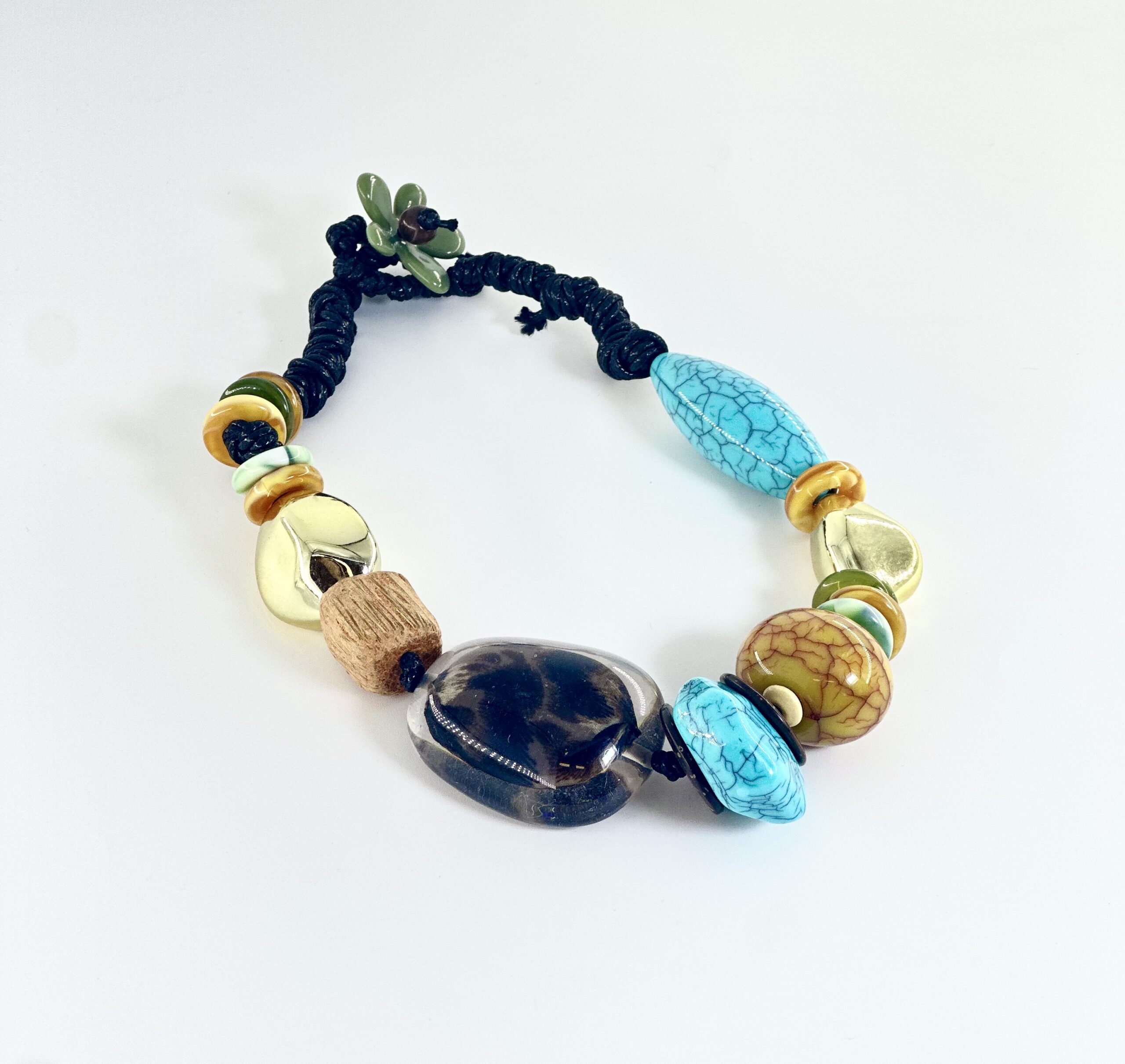 Ένα ιδιαίτερο κολιέ από μεγάλες διαφορετικές χάντρες με διάφανη και γυαλιστερή υφή, σε χρώματα τιρκουάζ με νερά, κίτρινο-καφέ με “σπασμένο” σχέδιο σε όλη την επιφάνεια, ένα ξύλινο στοιχείο και μεταλλικά στοιχεία.