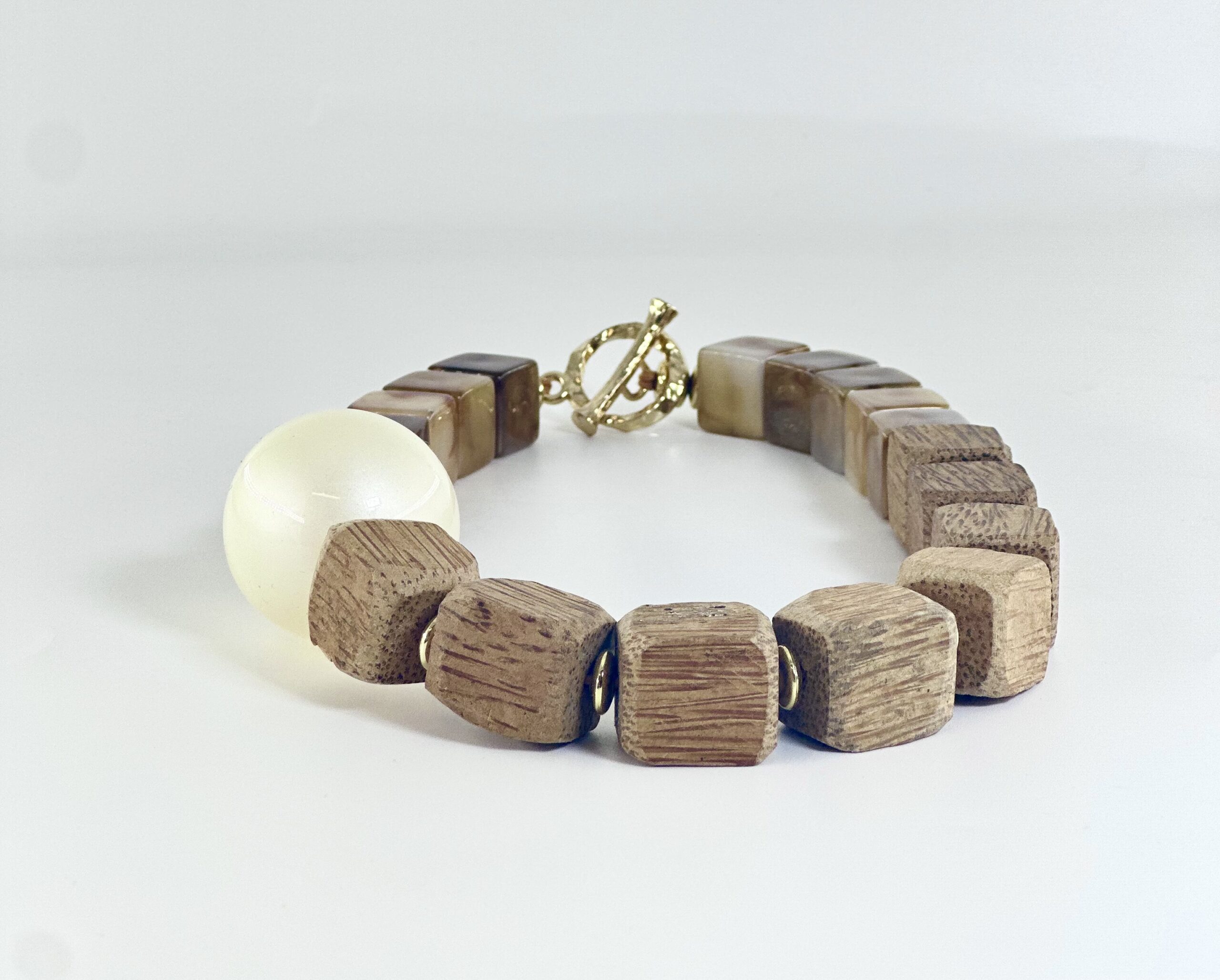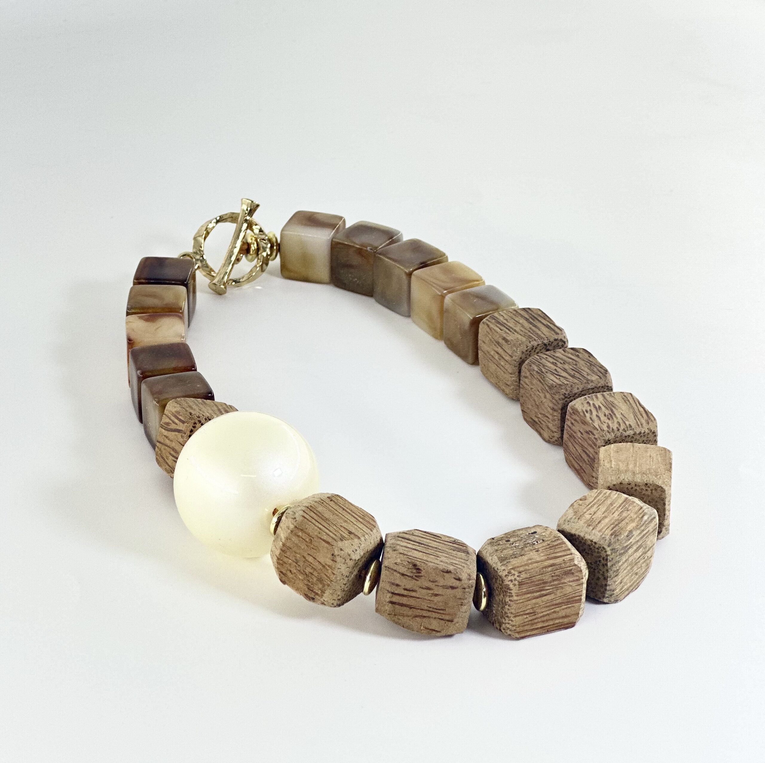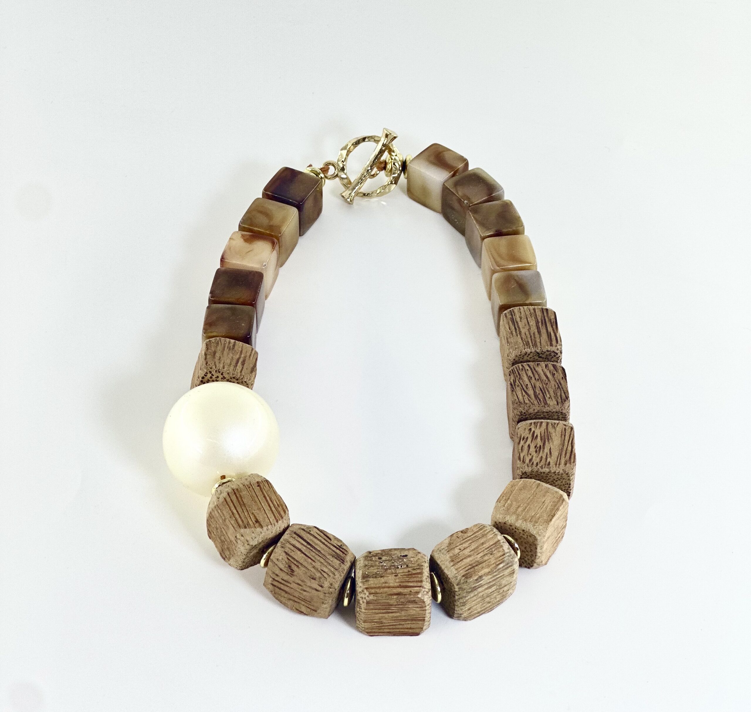 Ένα ethnik/boho κολιέ από ξύλινες χάντρες με φυσικά νερά σε καφέ/μπεζ αποχρώσεις.