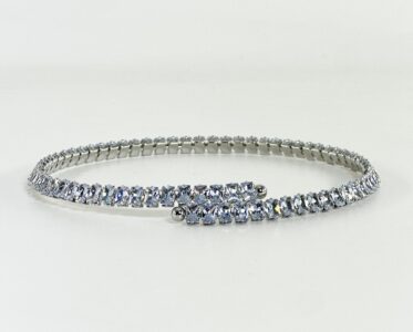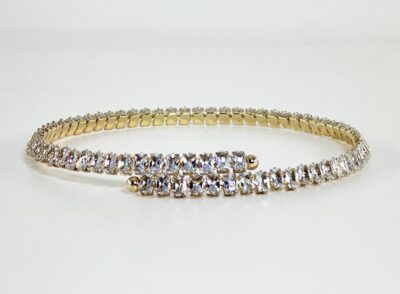Χρυσό ατσάλινο ελαστικό κολιέ τύπου choker, με λαμπερό φινίρισμα, που αποτελείται από σειρά λευκών λαμπερών κρυστάλλων με ορθογώνια κοπή, που στο κέντρο ενώνονται και σχηματίζουν διπλή γραμμή.