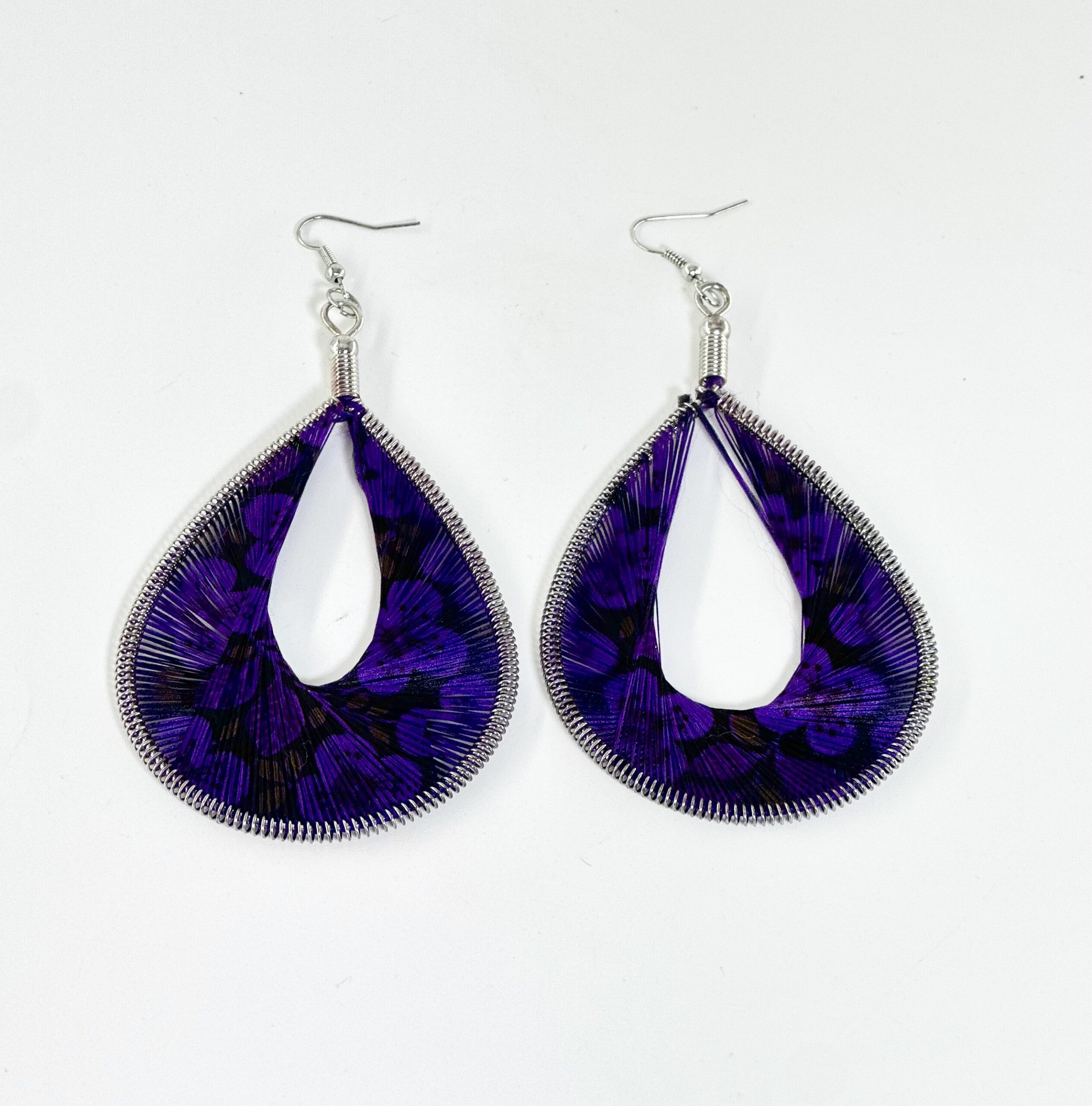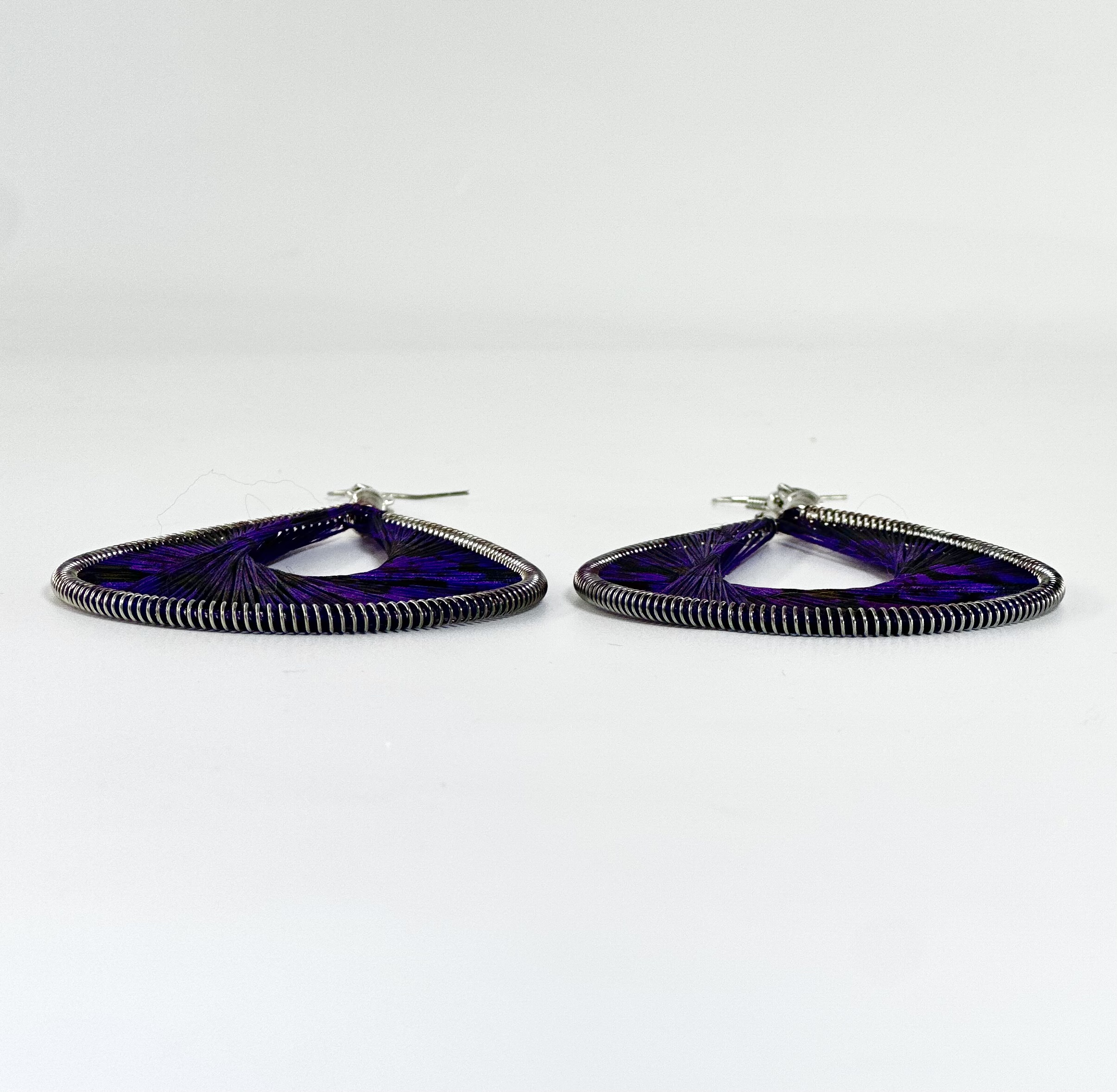 Το σχέδιο είναι φτιαγμένο με λεπτές μεταλλικές κλωστές σε έντονο μωβ χρώμα με μαύρες πινελιές, δημιουργώντας γεωμετρικό και λουλουδάτο μοτίβο.