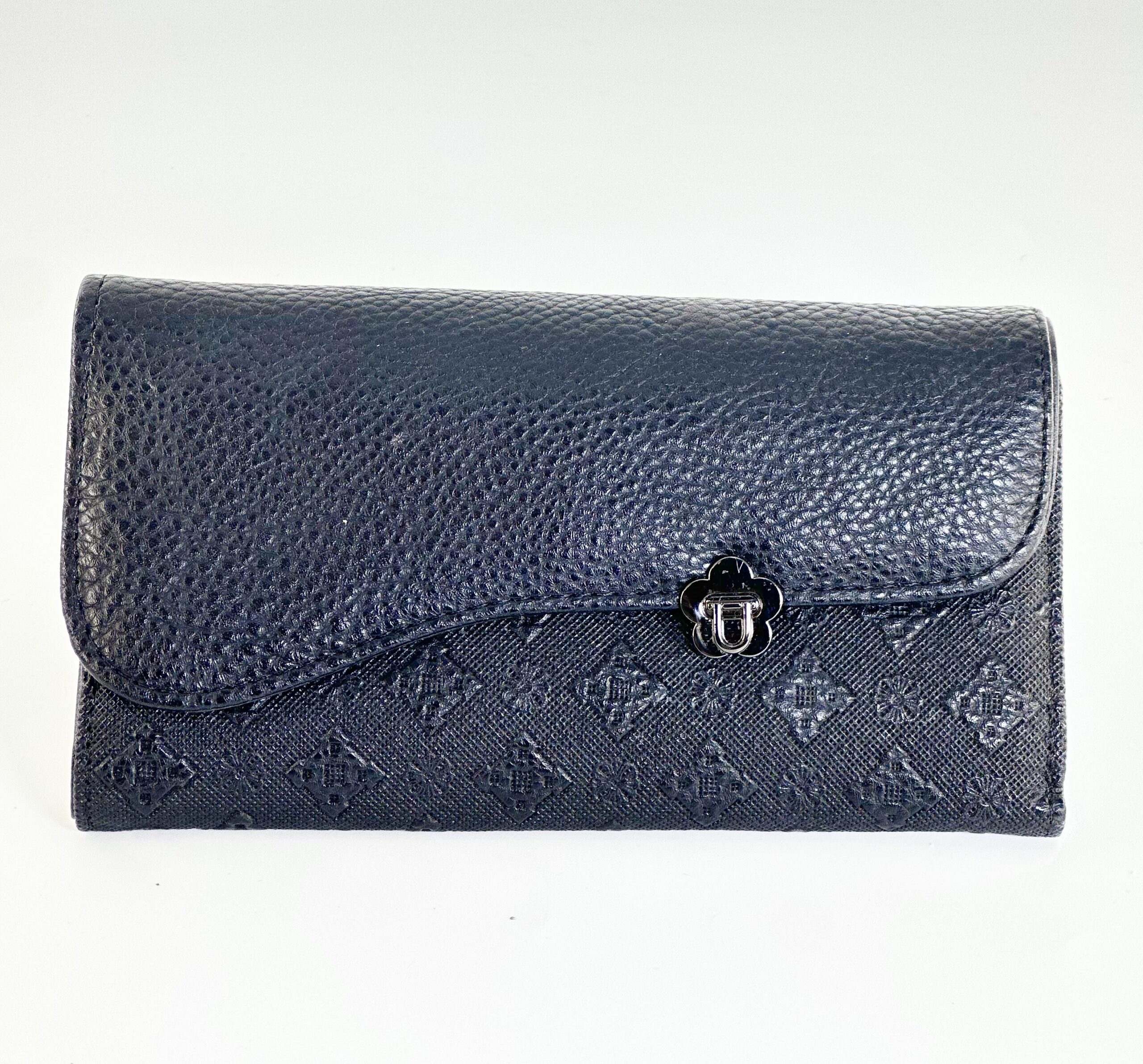 Το πορτοφόλι κλείνει με μεταλλικό κούμπωμα σε σχήμα λουλουδιού, στολισμένο με ένα μικρό γράμμα “U” στο κέντρο — μια λεπτομέρεια που του χαρίζει κομψότητα.