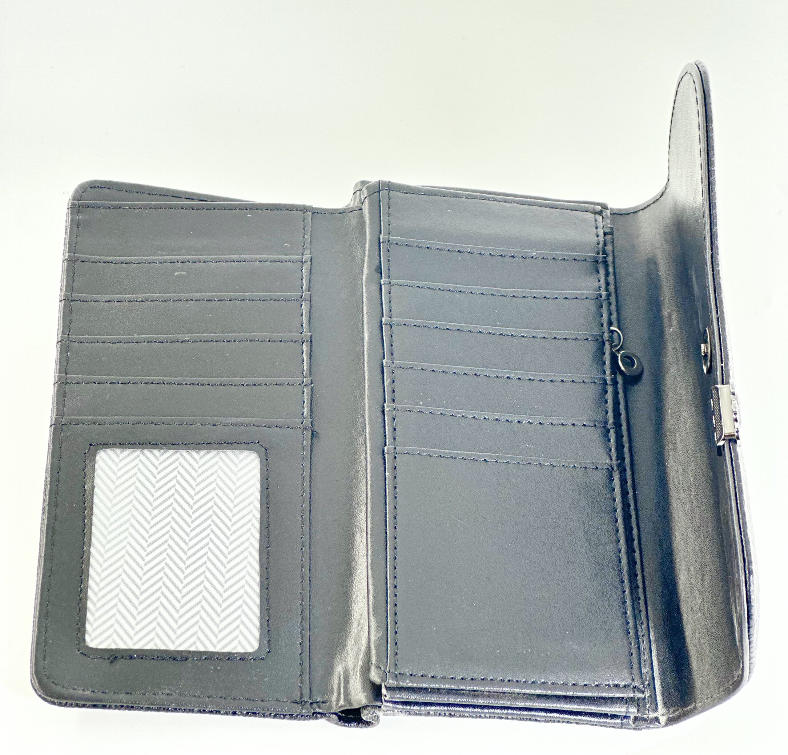 Το εσωτερικό του πιθανότατα περιλαμβάνει πολλές θήκες για κάρτες, χαρτονομίσματα και κέρματα, προσφέροντας πρακτικότητα και οργάνωση.
