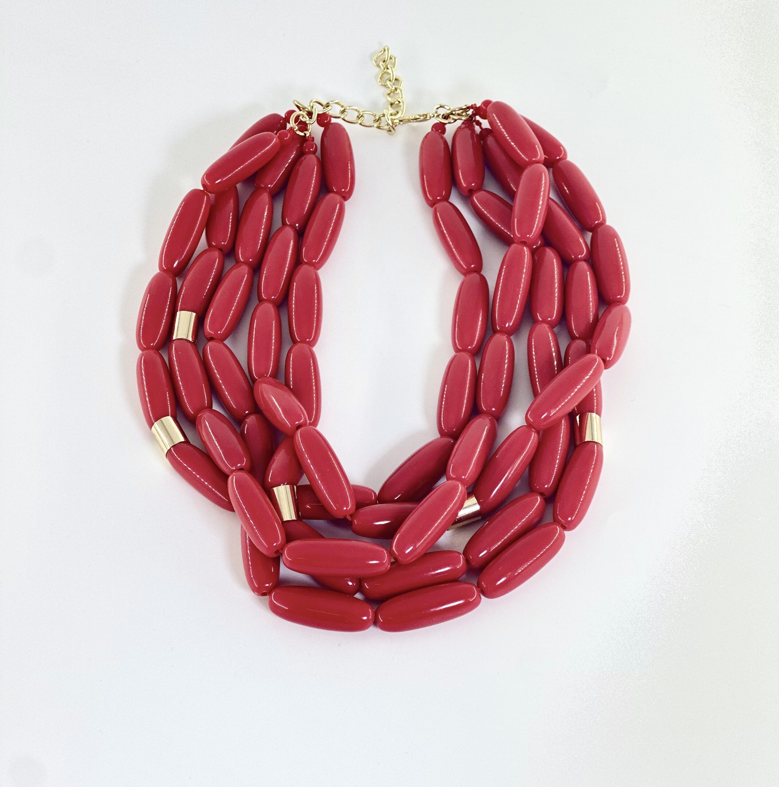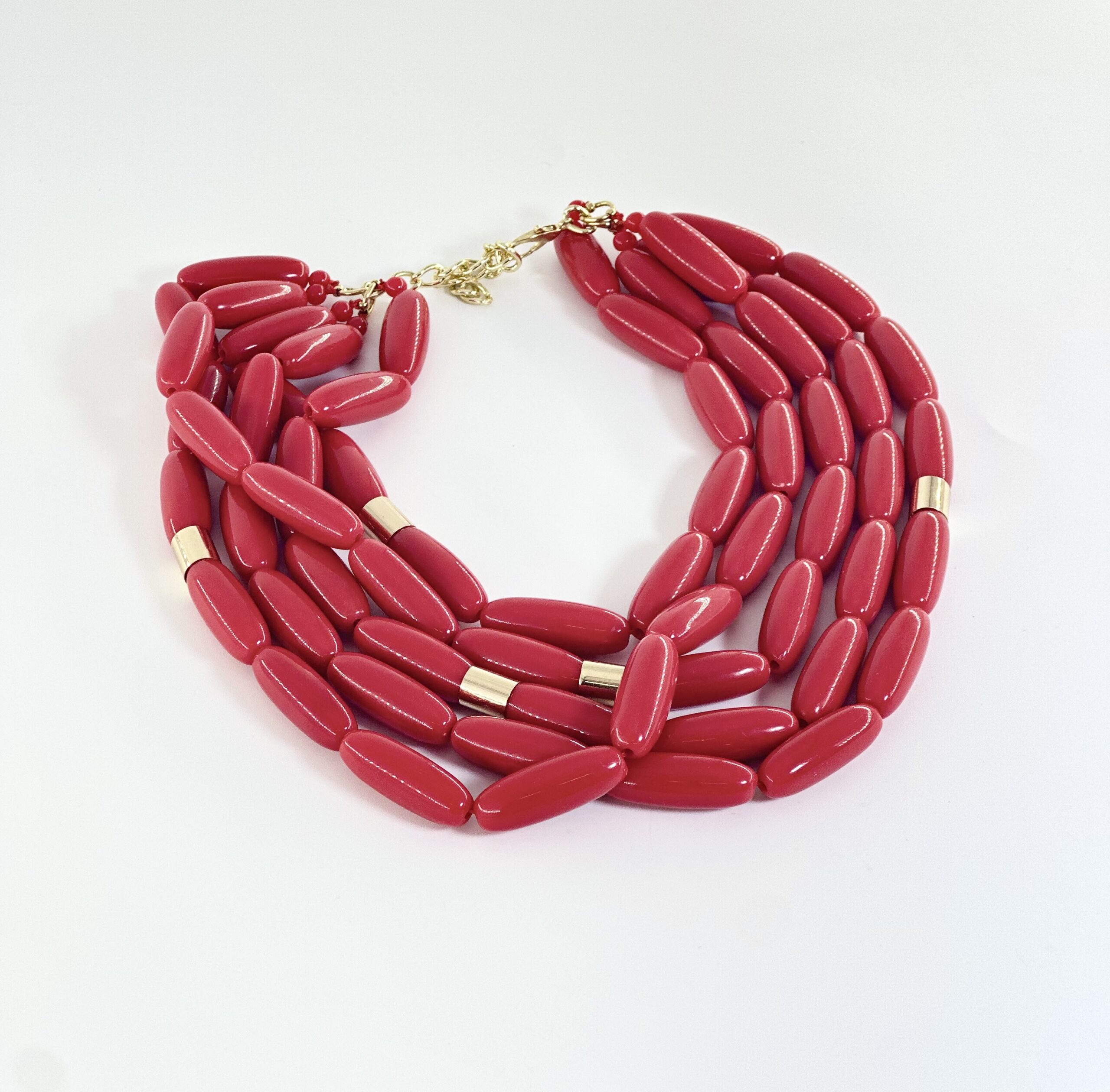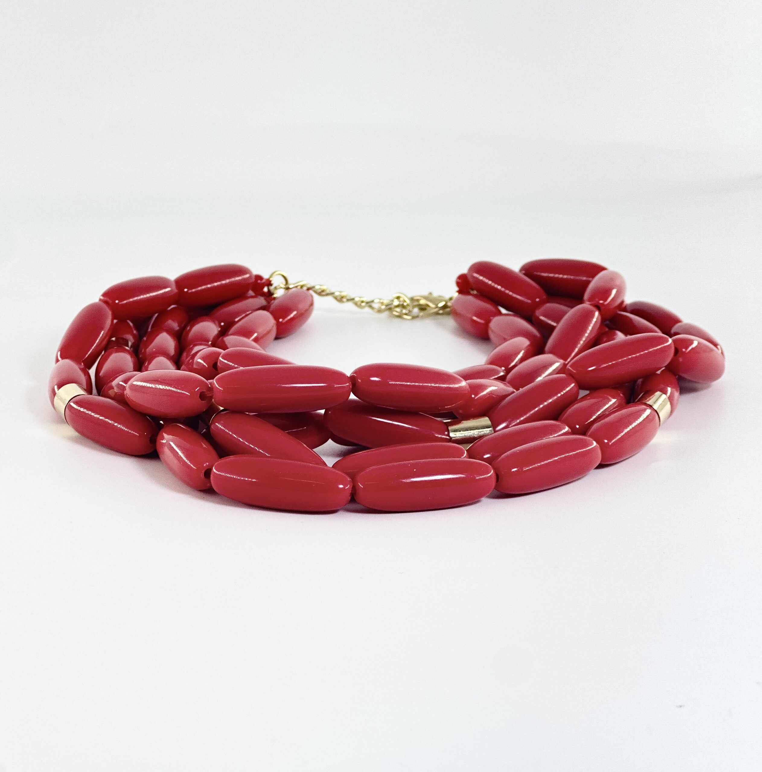 Αποτελείται από πολλές σειρές μακριών οβάλ χαντρών και ενδιάμεσα παρεμβάλλονται μεταλλικά χρυσά κυλινδρικά στοιχεία.