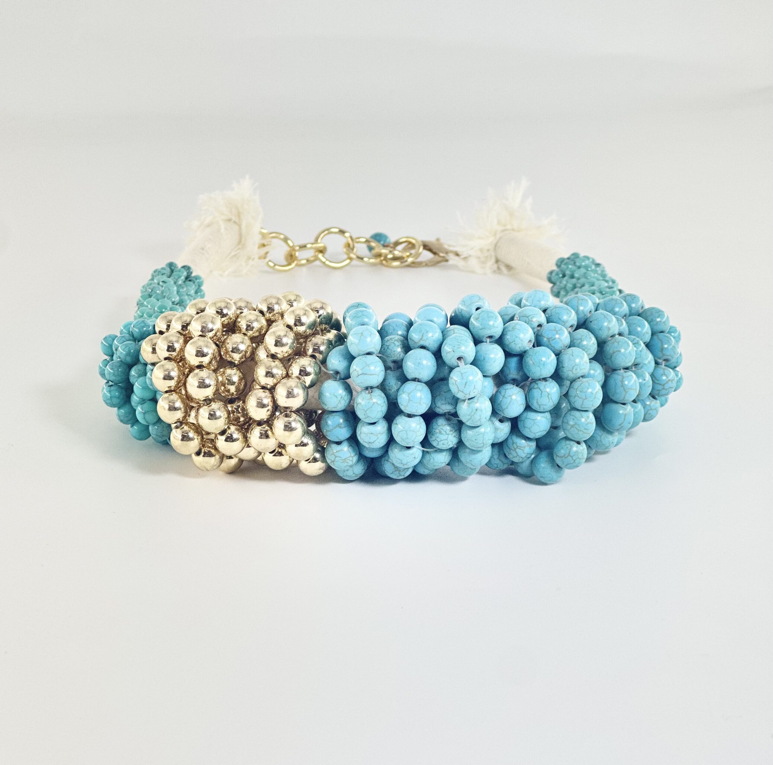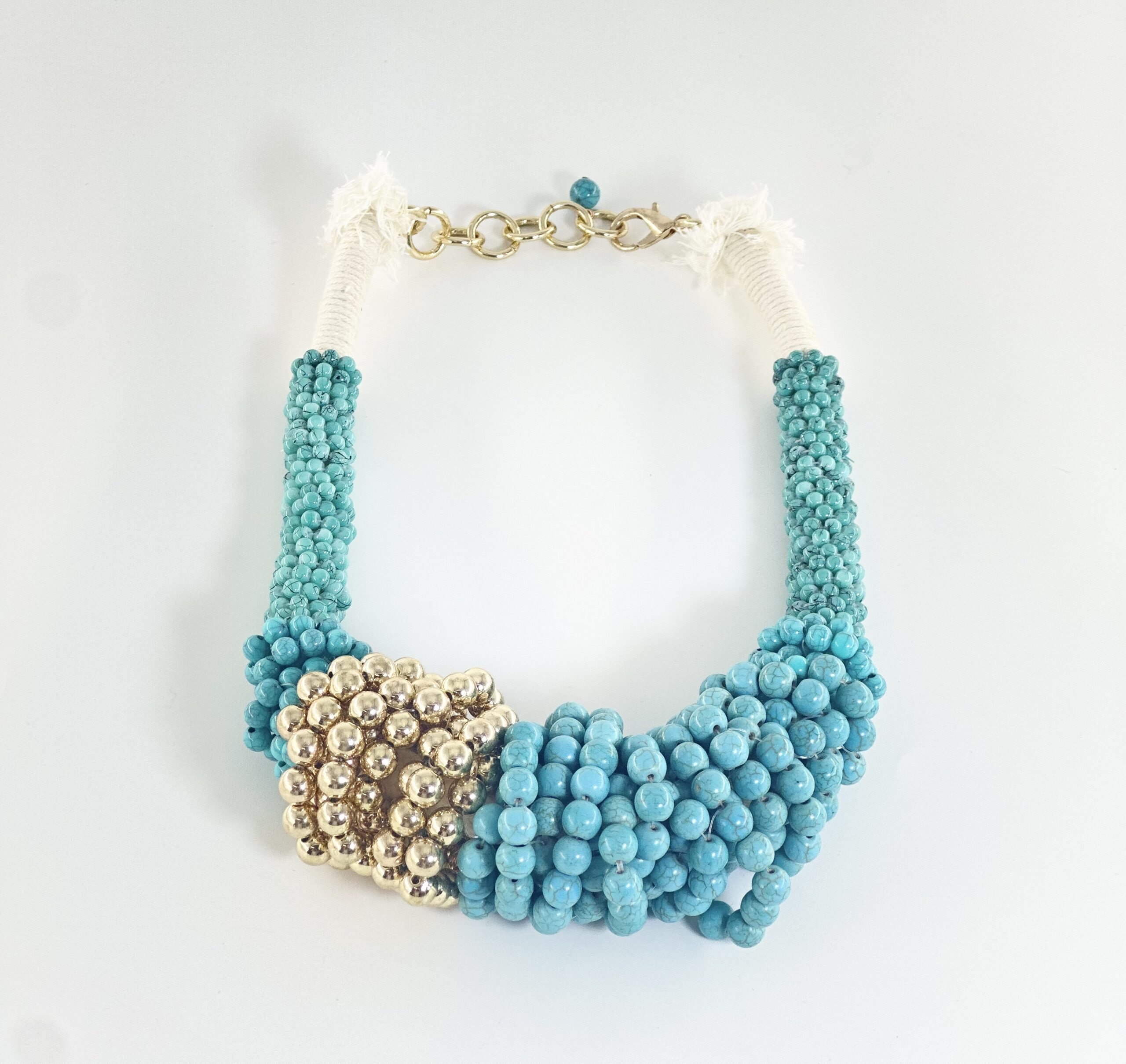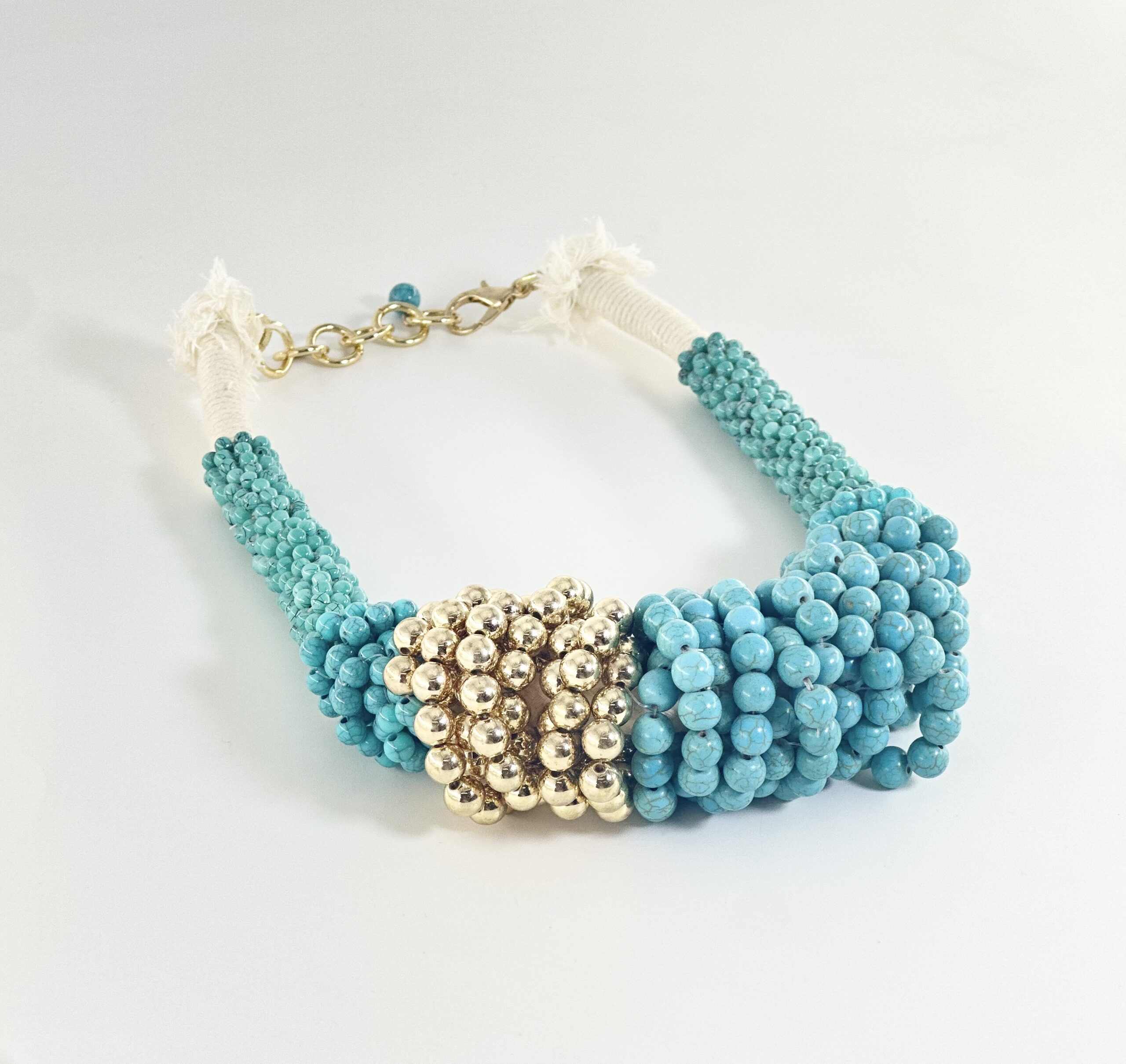 Κολιέ φτιαγμένο από πολλές σειρές μικρών τιρκουάζ χαντρών που ενώνονται σε πλεγμένο σχηματισμό.