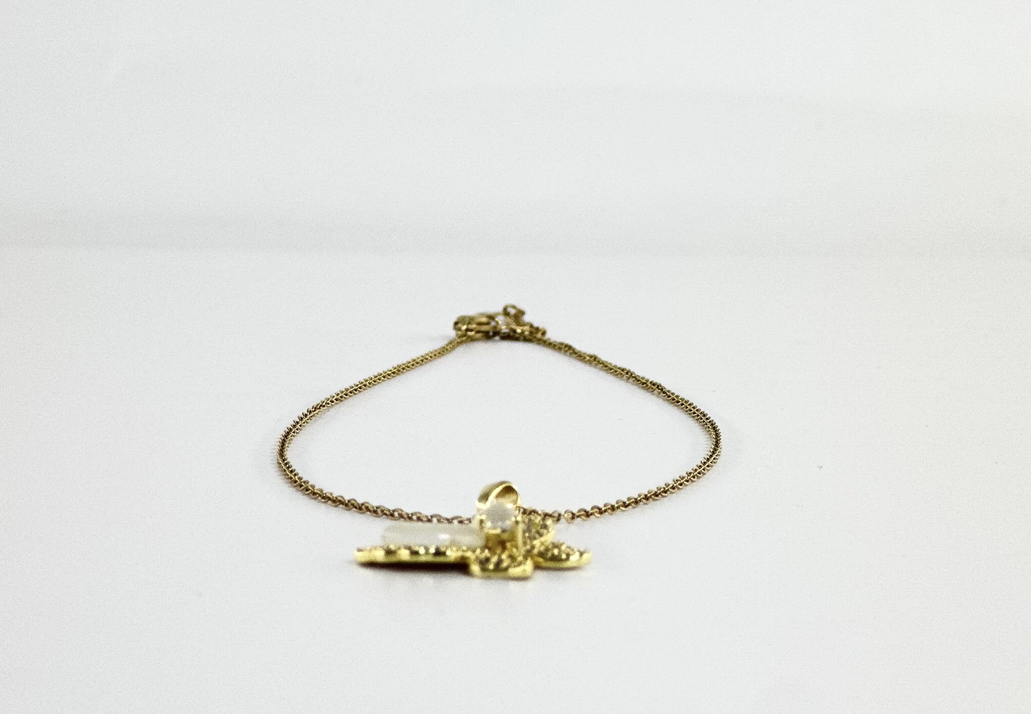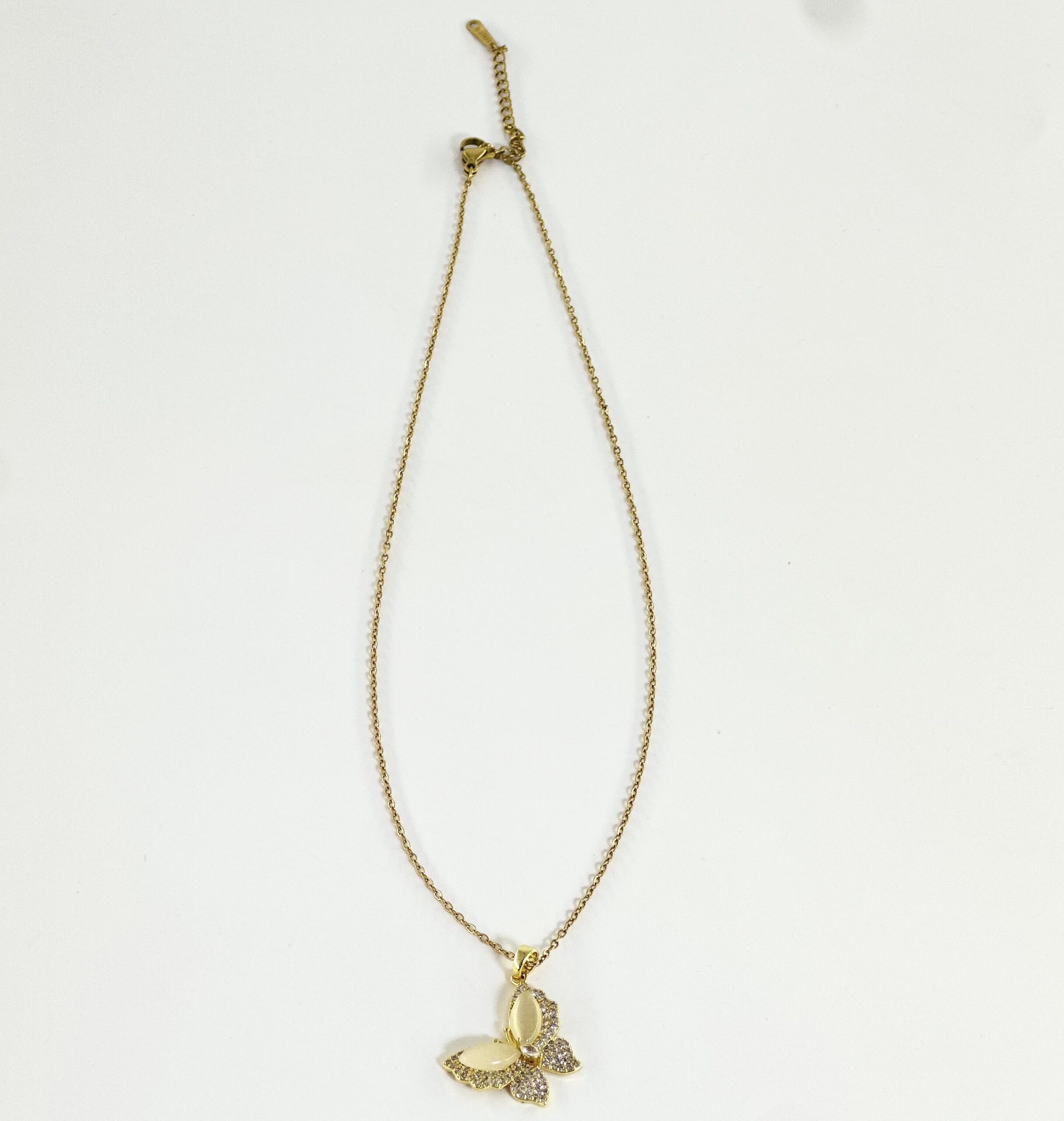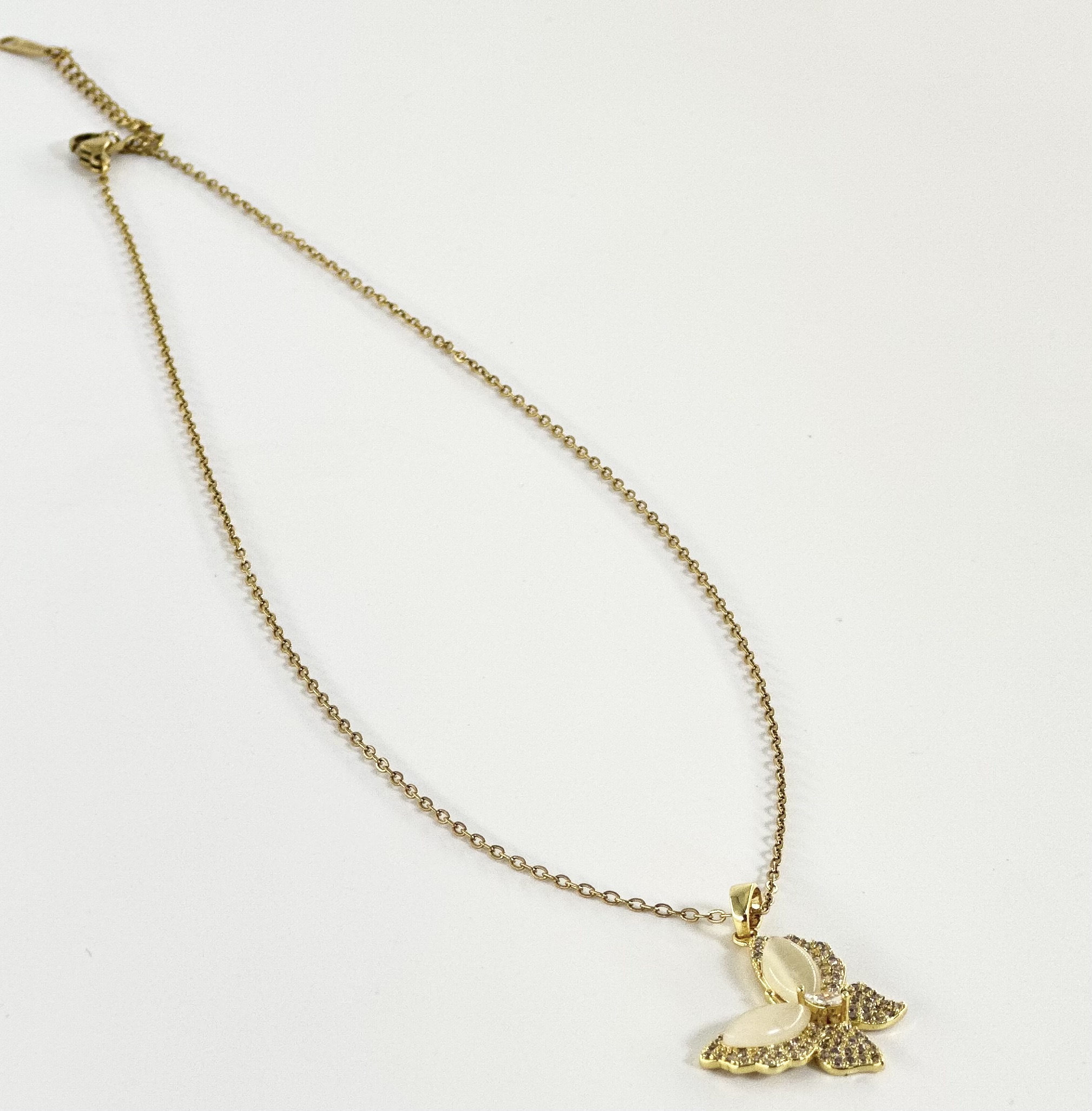 Κολιέ με λεπτή χρυσή αλυσίδα και ένα εντυπωσιακό μενταγιόν σε σχήμα πεταλούδας. Η βάση της πεταλούδας είναι χρυσή και η πεταλούδα διακοσμημένη με περλέ λεπτομέρειες στα φτερά, ενώ οι υπόλοιπες επιφάνειες είναι στολισμένες με μικρές λαμπερές πέτρες