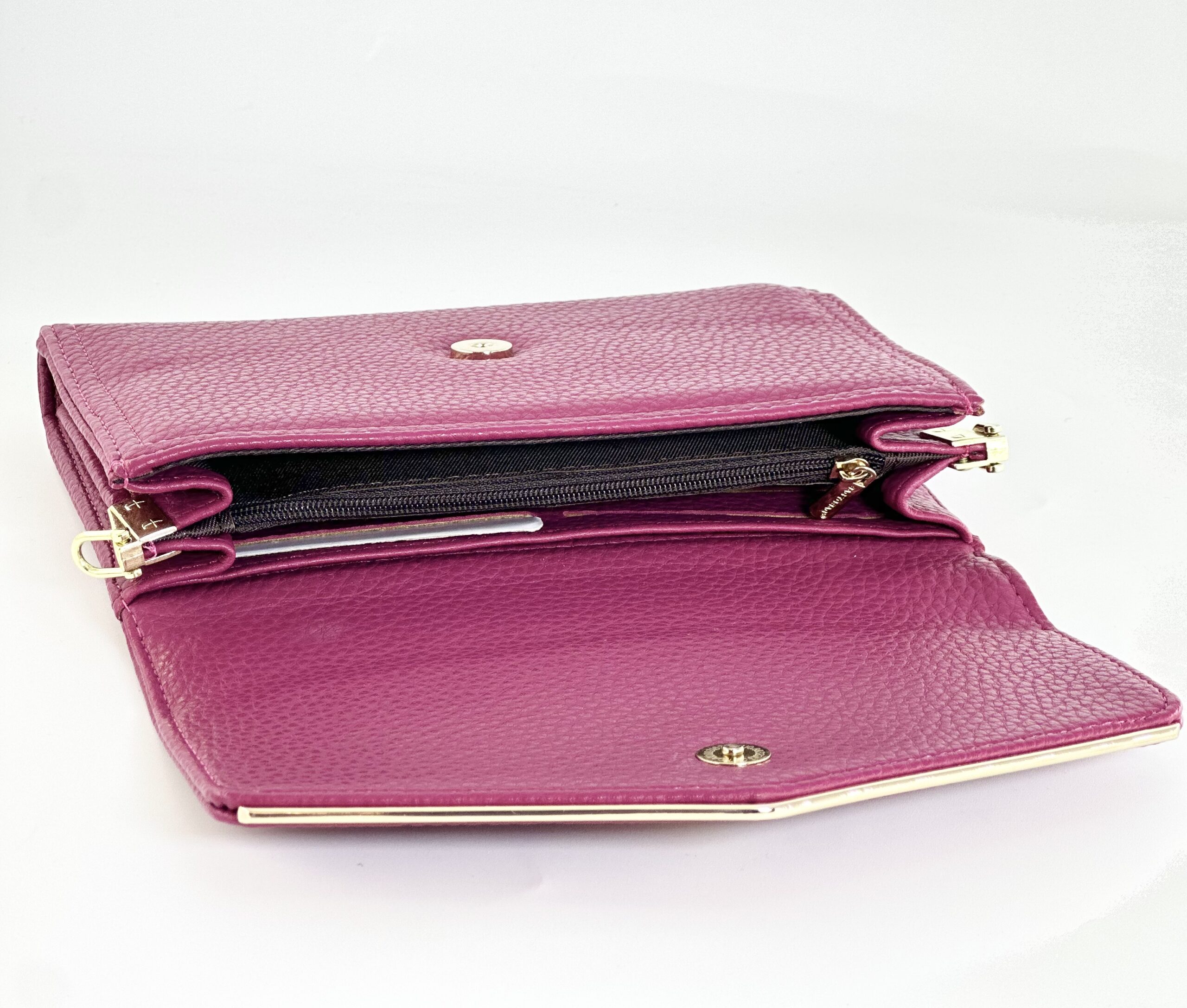 Το εσωτερικό είναι ευρύχωρο, με πολλές θήκες για κάρτες, χαρτονομίσματα και ψιλά, ενώ μπορεί να χωρέσει και μικρά προσωπικά αντικείμενα όπως κινητό ή κλειδιά.