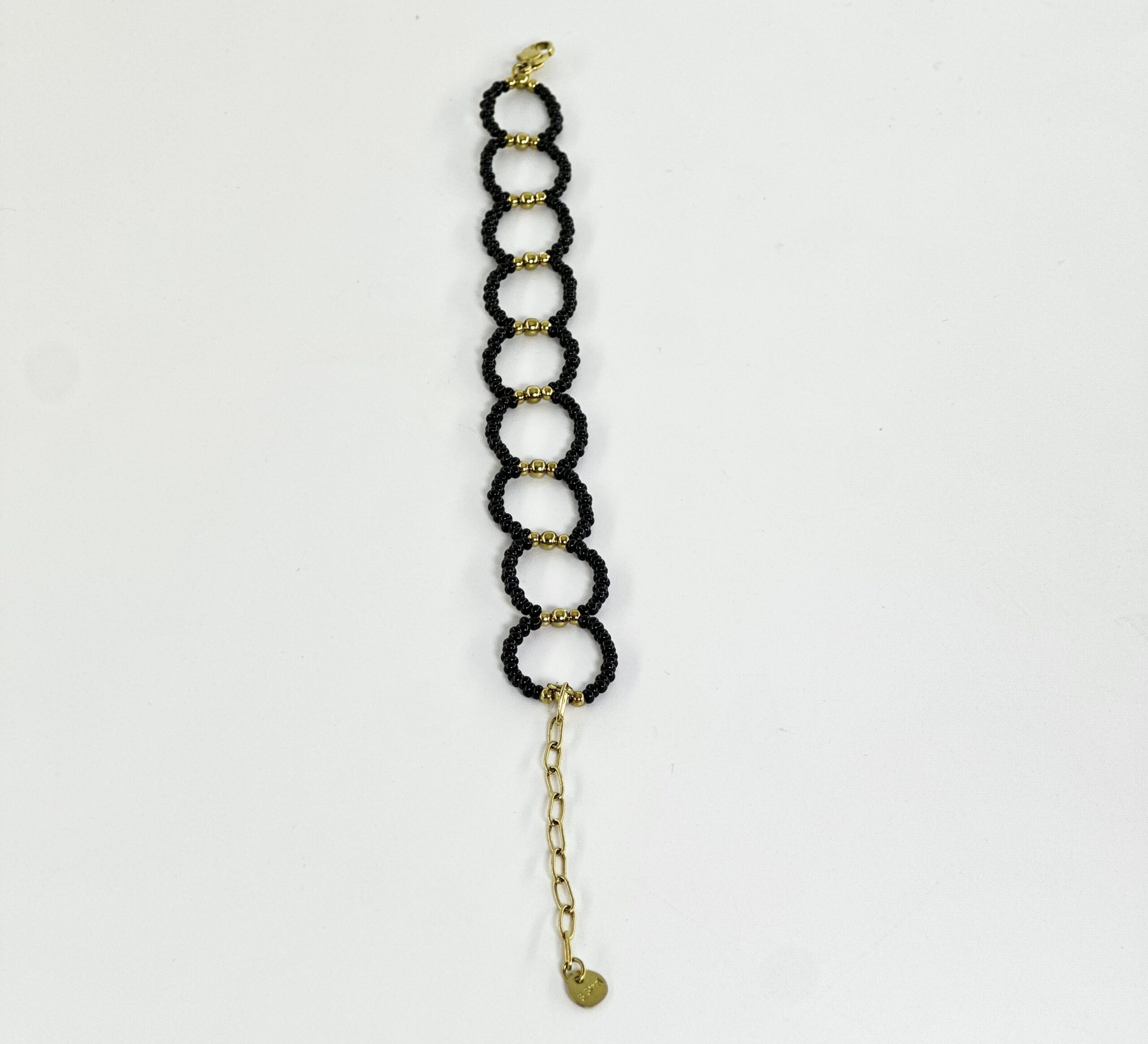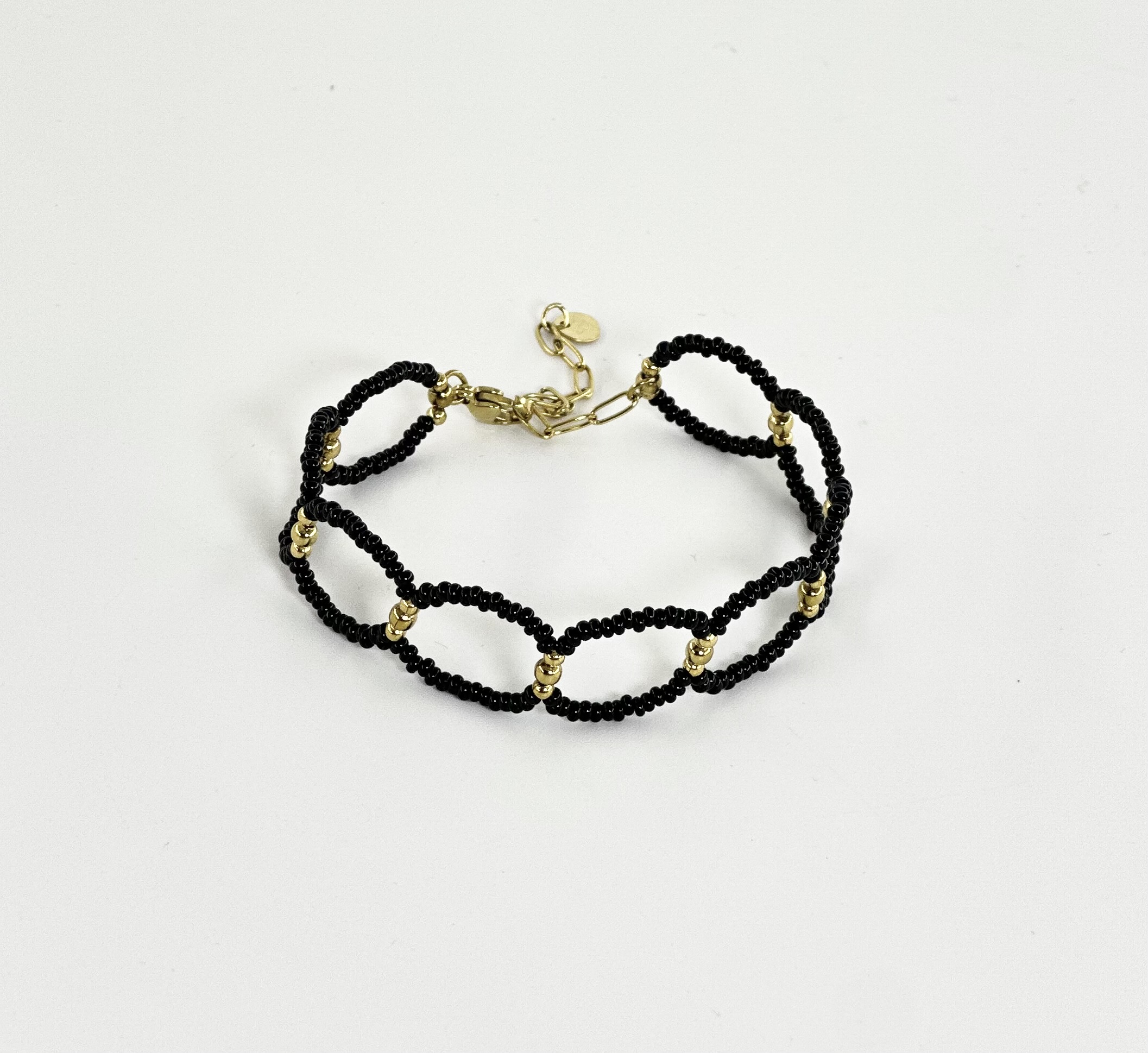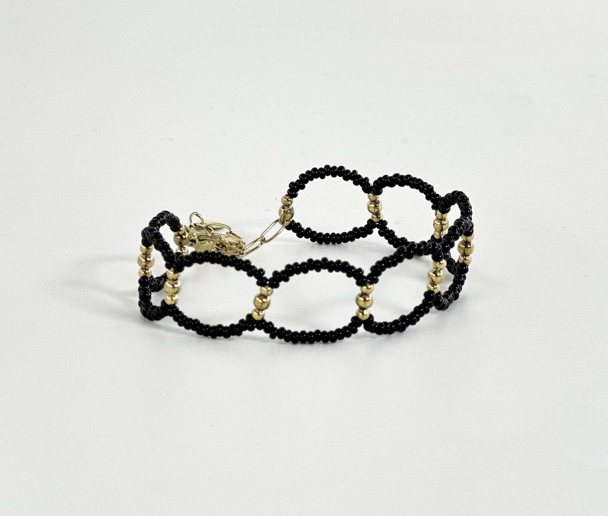 Κομψό μαύρο βραχιόλι, φτιαγμένο από μικρές μαύρες χάντρες, πλεγμένες σχέδιο που σχηματίζει οβάλ κρίκους.