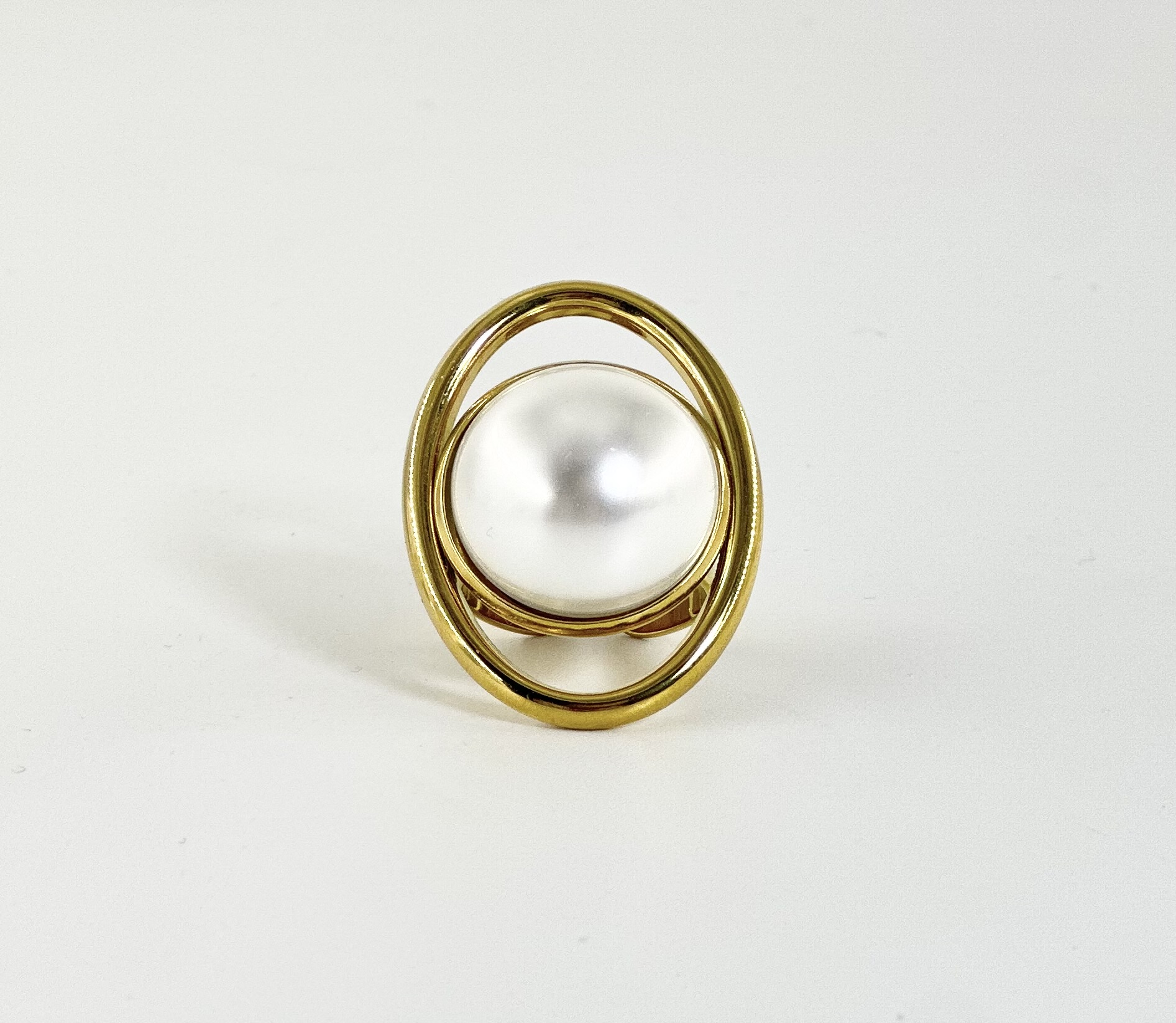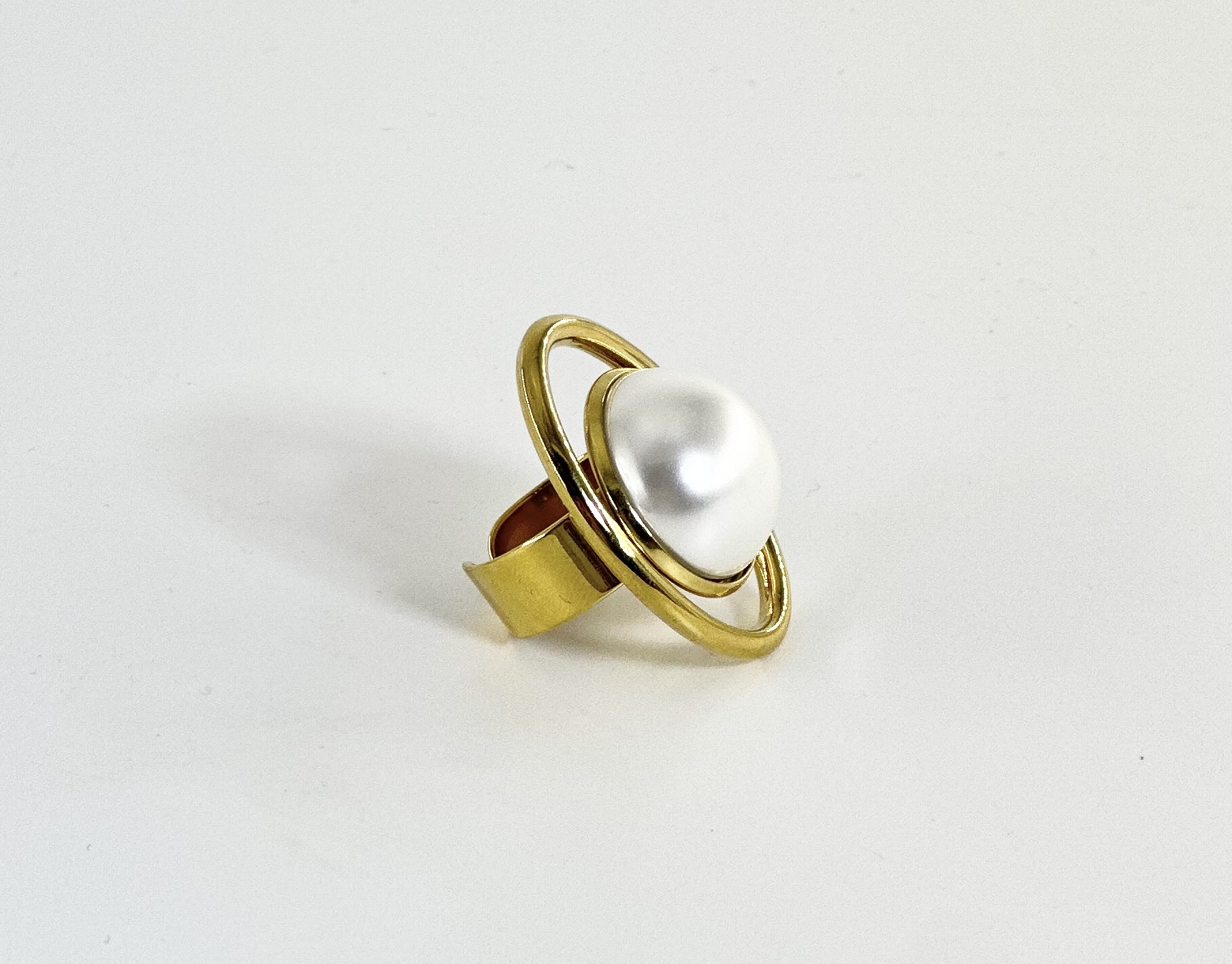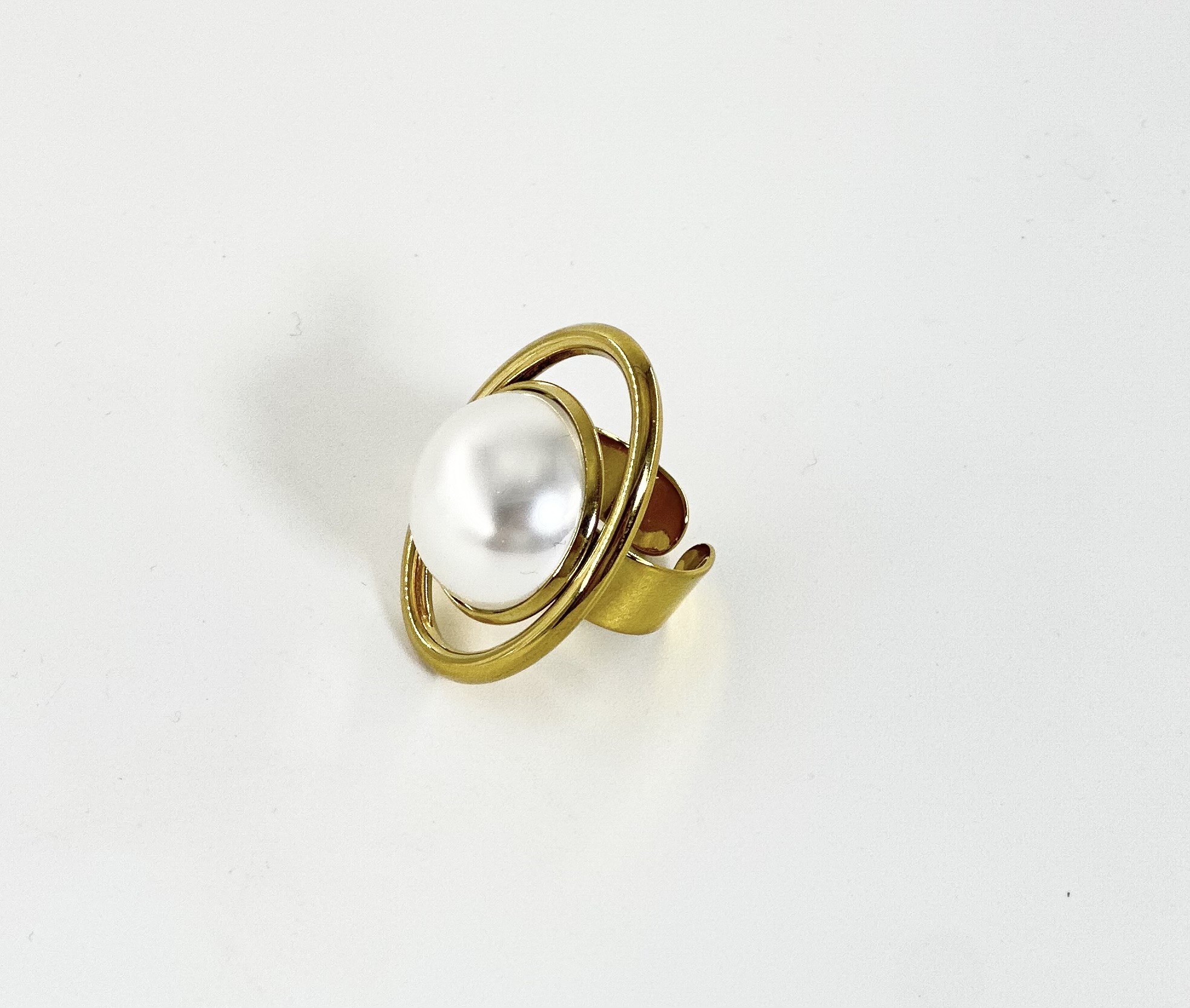 Χρυσό ανοιγώμενο δαχτυλίδι με μία μεγάλη λευκή γυαλιστερή πέρλα στο κέντρο