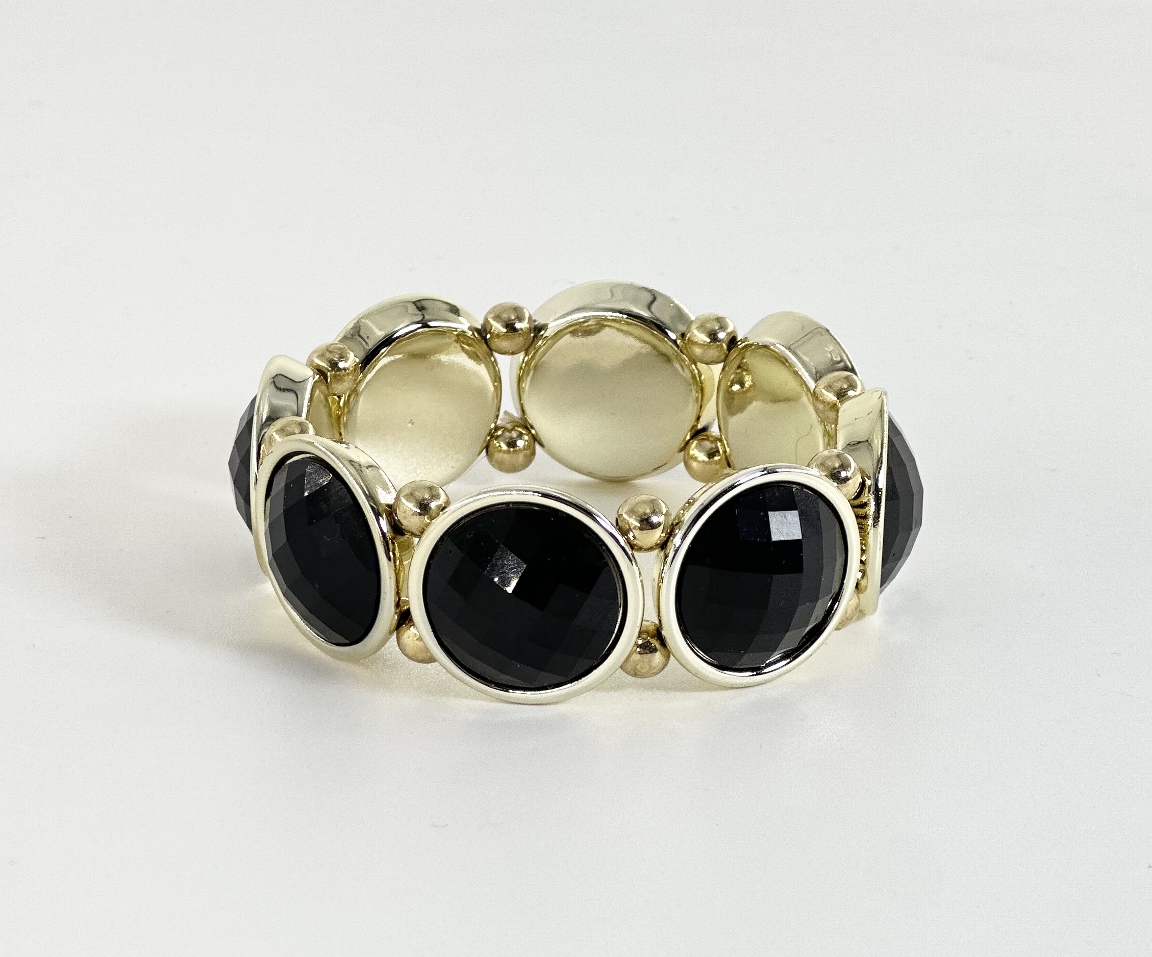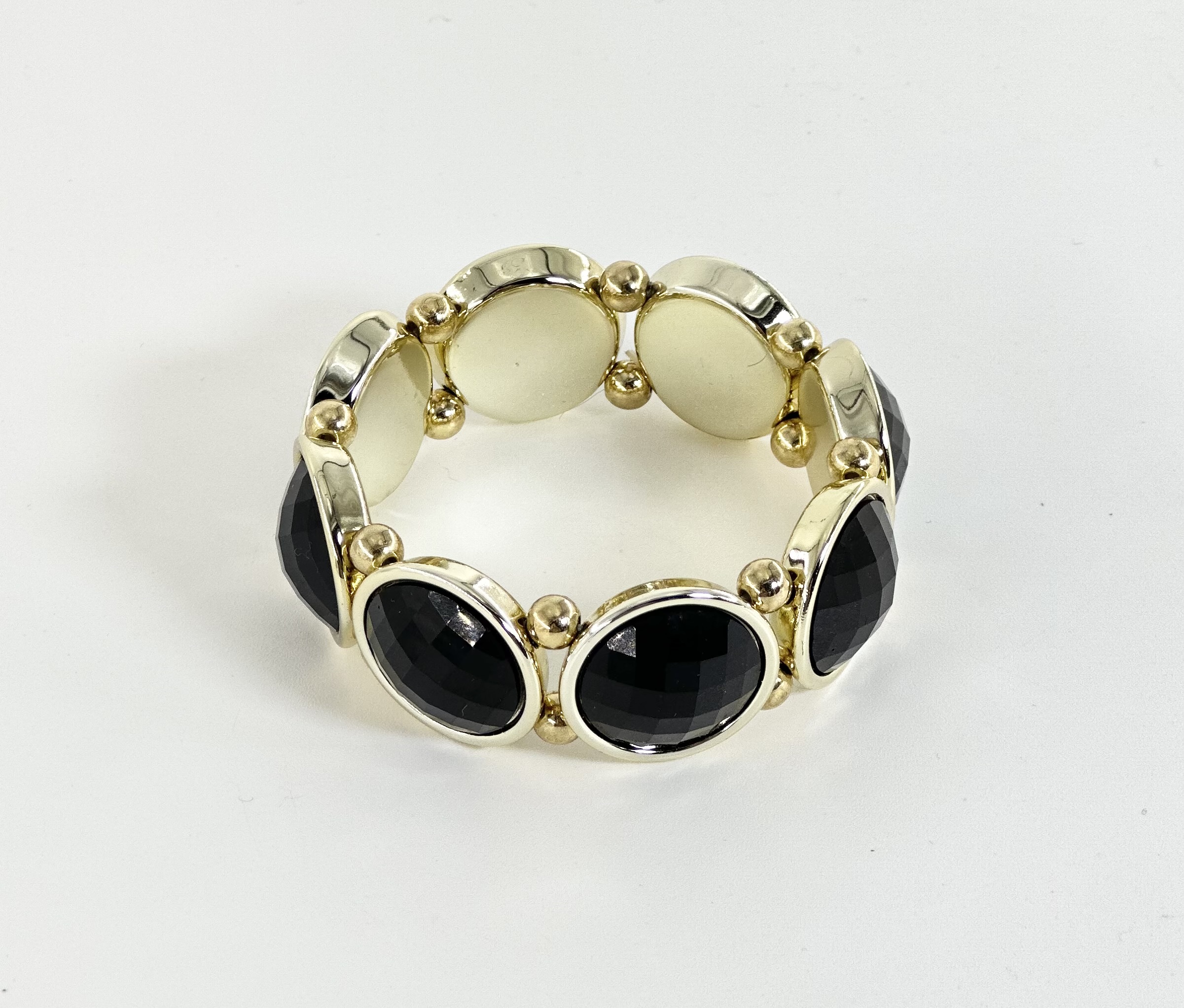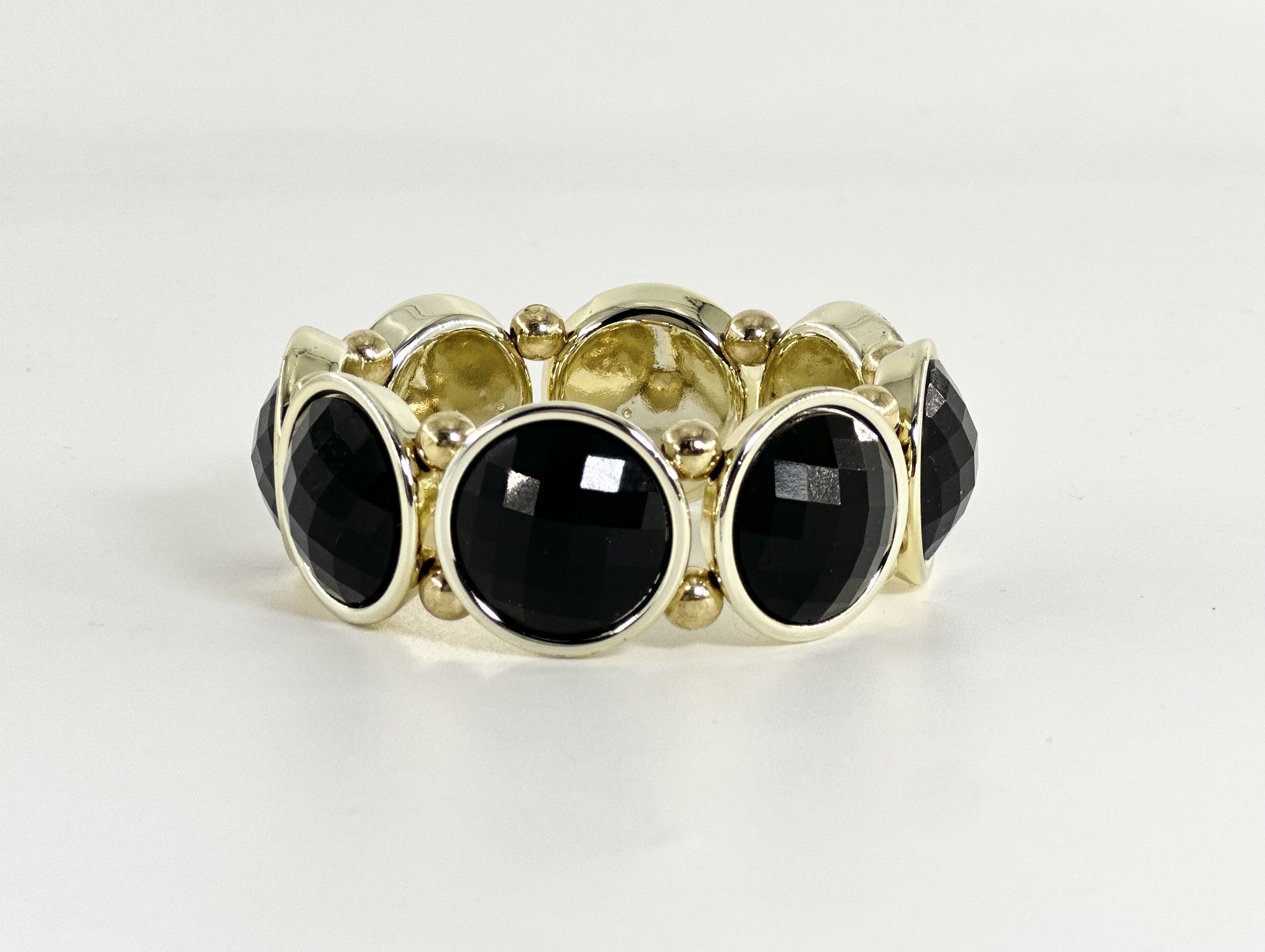 Ελαστικό βραχιόλι σε χρυσή απόχρωση με μεταλλικό περίγραμμα περιμετρικά που πλαισιώνει μαύρες οβάλ πέτρες,