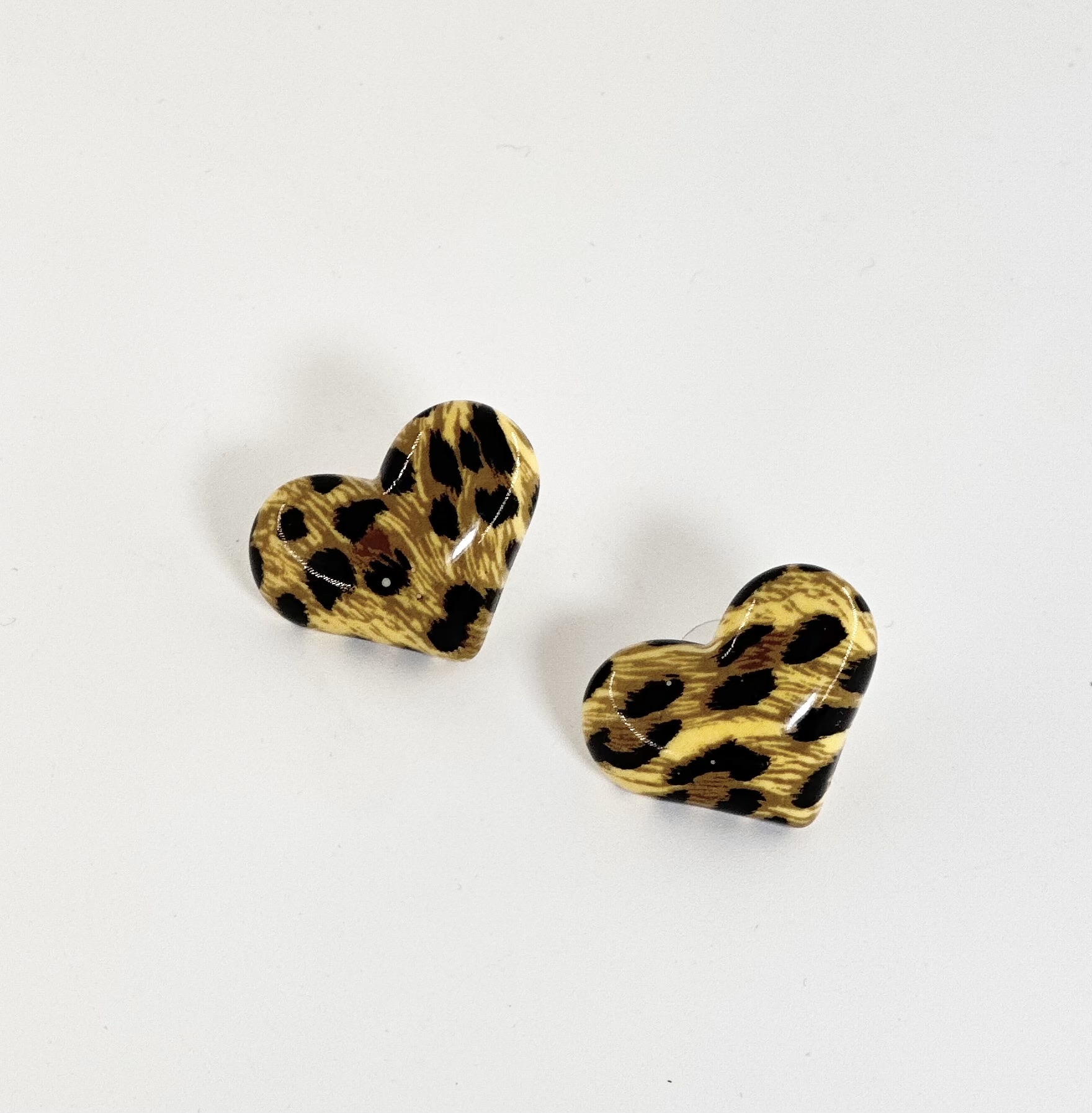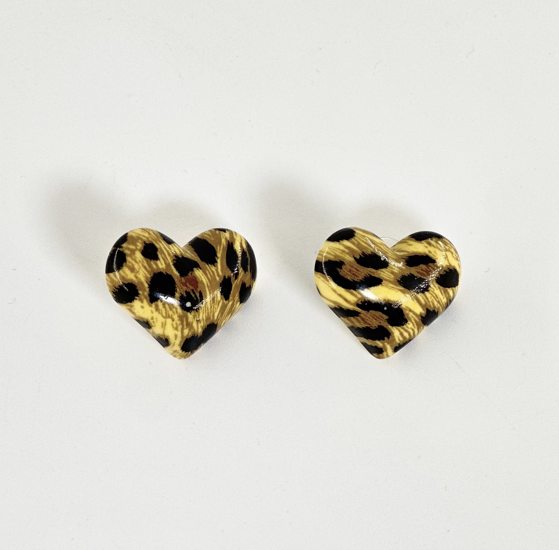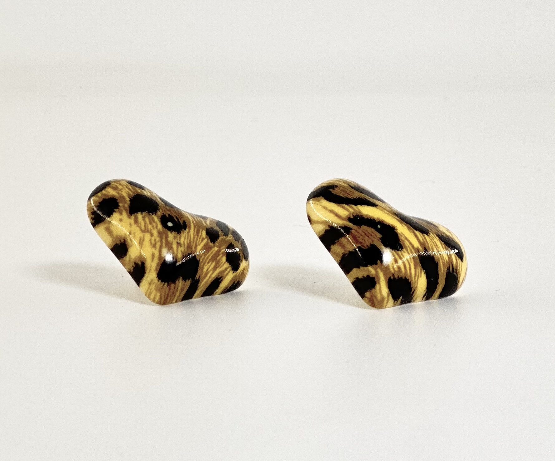 Σκουλαρίκια σε σχήμα καρδιάς με απαλές καμπύλες και γυαλιστερή επιφάνεια σε animal print τύπου λεοπάρ,