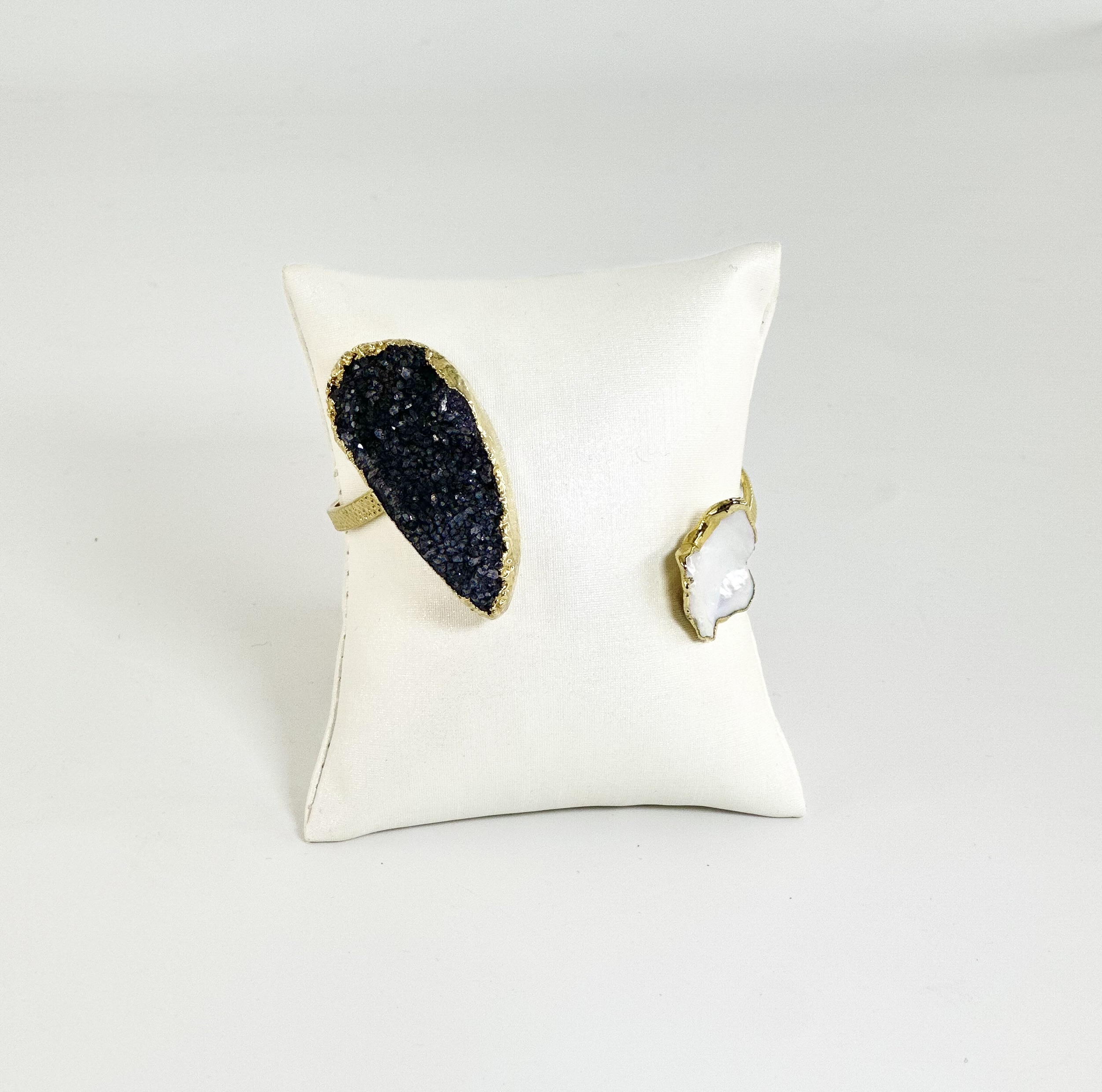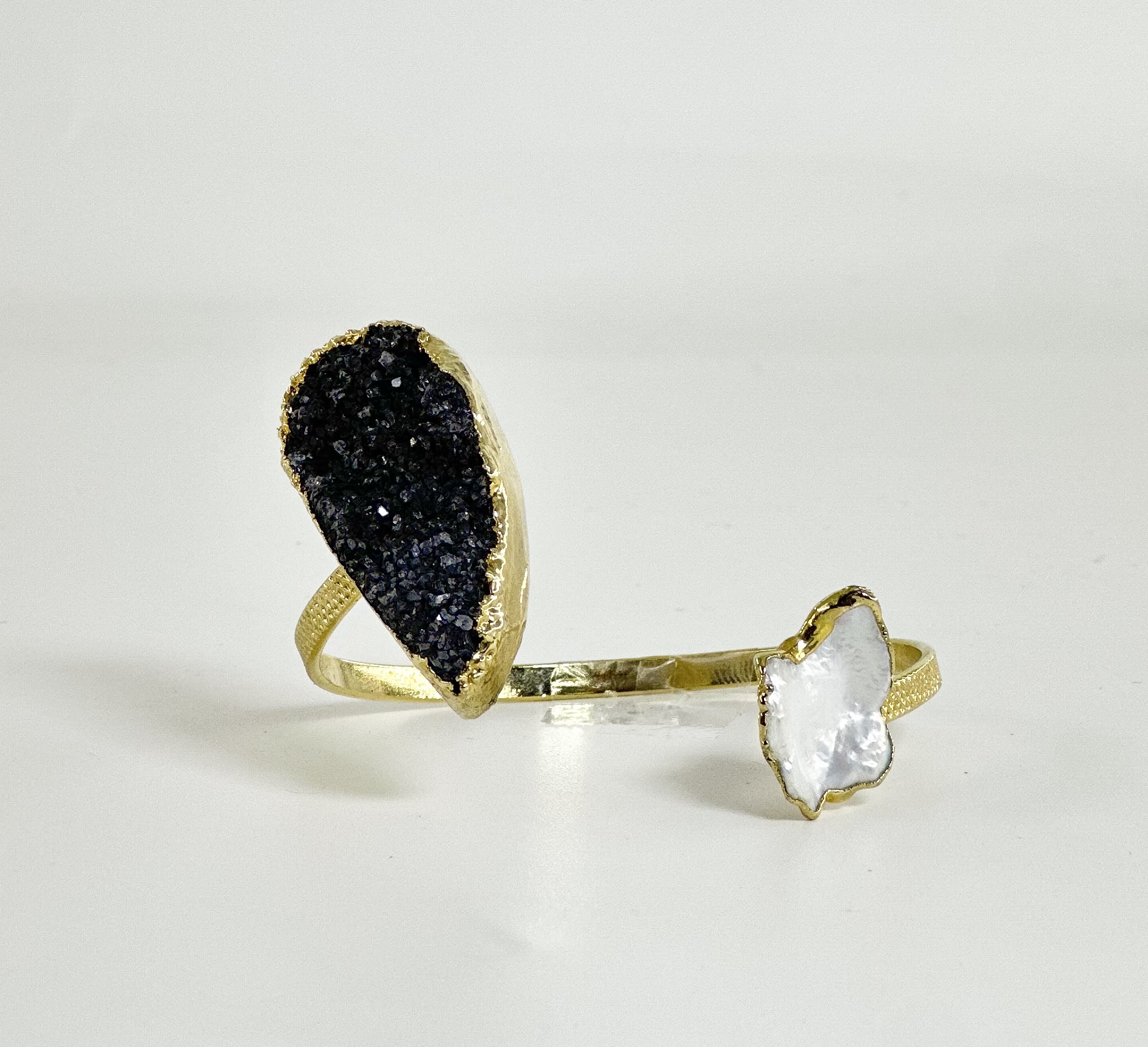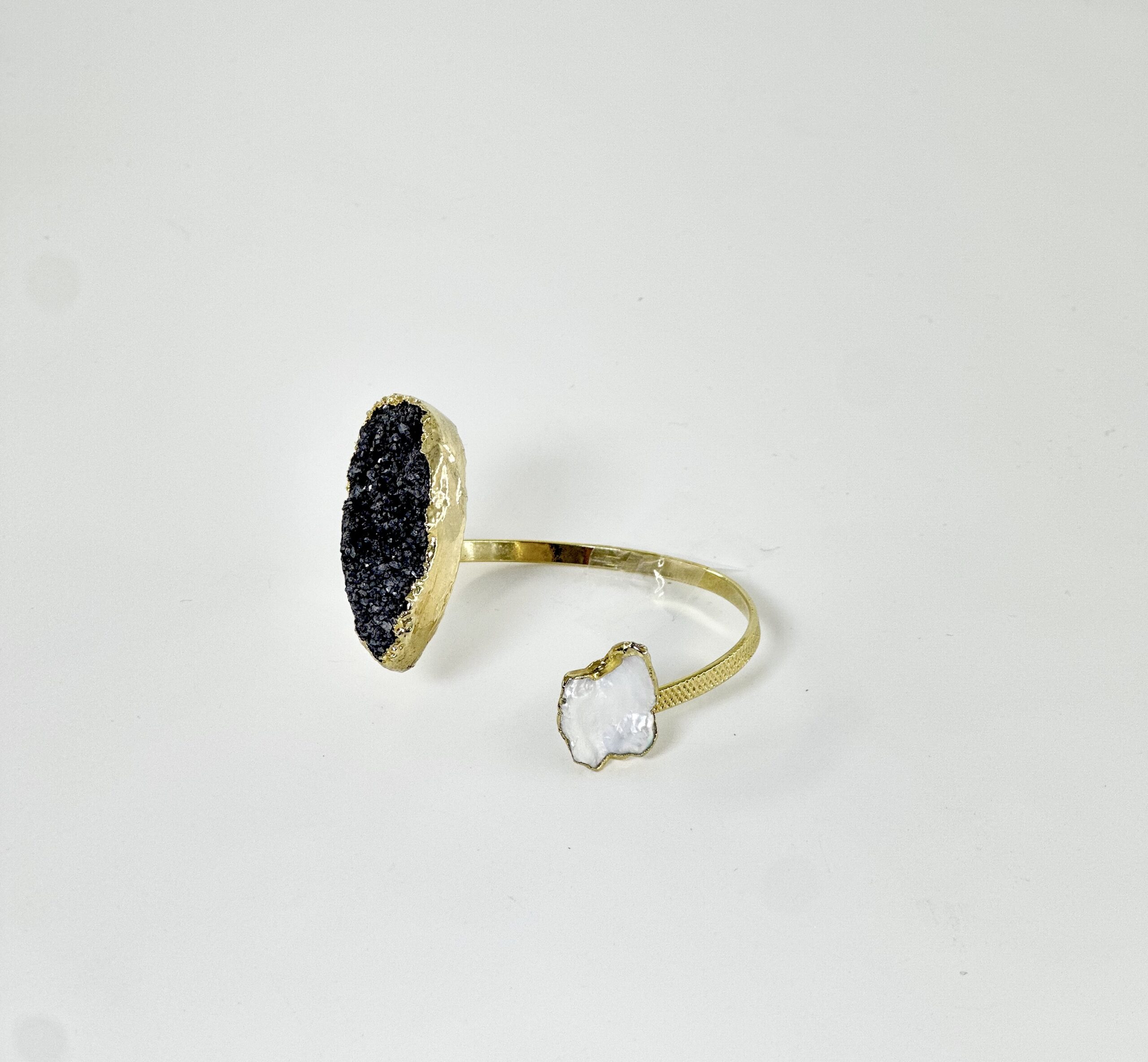 Ανοιχτό βραχιόλι τύπου cuff, με δύο μεγάλες ασύμμετρες πέτρες και χρυσή μεταλλική βάση με σφυρηλατημένη υφή.