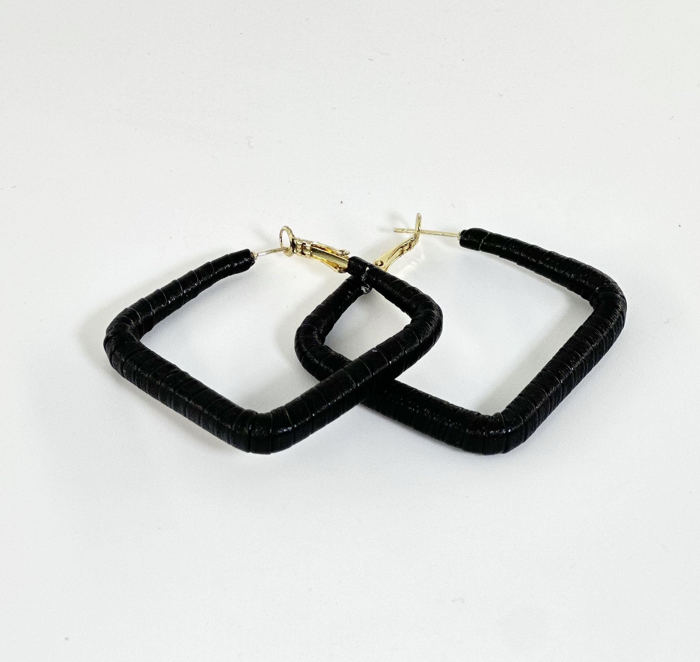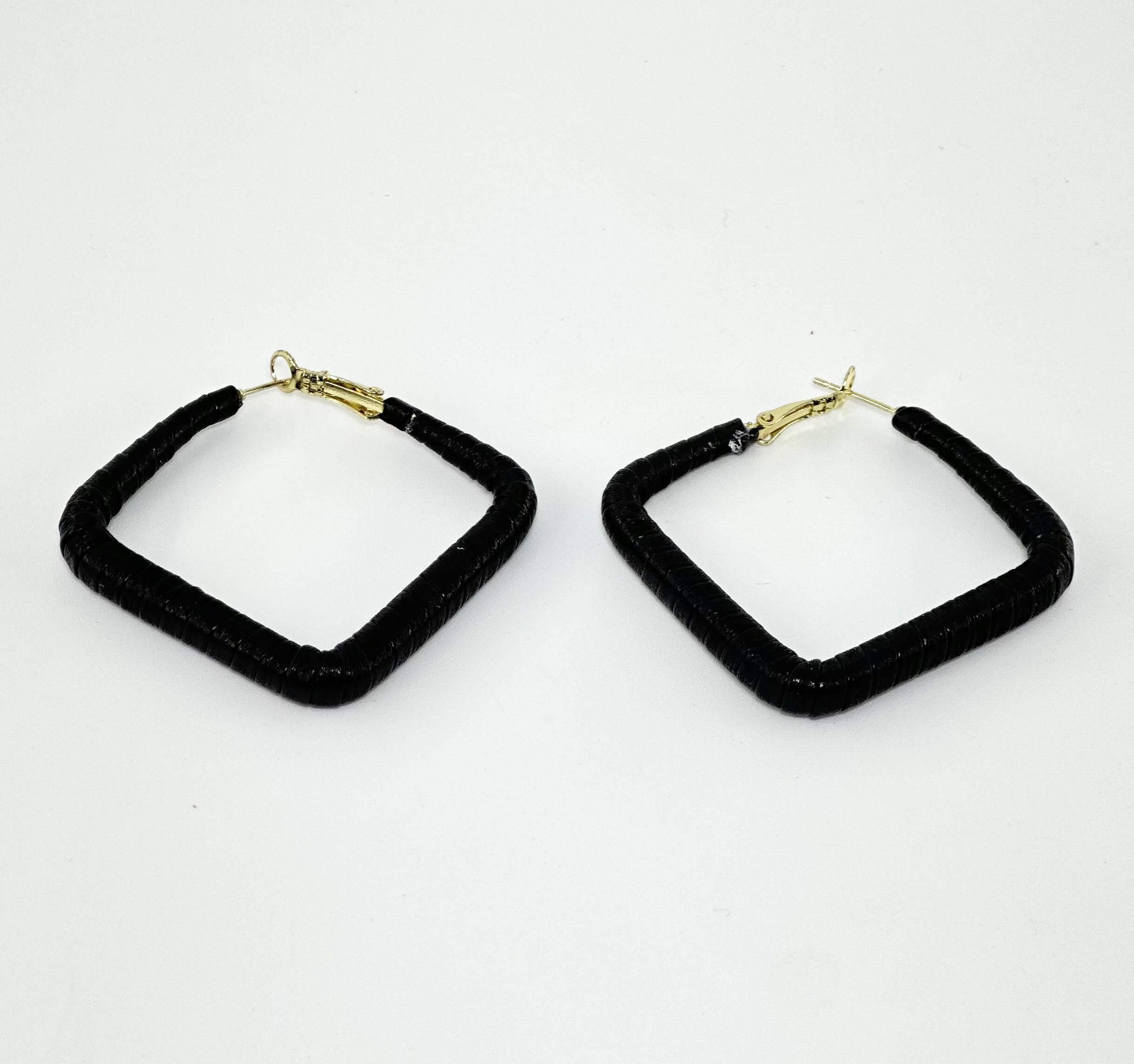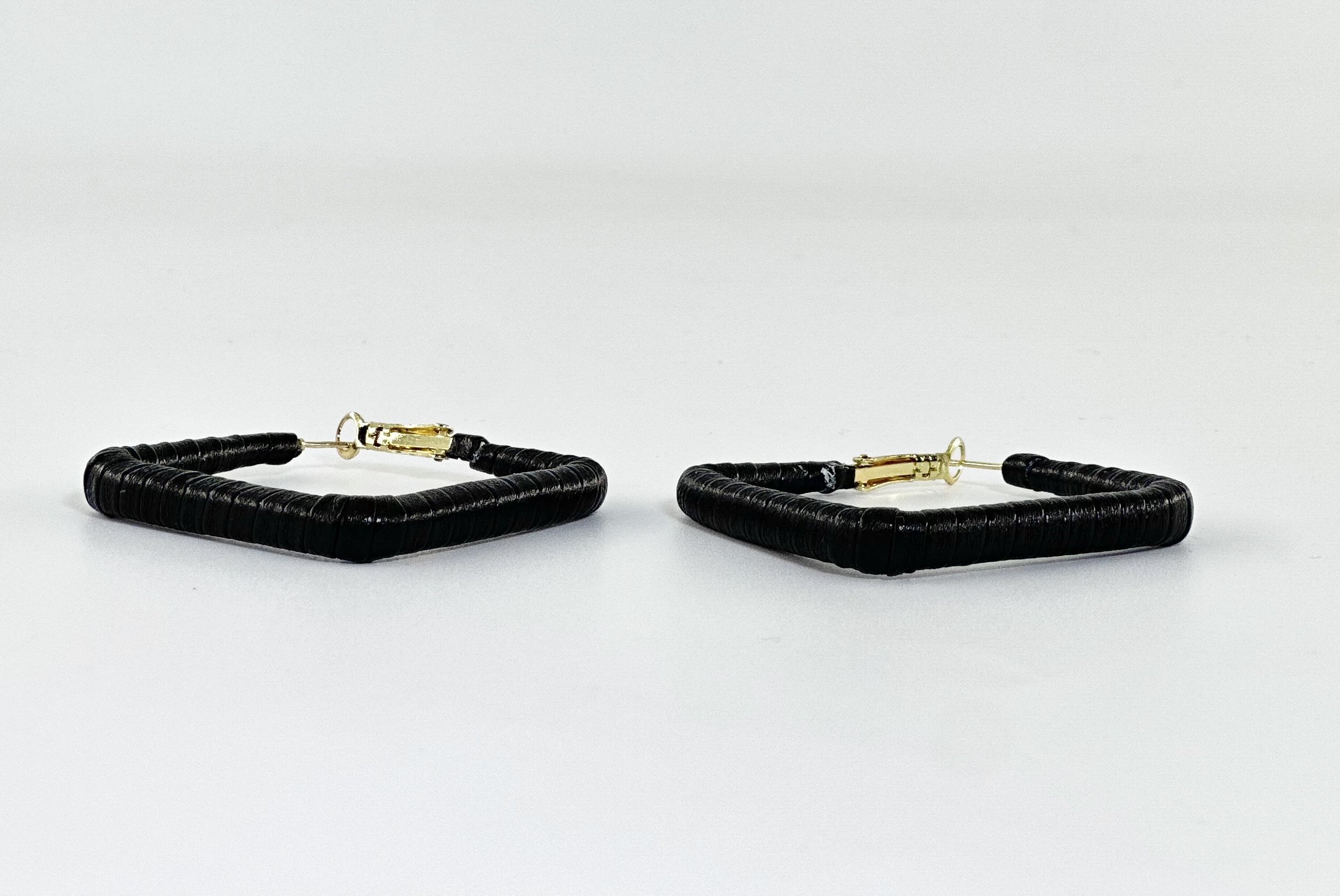 Μαύρα ματ σκουλαρίκια, με ατσάλινο σκελετό, καλυμμένο με λεπτό μαύρο νήμα και δερμάτινη υφή.