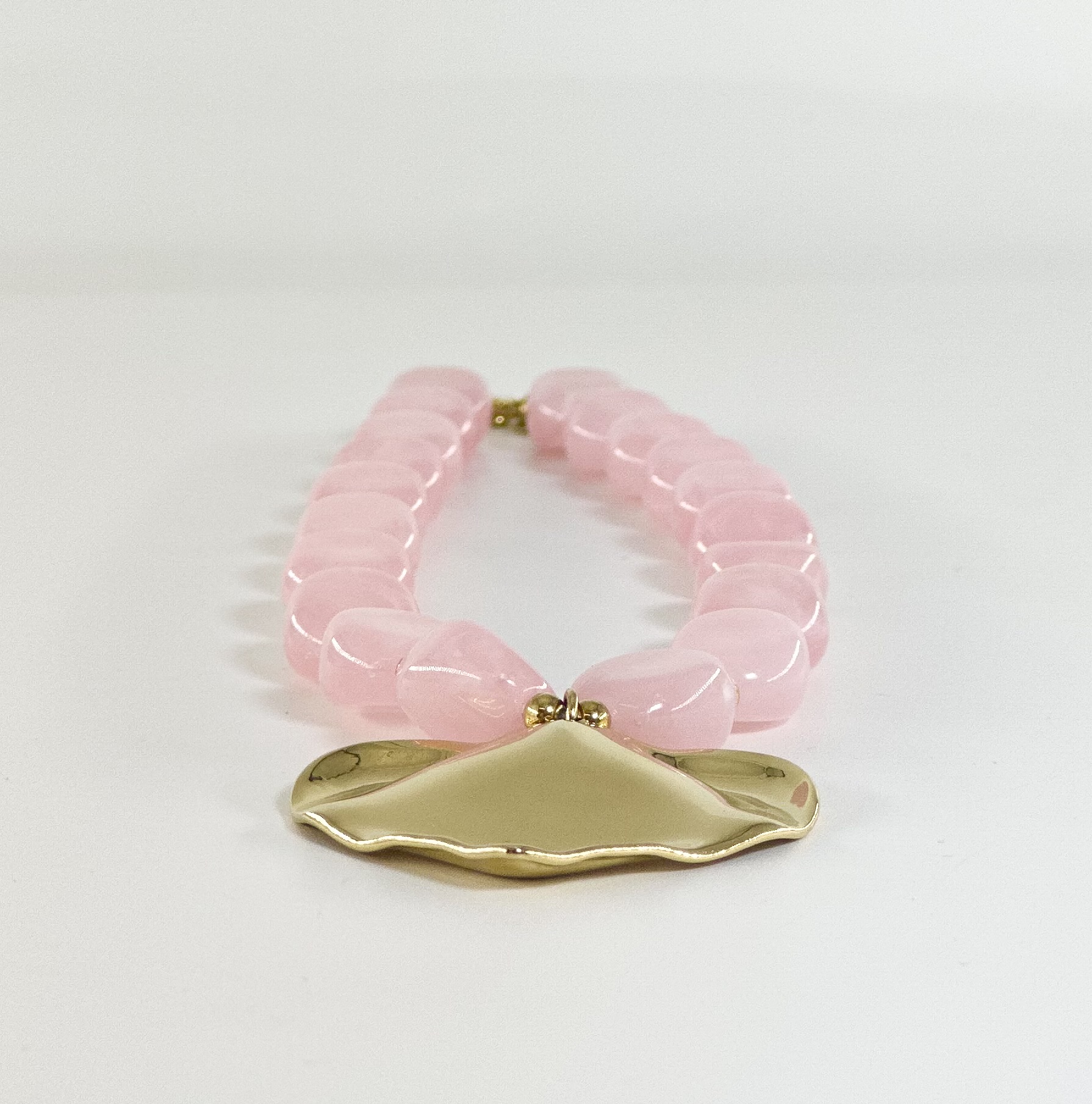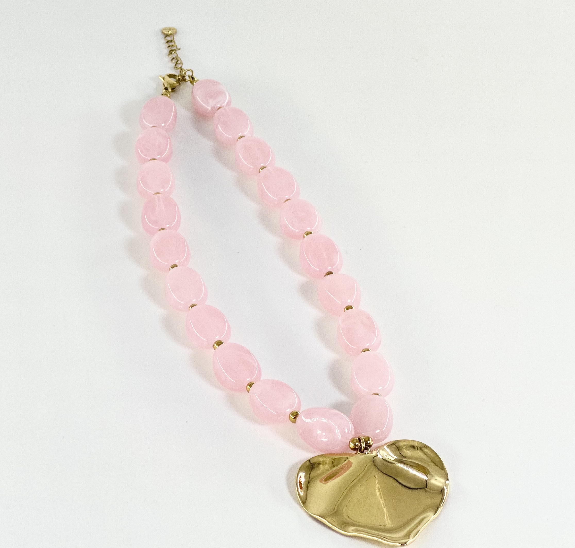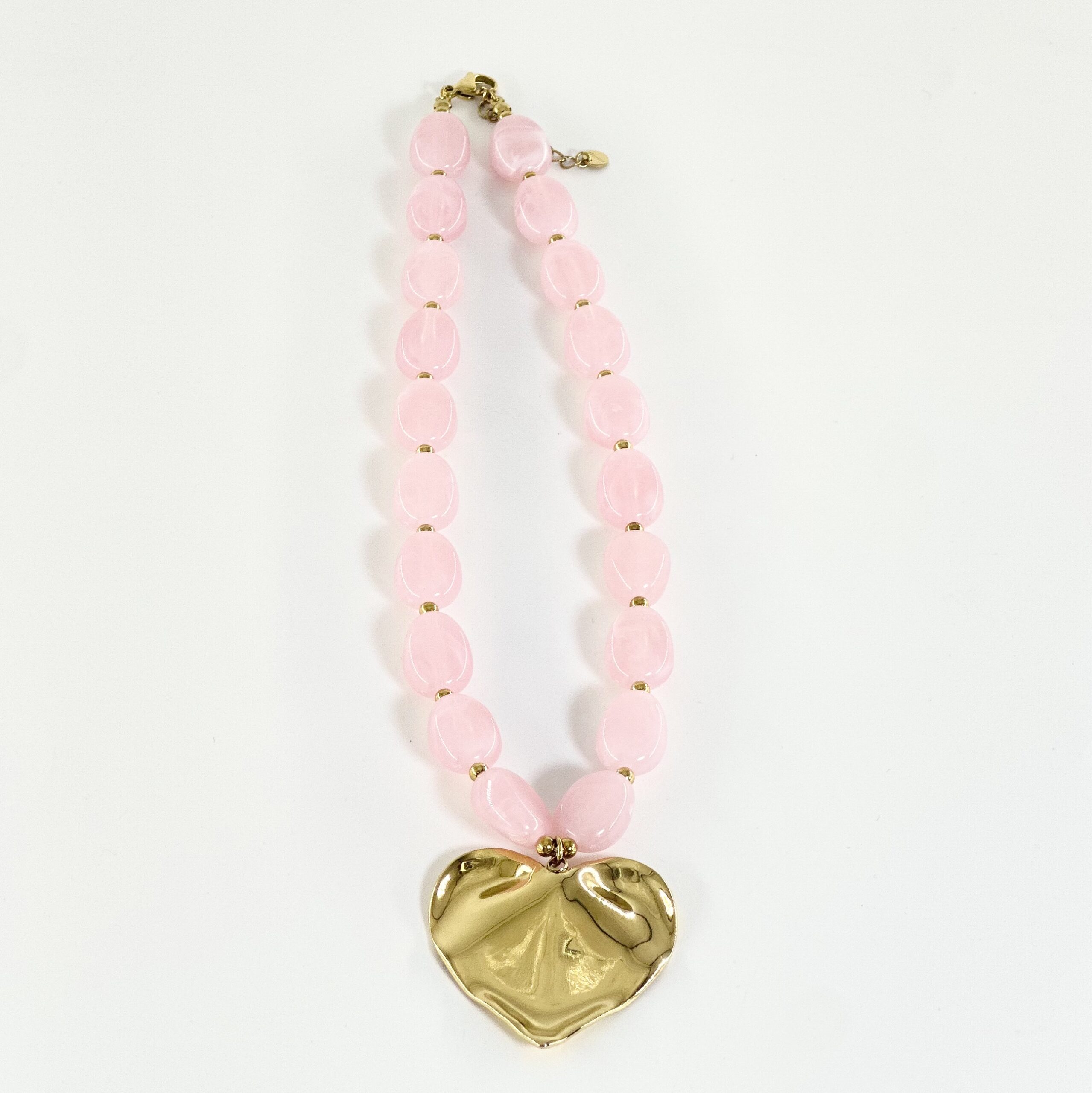 Η αλυσίδα αποτελείται από ροζ οβάλ χάντρες με γυαλιστερή υφή και ένα μεγάλο χρυσό μενταγιόν σε σχήμα καρδιάς με ακανόνιστη και σφυρήλατη υφή