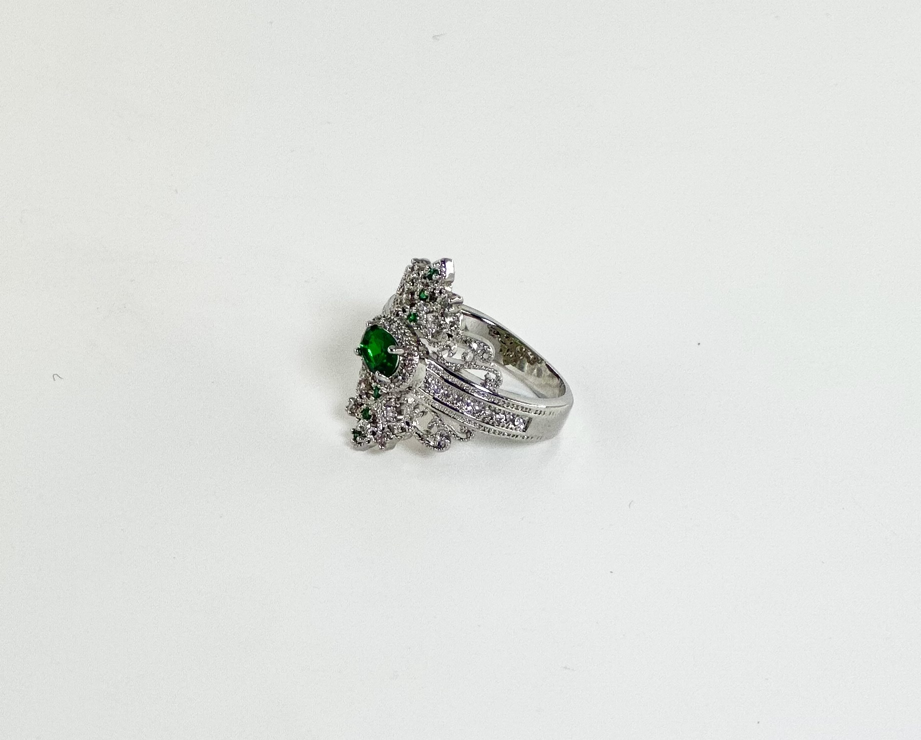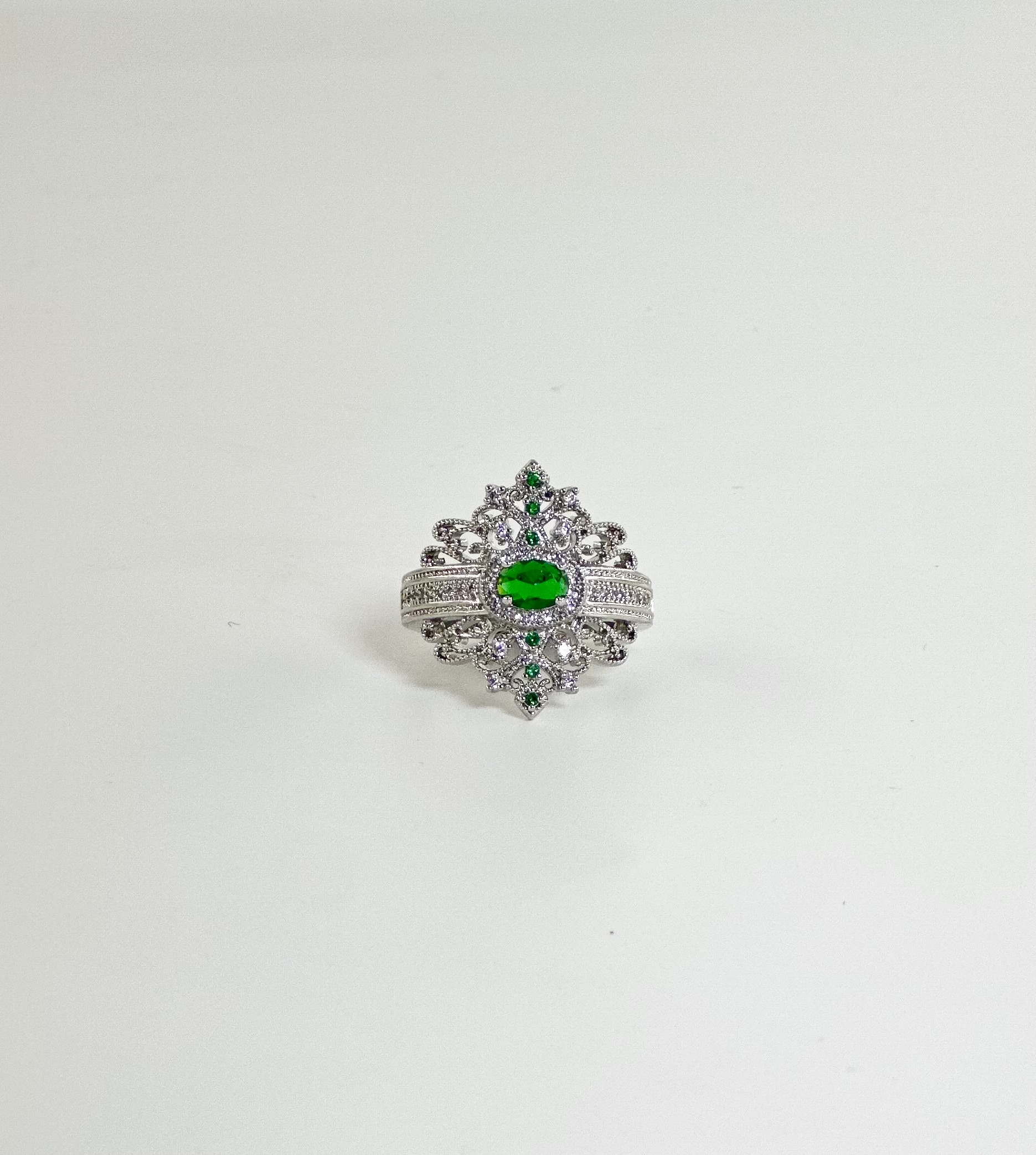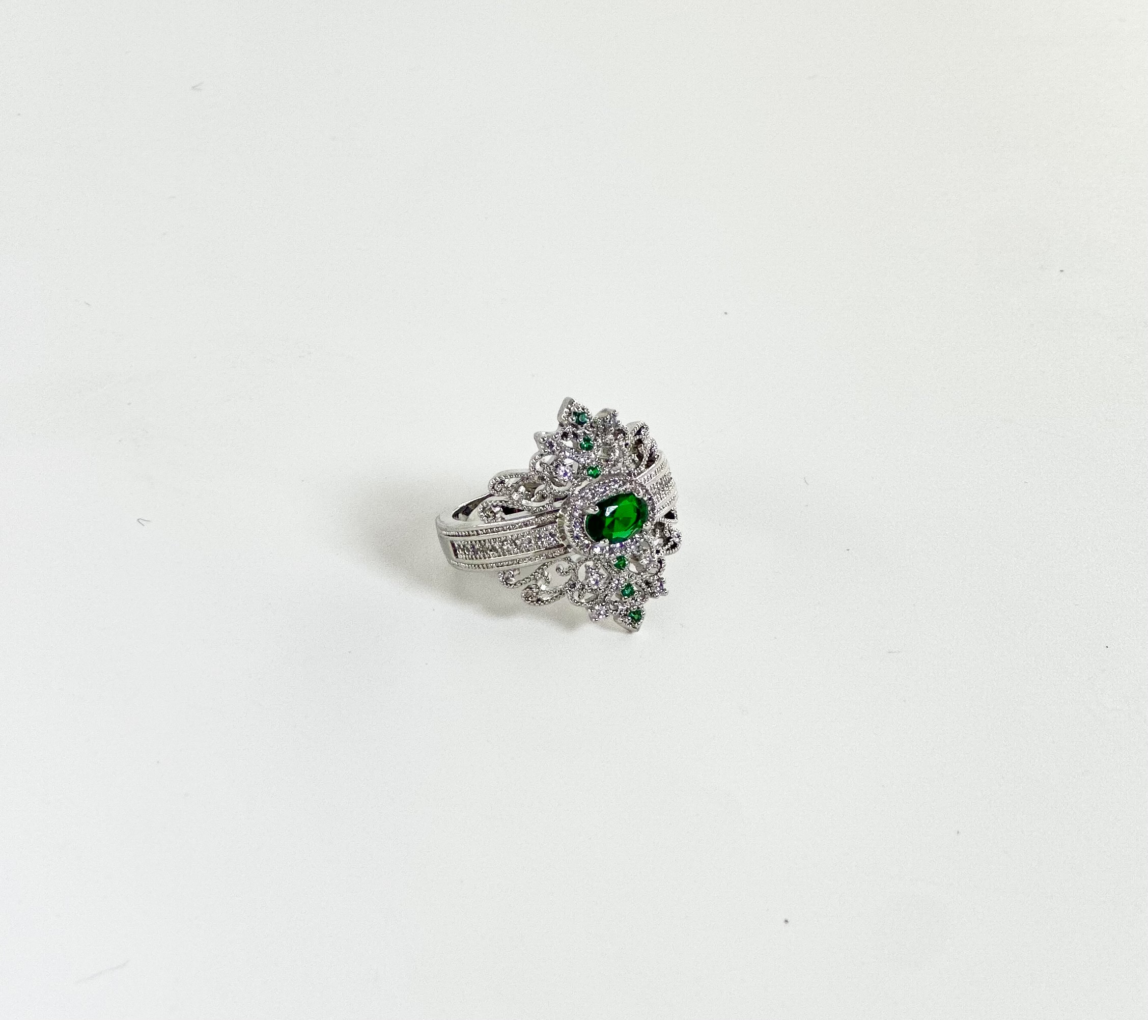 Στο κέντρο δεσπόζει μια μεγάλη πράσινη πέτρα,