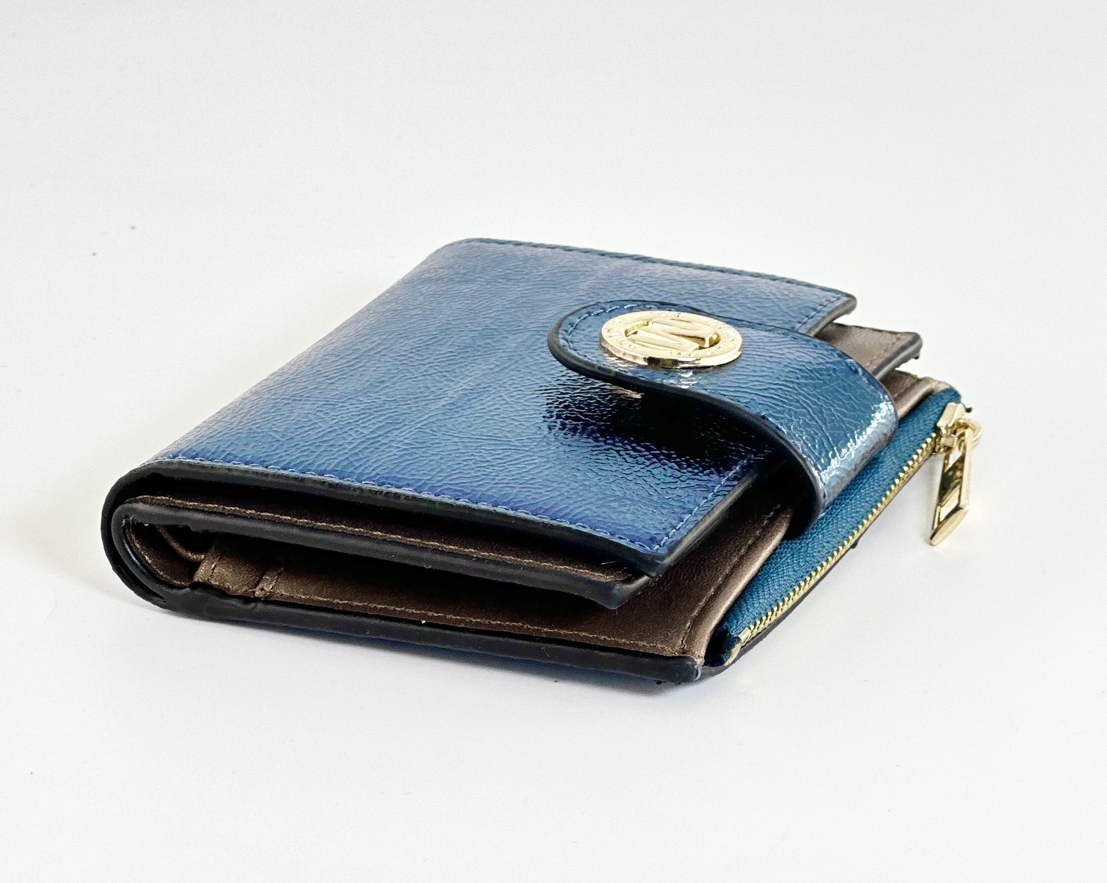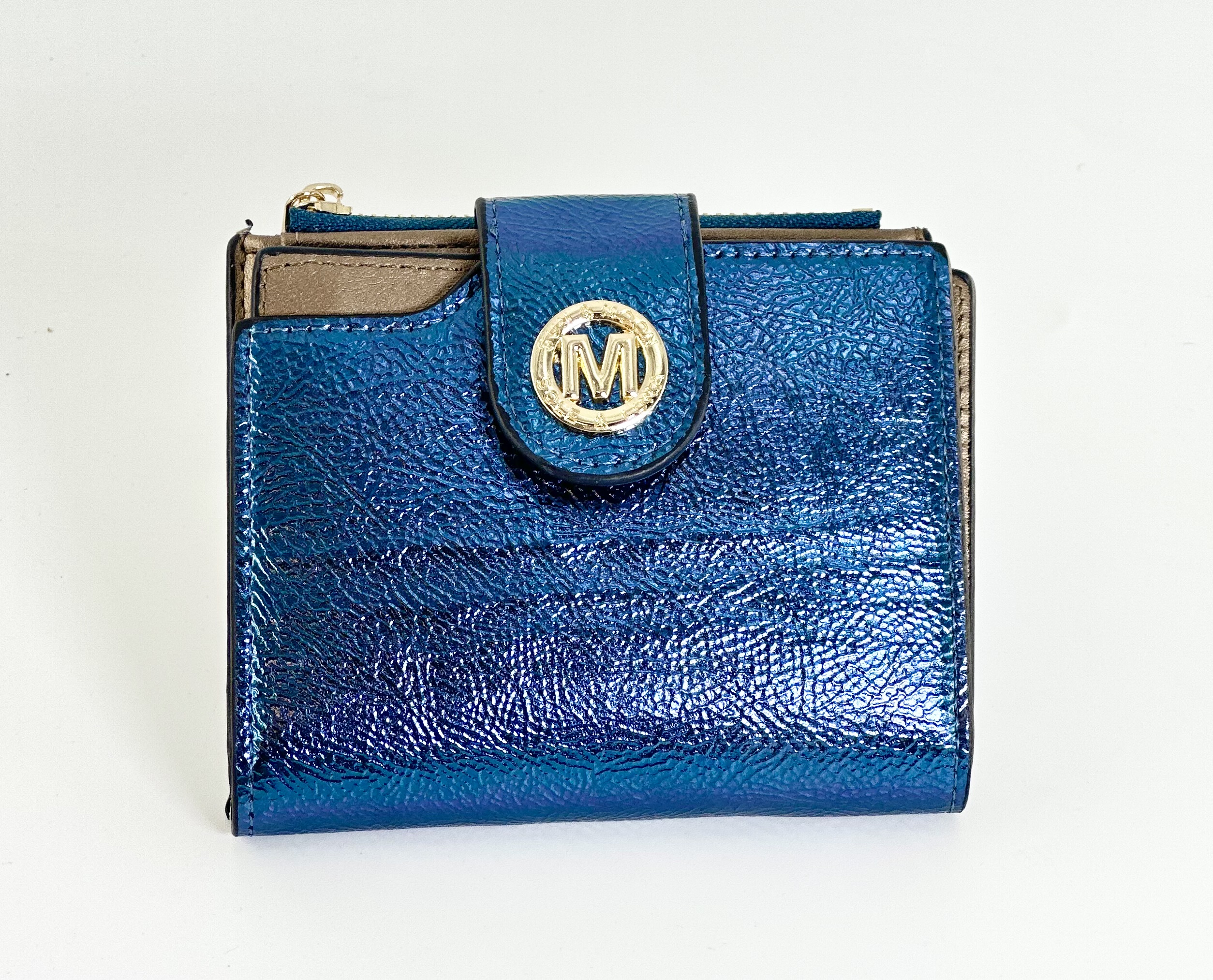 Είναι μεσαίου μεγέθους πορτοφόλι από συνθετικό δέρμα με μεταλλική, ιριδίζουσα υφή σε βαθύ ηλεκτρίκ μπλε χρώμα.