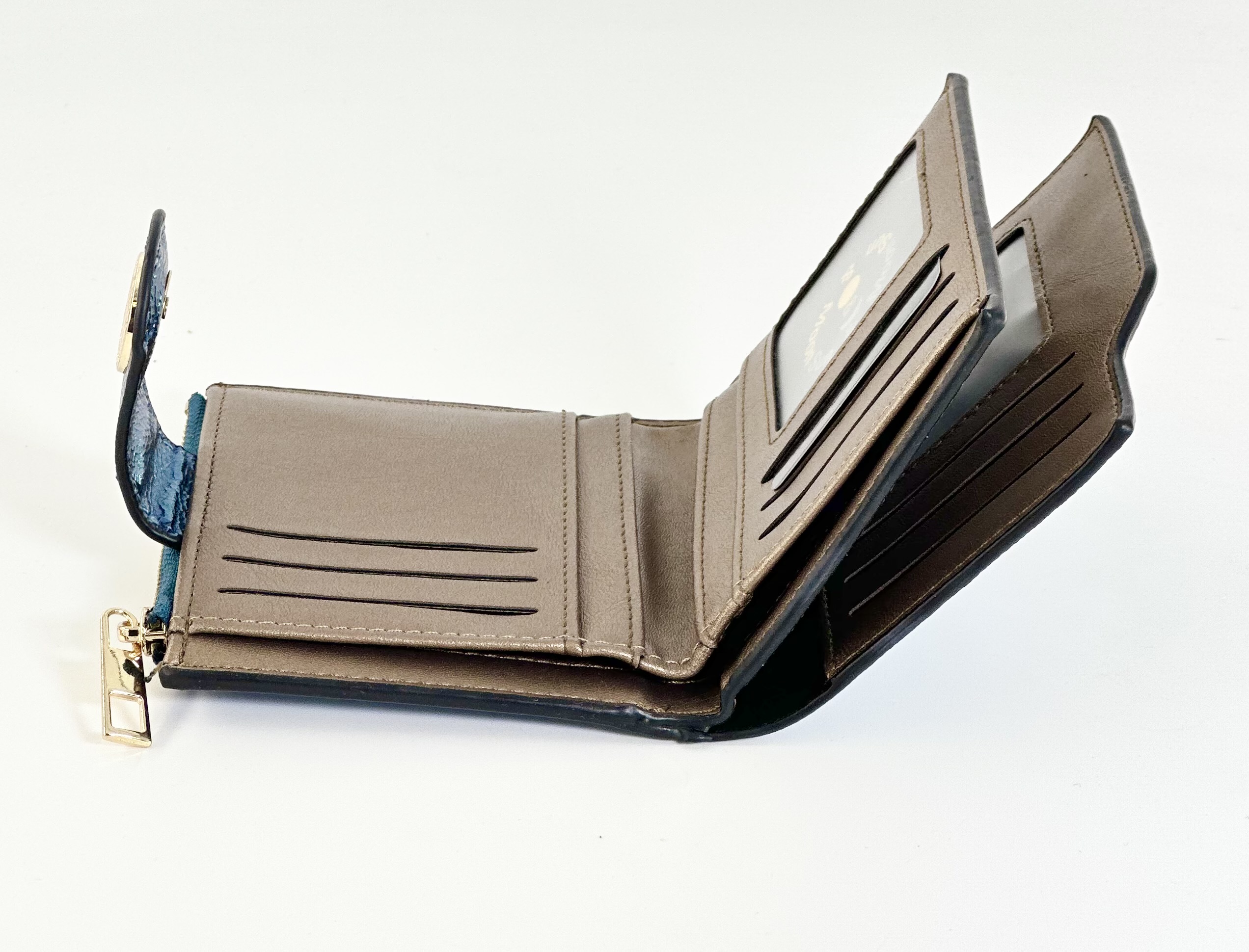 Στο επάνω μέρος έχει φερμουάρ για τα ψιλά, ενώ στο εσωτερικό του υπάρχουν πολλές θήκες για κάρτες, χαρτονομίσματα και ταυτότητα.