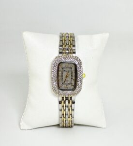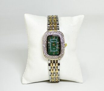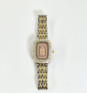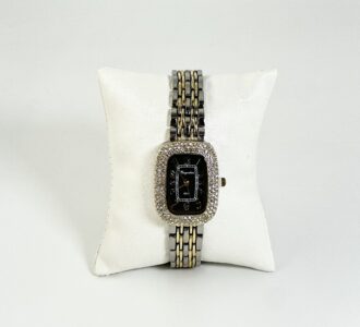 Ατσάλινο ασημί ρολόι με ορθογώνια κάσα με στρογγυλεμένες γωνίες και είναι περιμετρικά στολισμένη με δύο σειρές λαμπερών στρας.