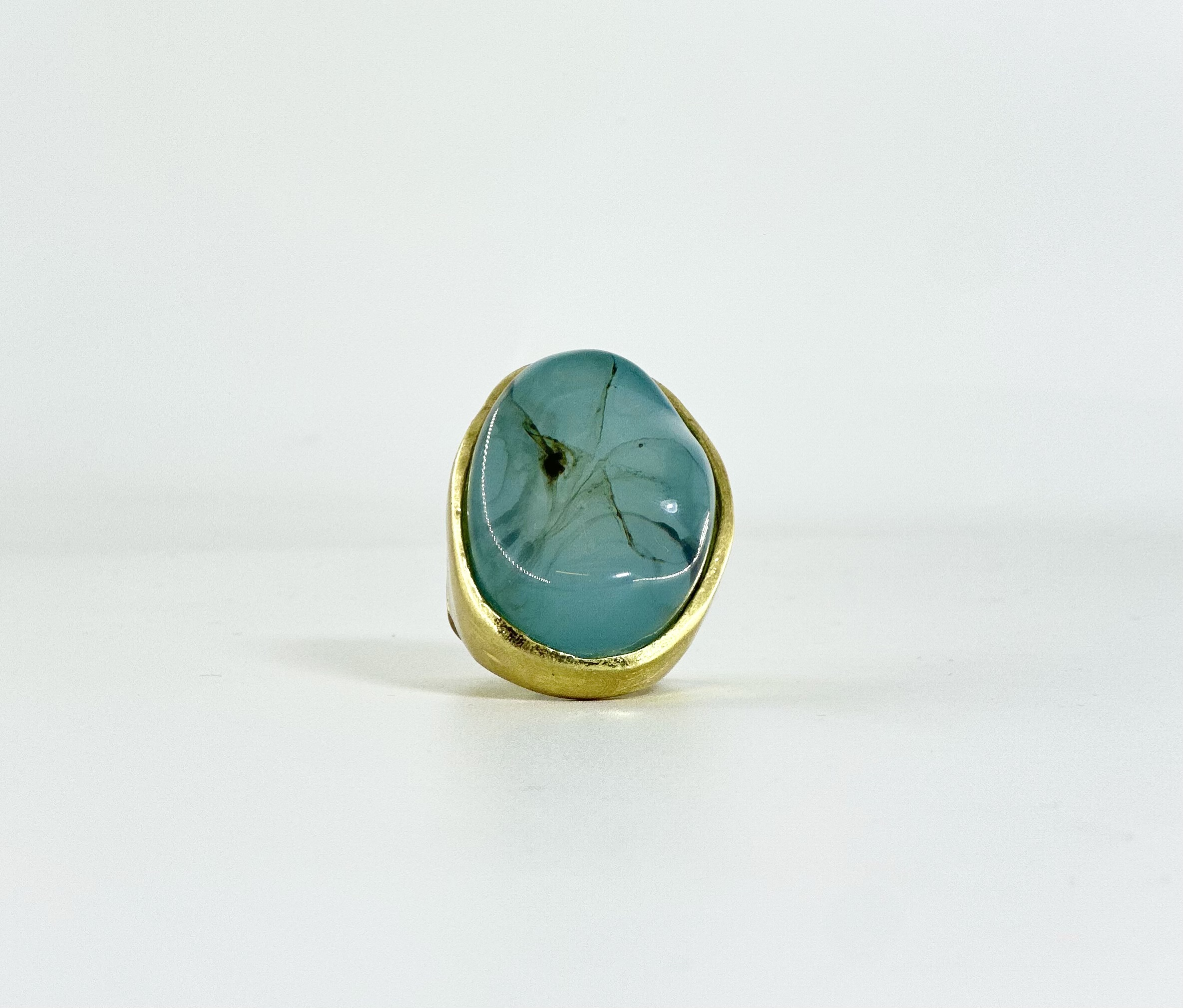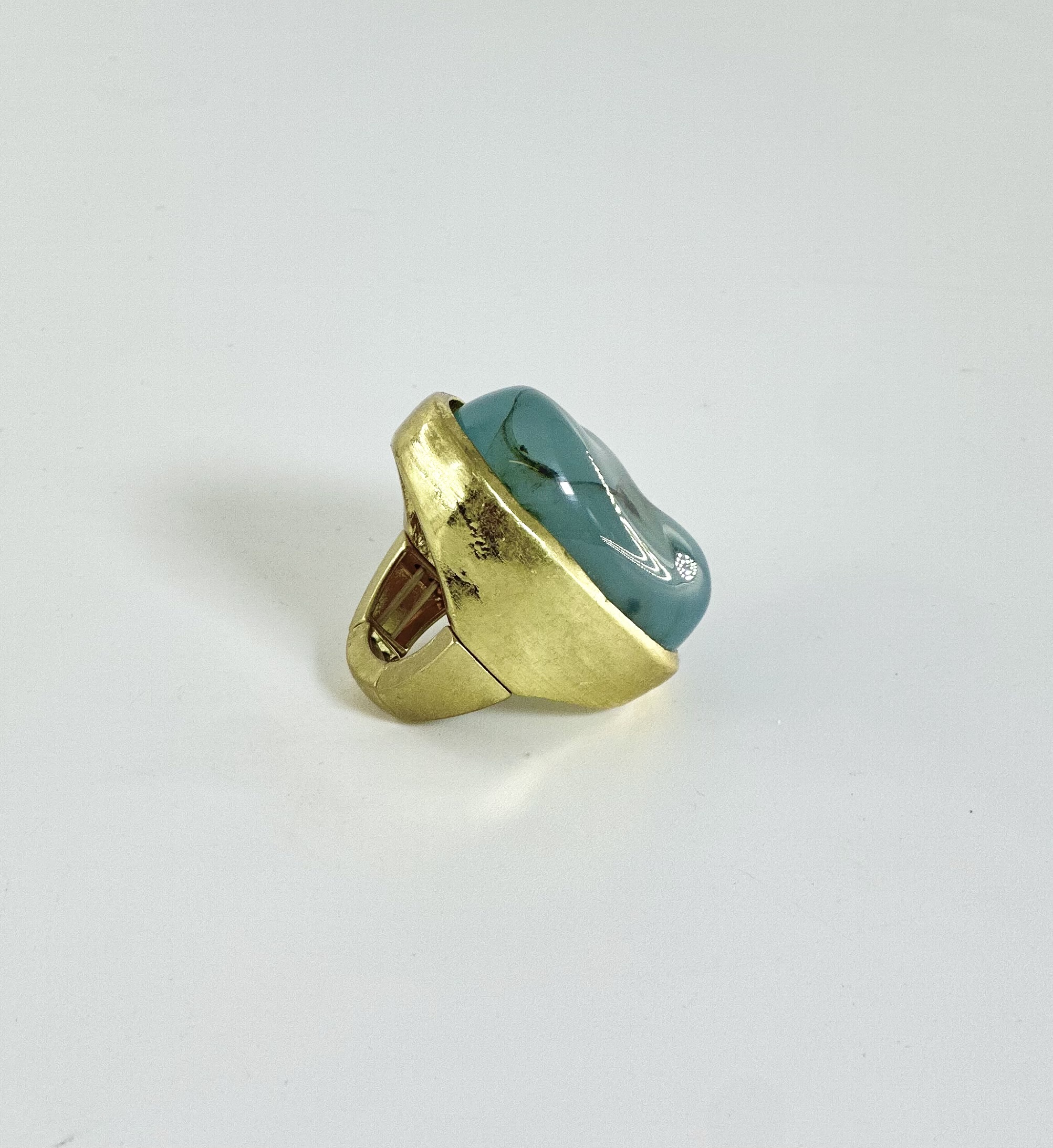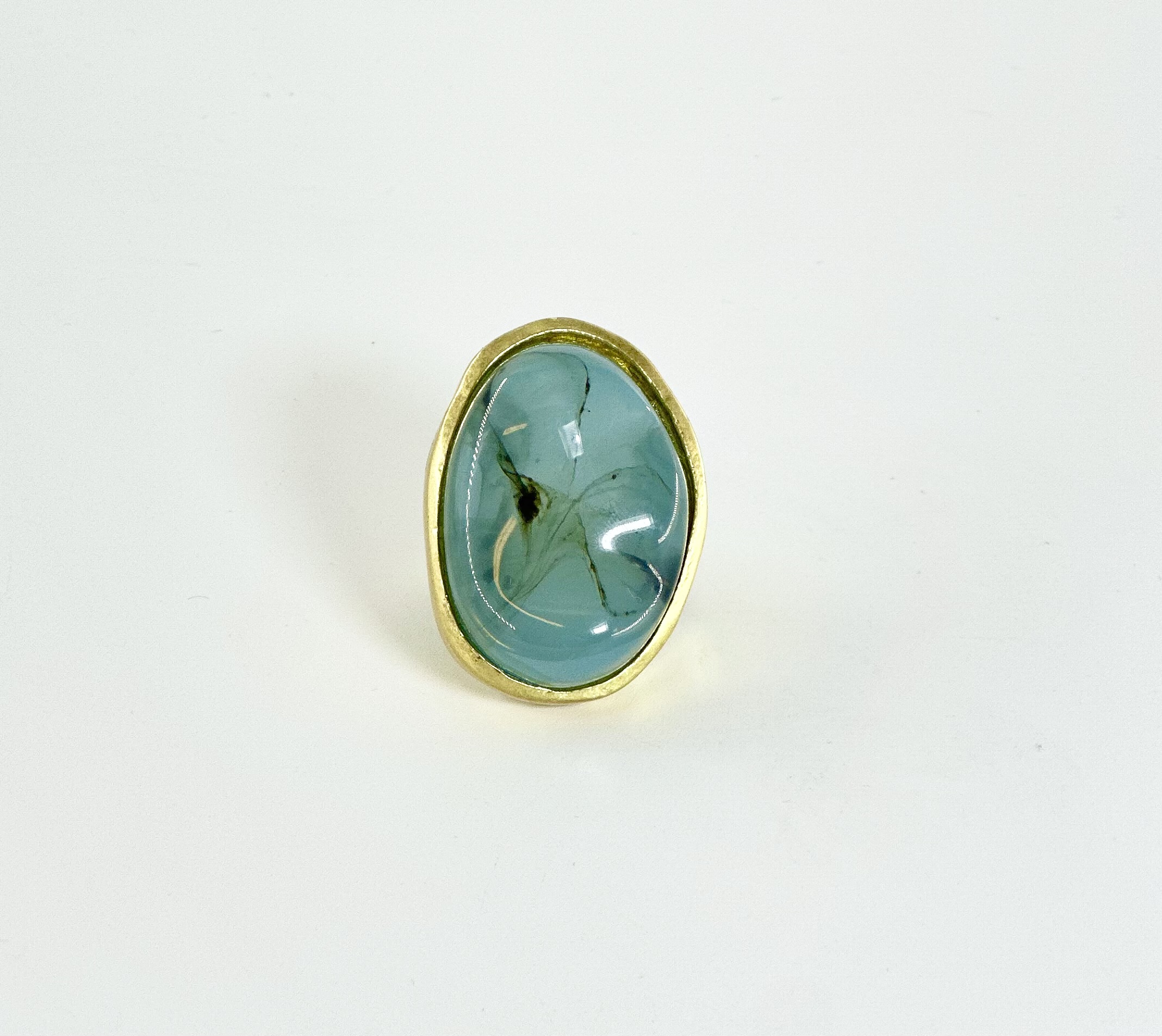 Ατσάλινο δαχτυλίδι σε σατινέ χρυσή απόχρωση, με μεγάλη οβάλ πέτρα σε γαλαζοπράσινο χρώμα, που θυμίζει θαλασσινό γυαλί ή ημιπολύτιμο λίθο.