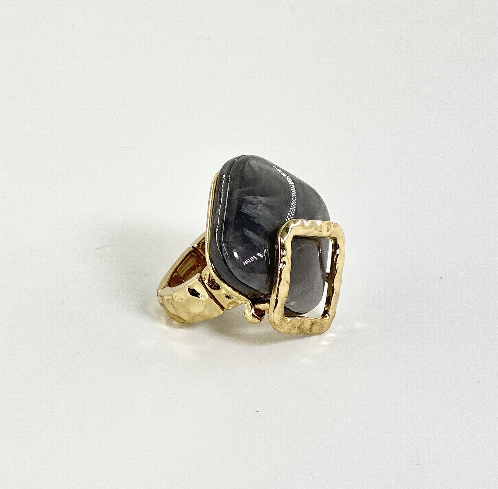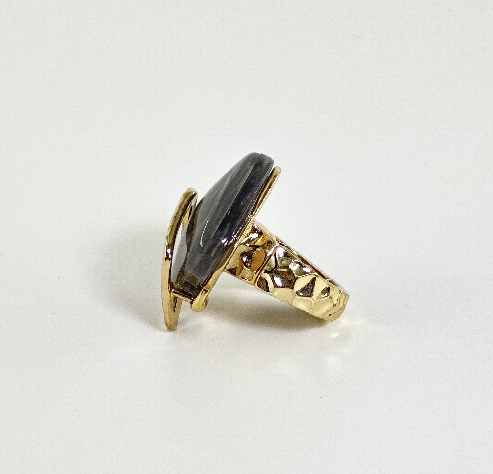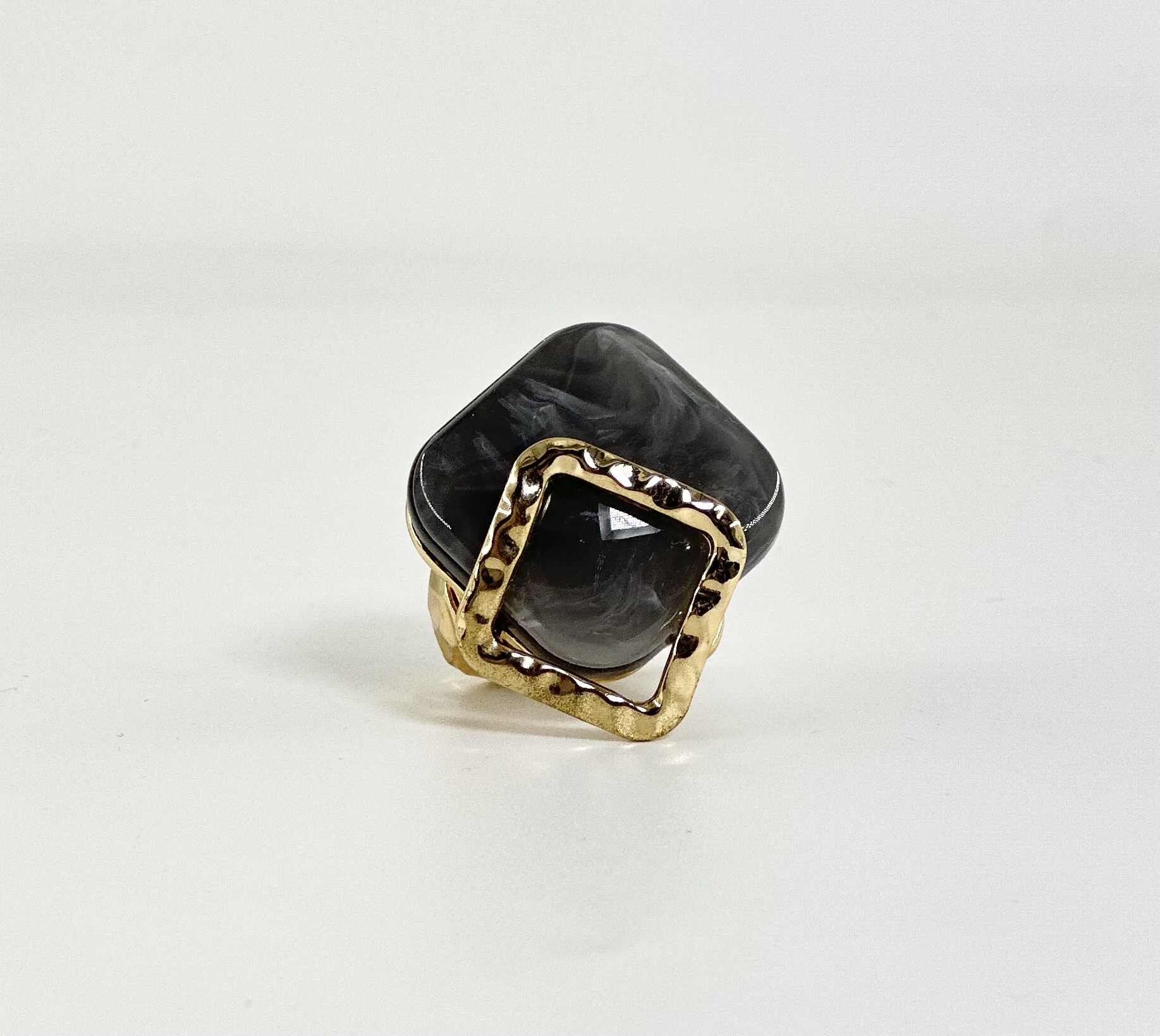 Χρυσό δαχτυλίδι με σατινέ σφυρηλατημένη υφή και κεντρικό στοιχείο μία μεγάλη τετράγωνη πέτρα με στρογγυλεμένες άκρες,