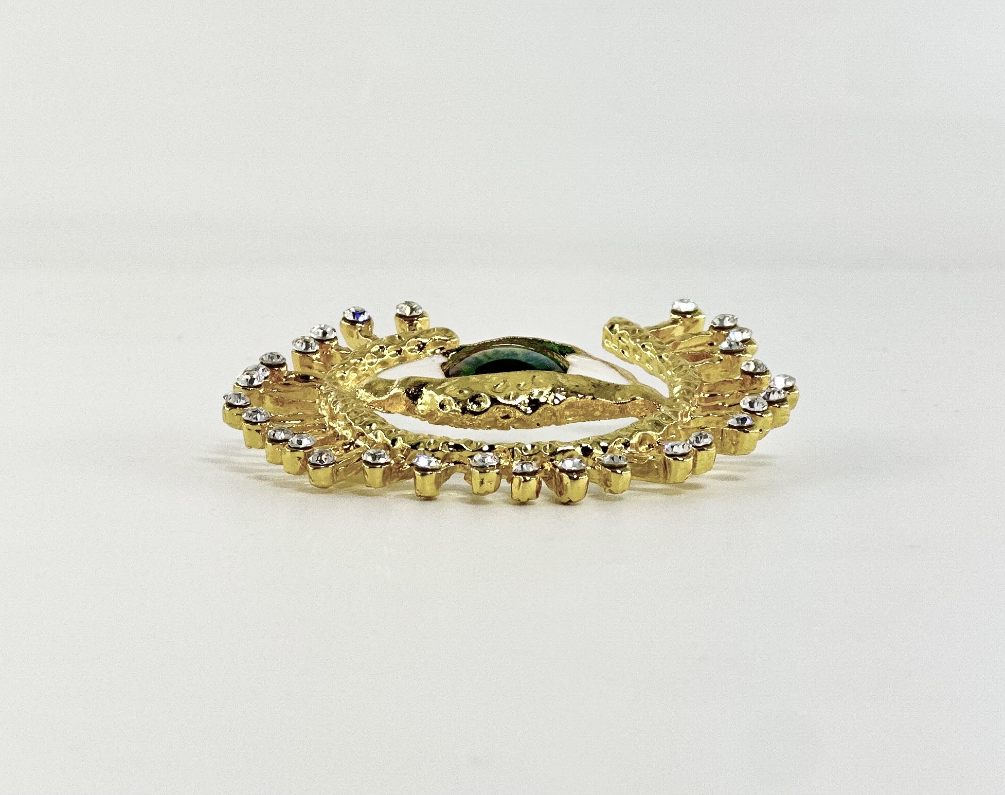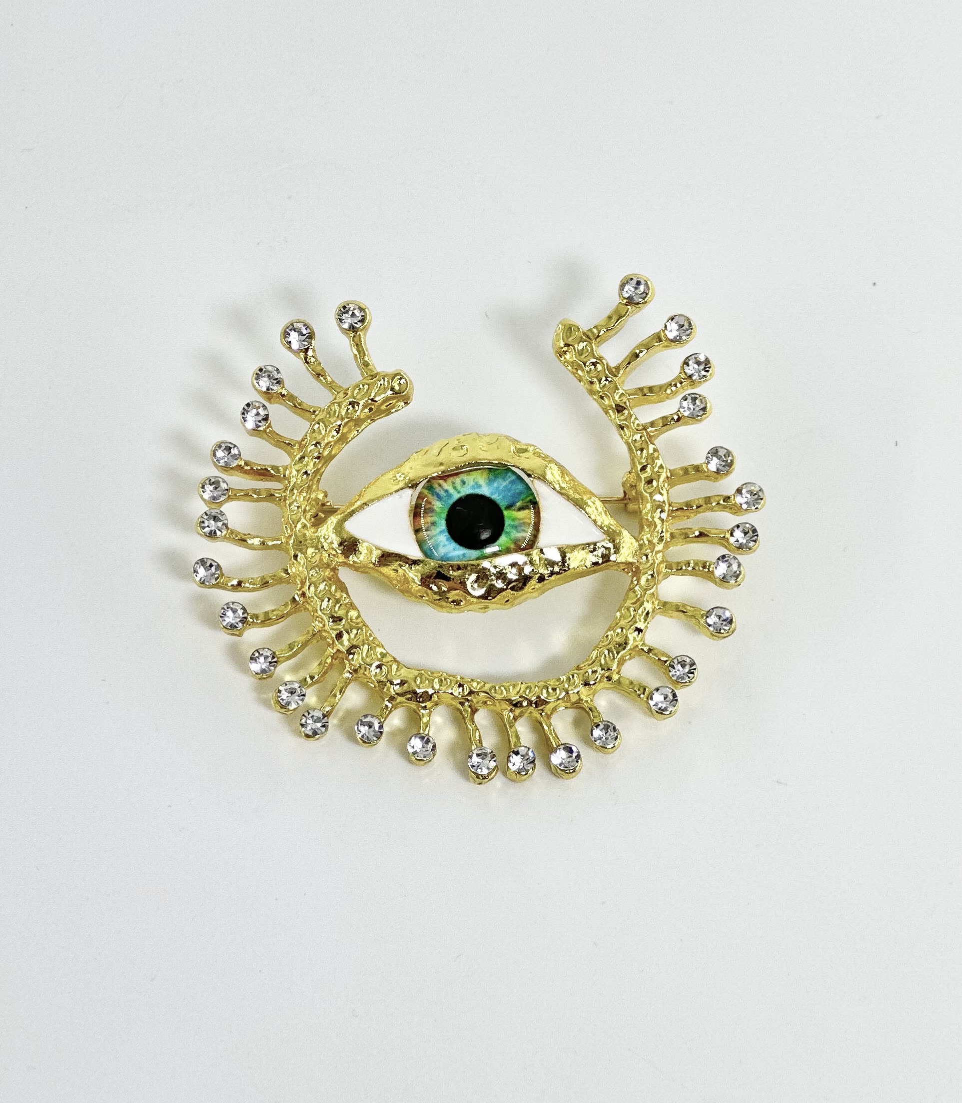 Ατσάλινη χρυσή καρφίτσα που έχει την μορφή ματιού με έντονη ίριδα σε αποχρώσεις γαλαζοπράσινου και μαύρου,