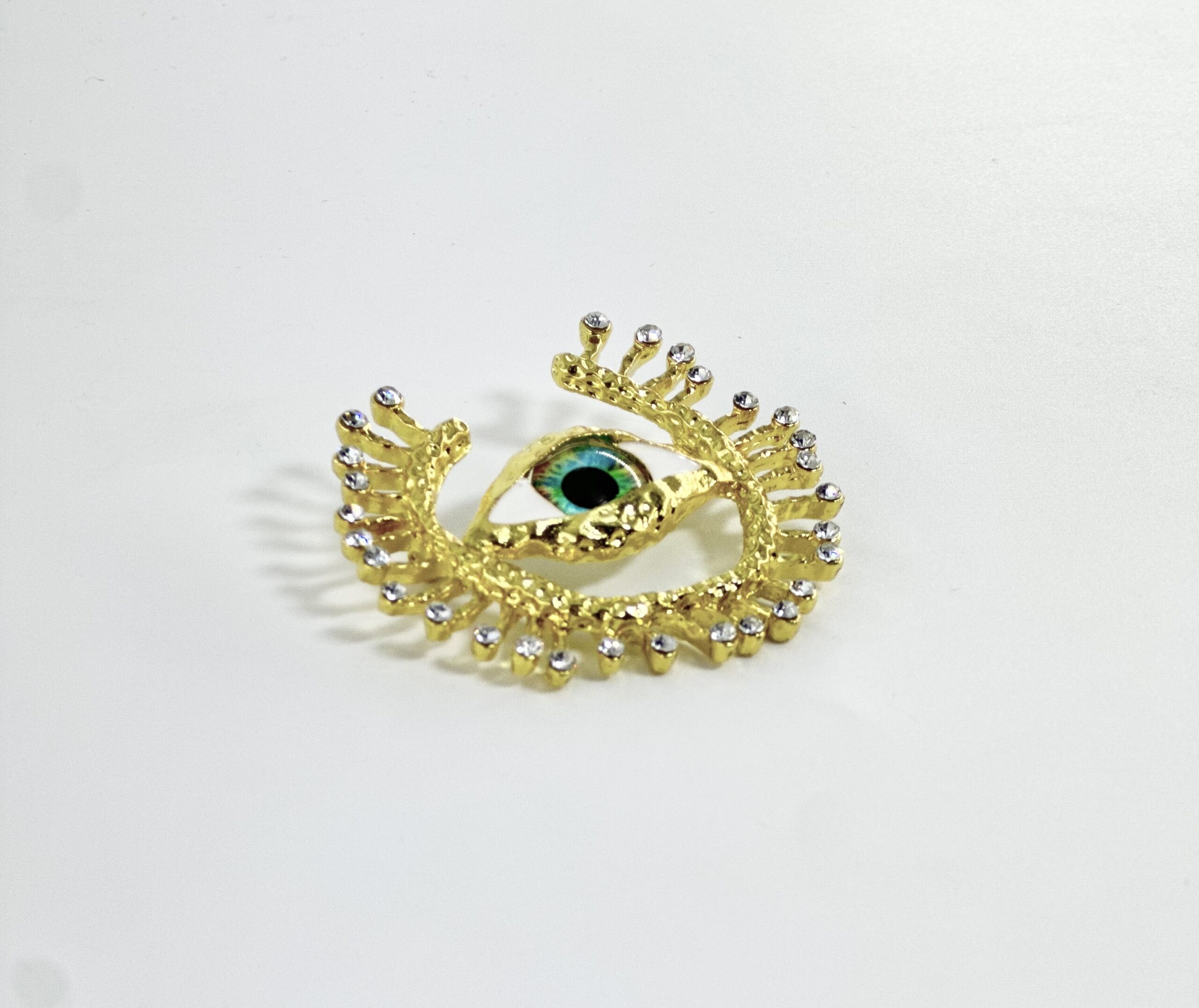 Στο πάνω και το κάτω μέρος του ματιού εκτείνονται χρυσές βλεφαρίδες που η καθεμία είναι στολισμένη με μικρές λαμπερές πέτρες.