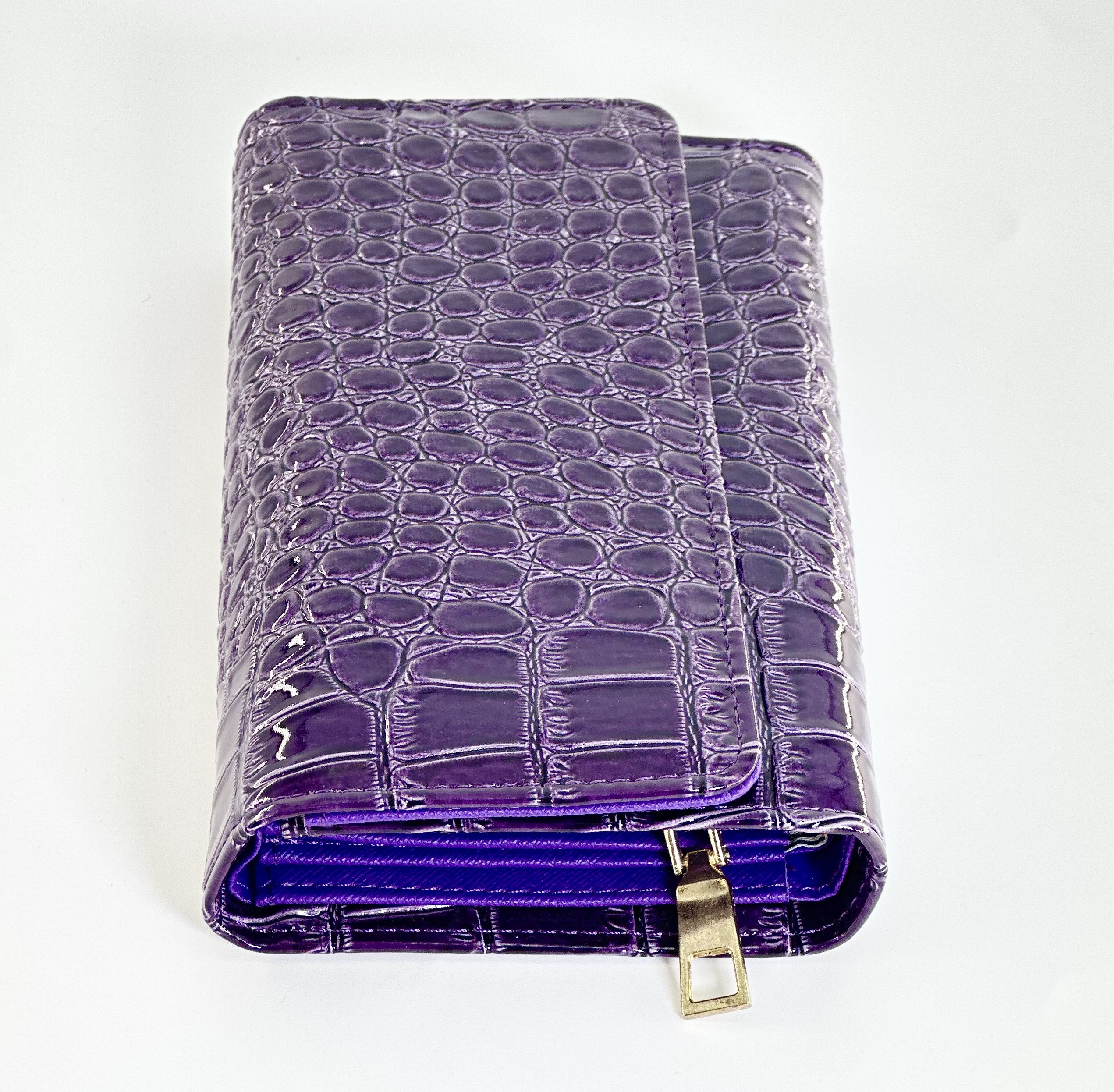 Είναι ορθογώνιο, με ανάγλυφη υφή κροκό (crocodile pattern) σε λαμπερή μωβ απόχρωση — ένα σχέδιο που συνδυάζει την τάση της μόδας με διαχρονική φινέτσα.