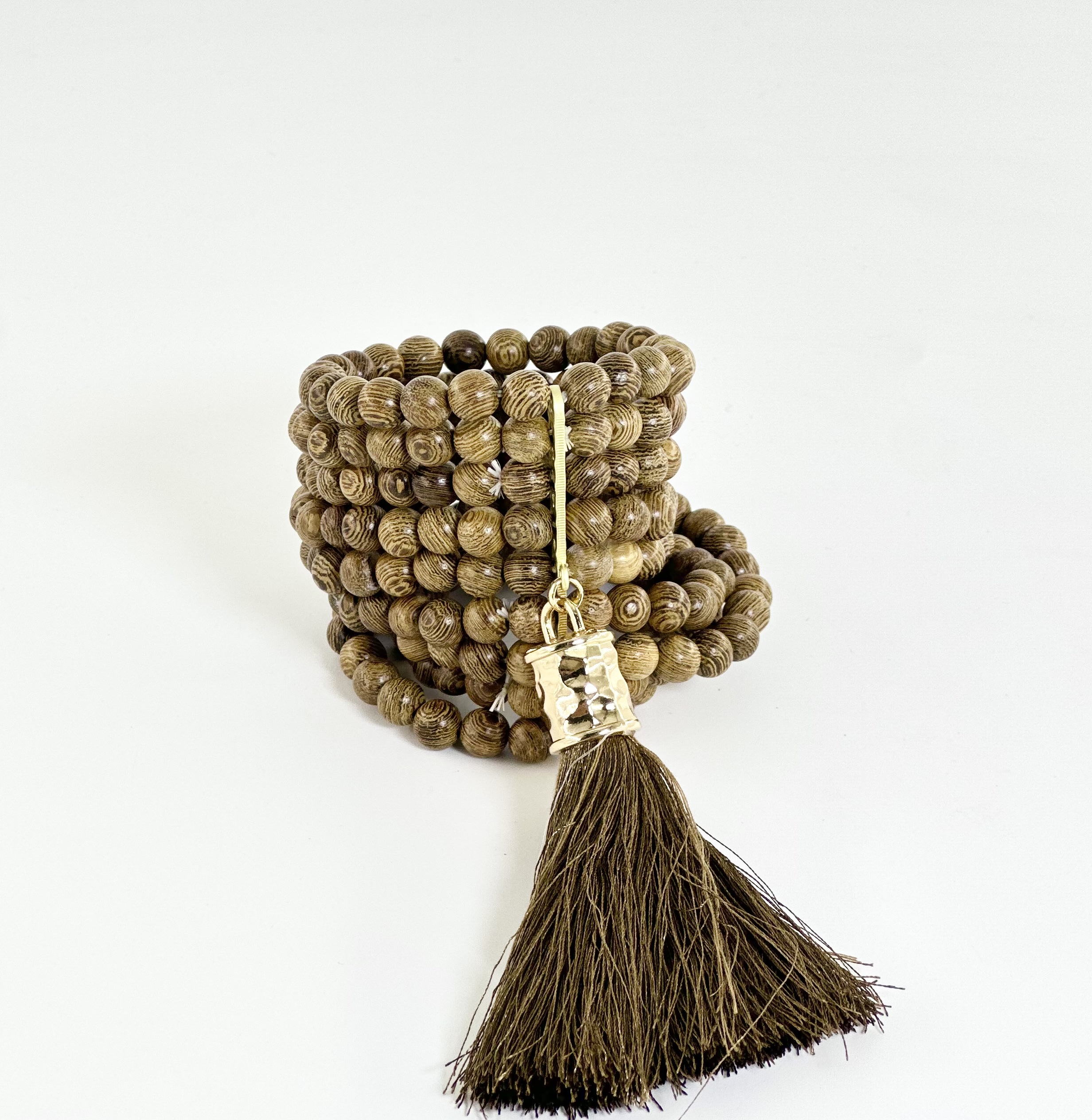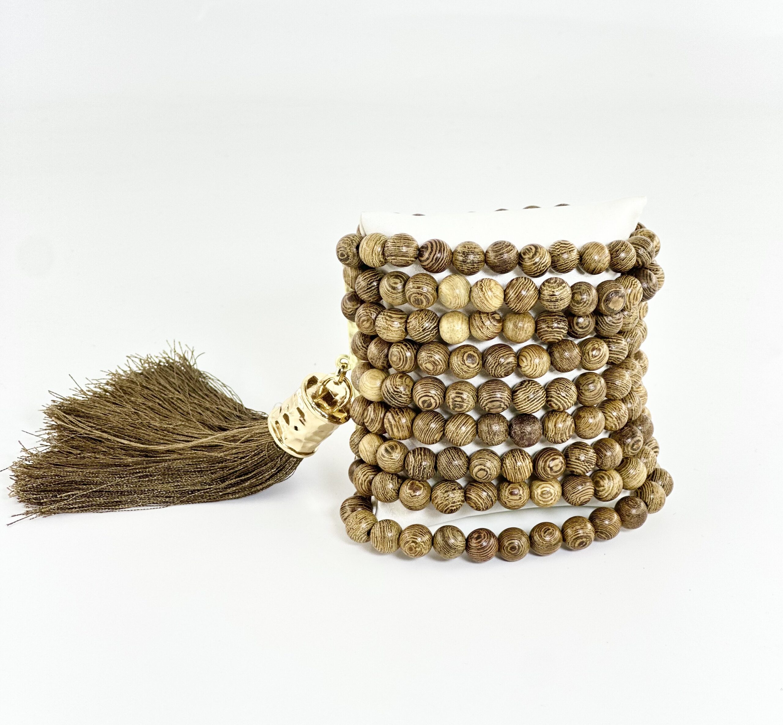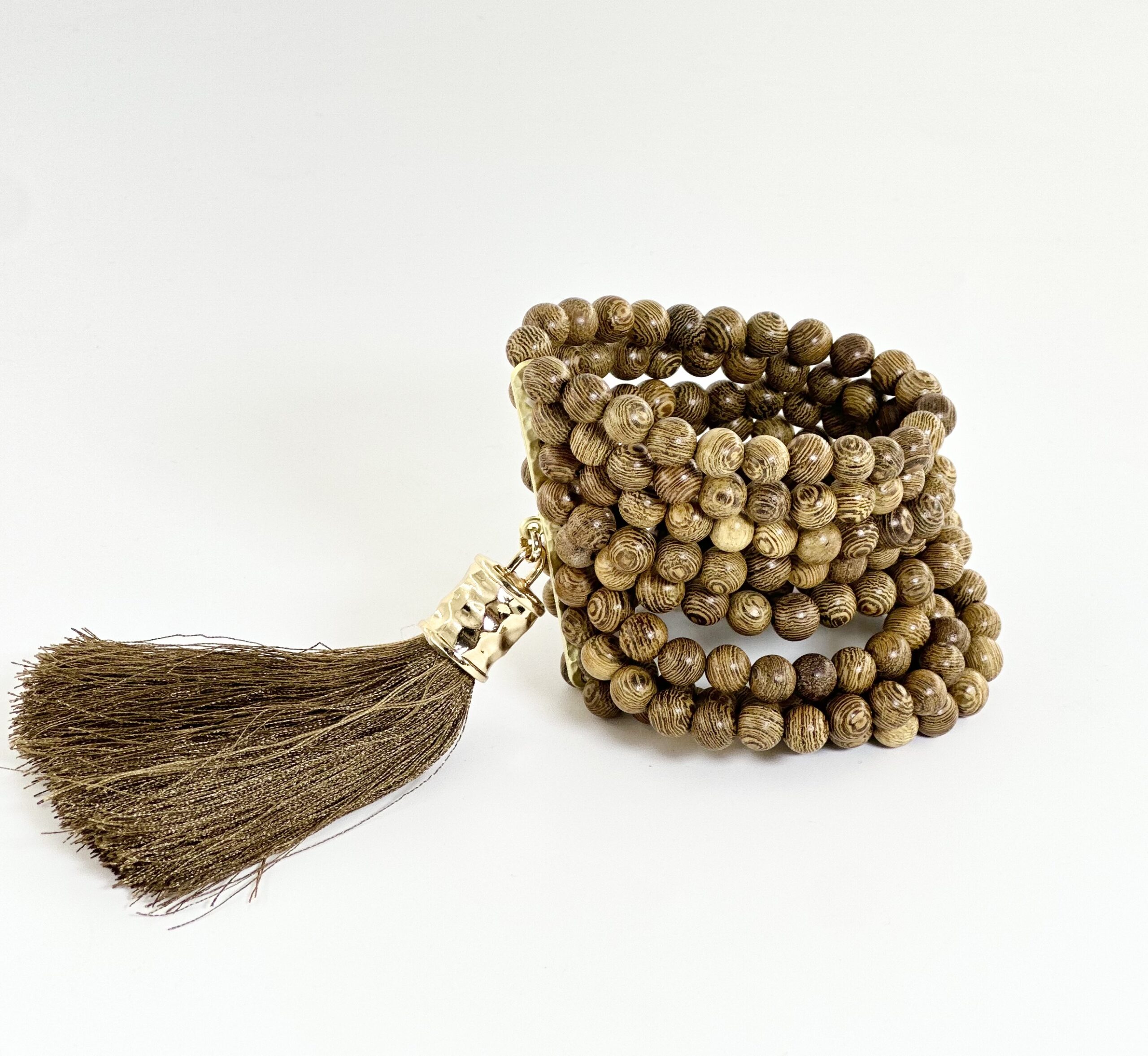 Ένα πολύσειρο ελαστικό βραχιόλι που αποτελείται από πολλές μικρές ξύλινες χάντρες, σε φυσική καφέ απόχρωση.