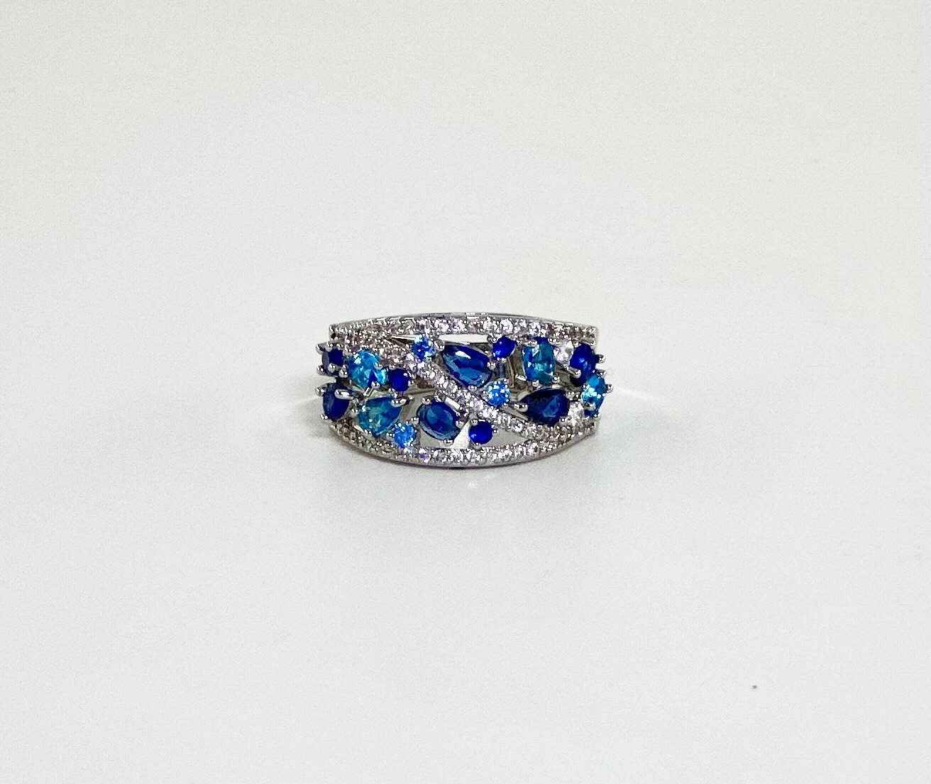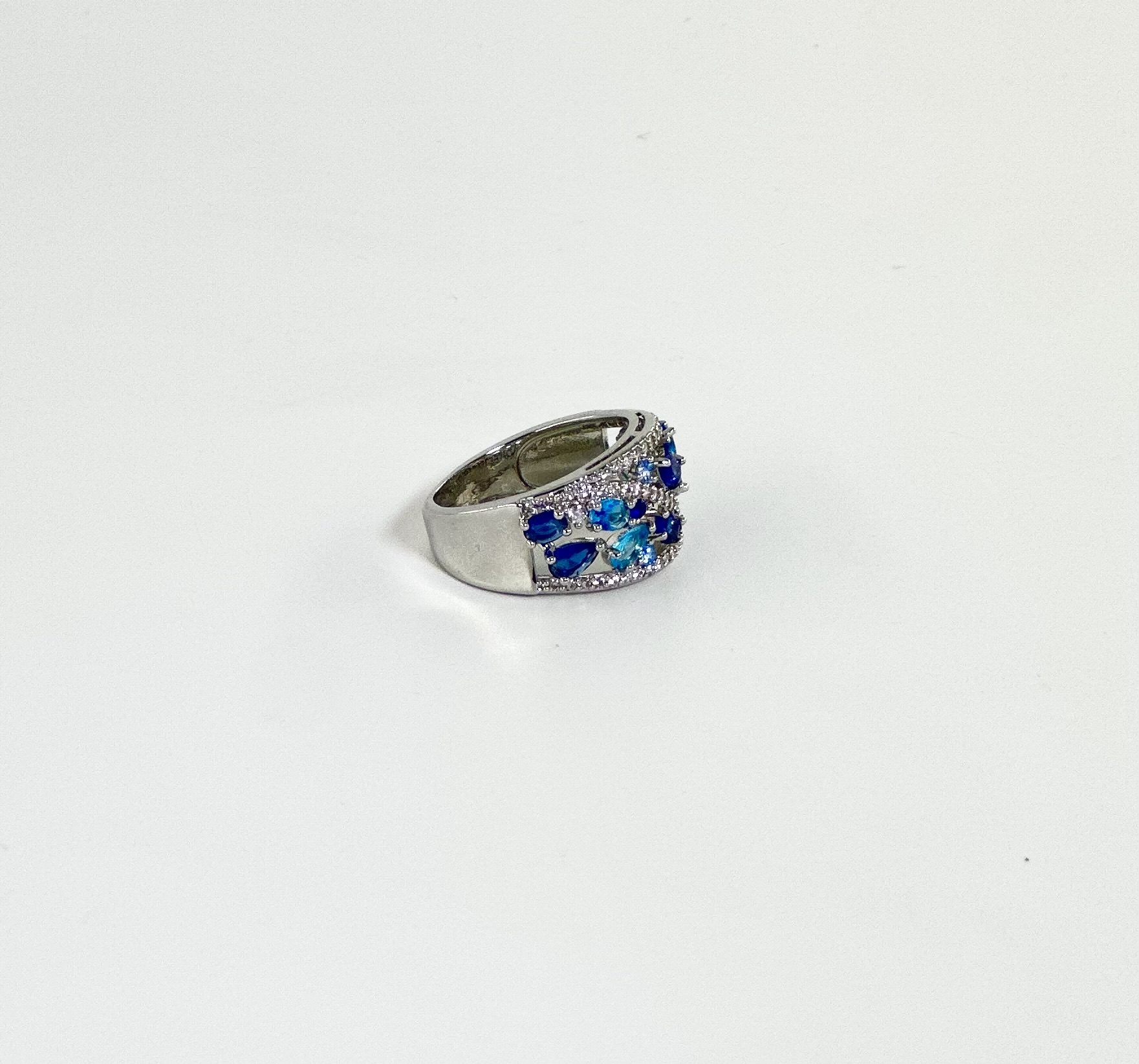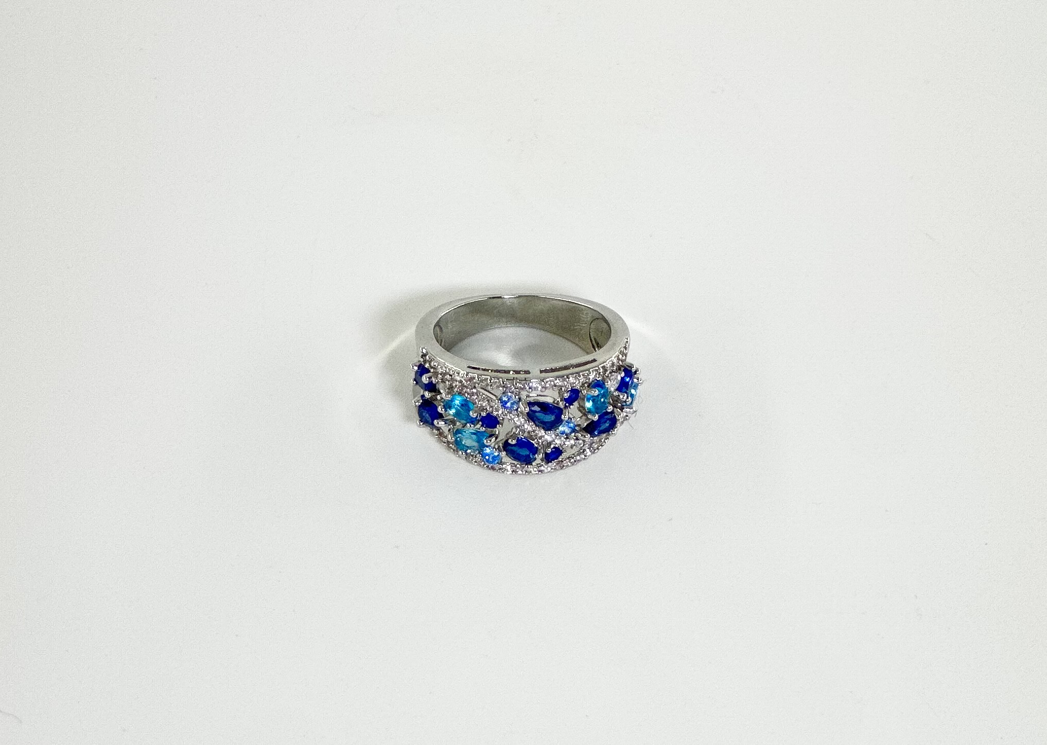 Ατσάλινο ασημί δαχτυλίδι με επιμελημένο φινίρισμα και στρας στις αποχρώσεις του μπλε και του γαλάζιου.